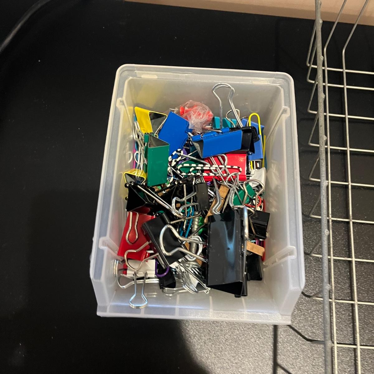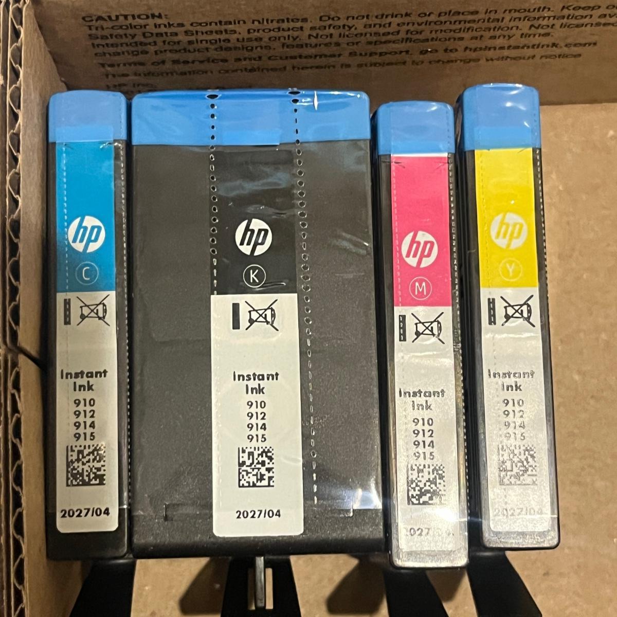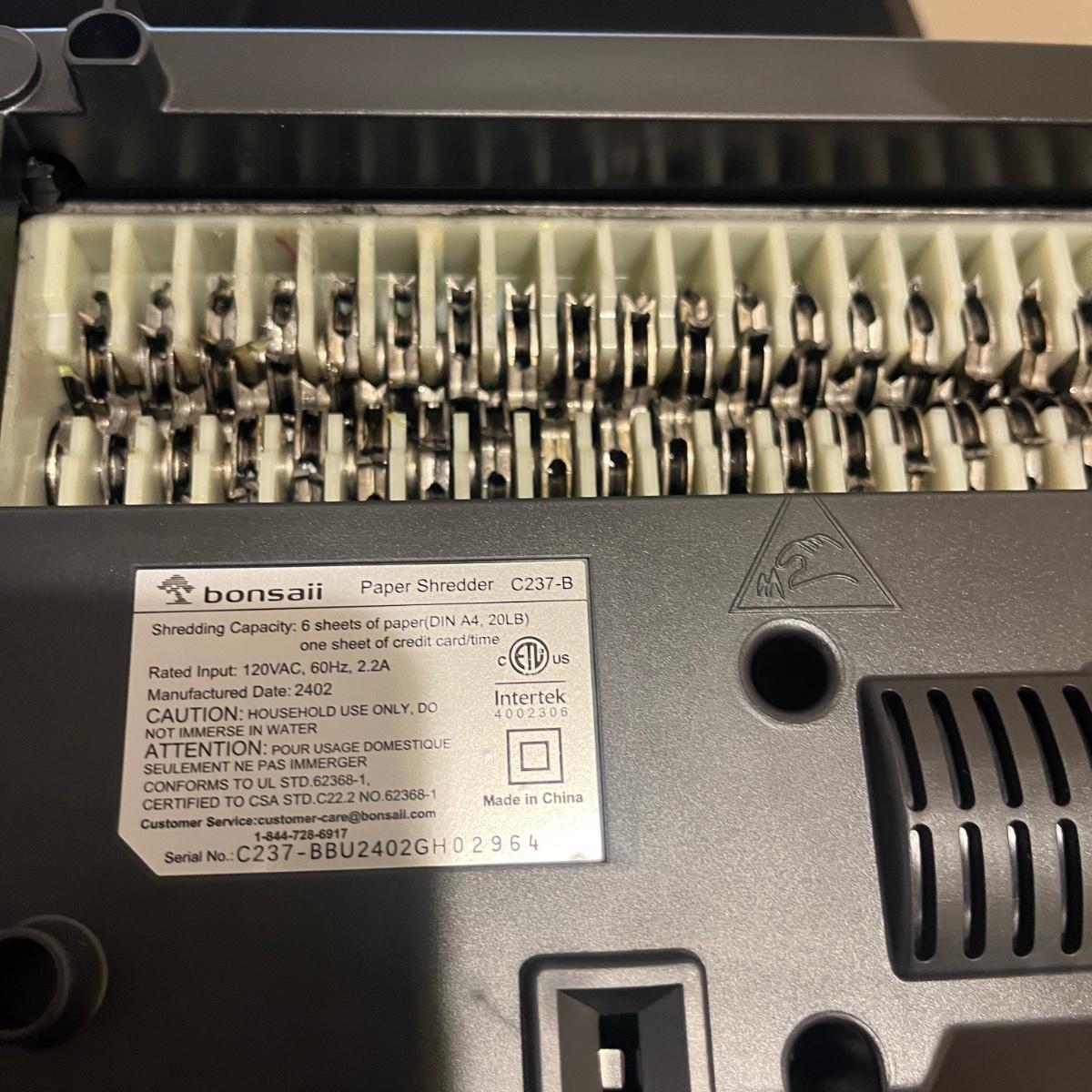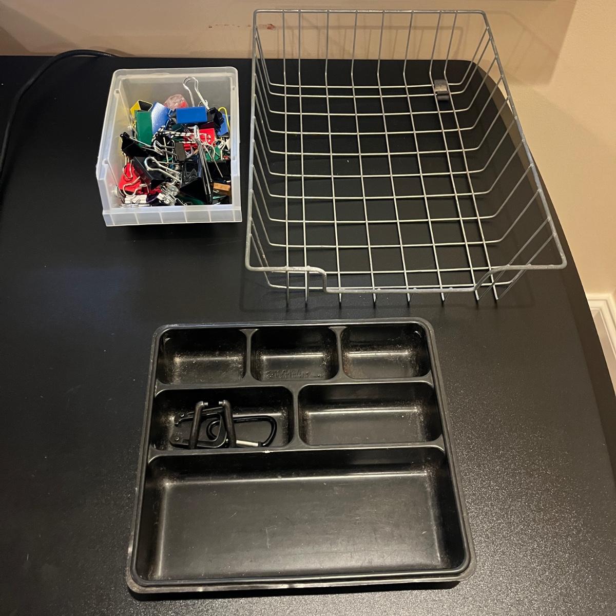 Lot includes a Bonsaii shredder, HP Officejet Pro 8028E printer with ink and paper, Studio Designs clamp light, plastic bins, pens, envelopes, file holders, rulers and more. Printer measures 18” x 20” x 10”H.