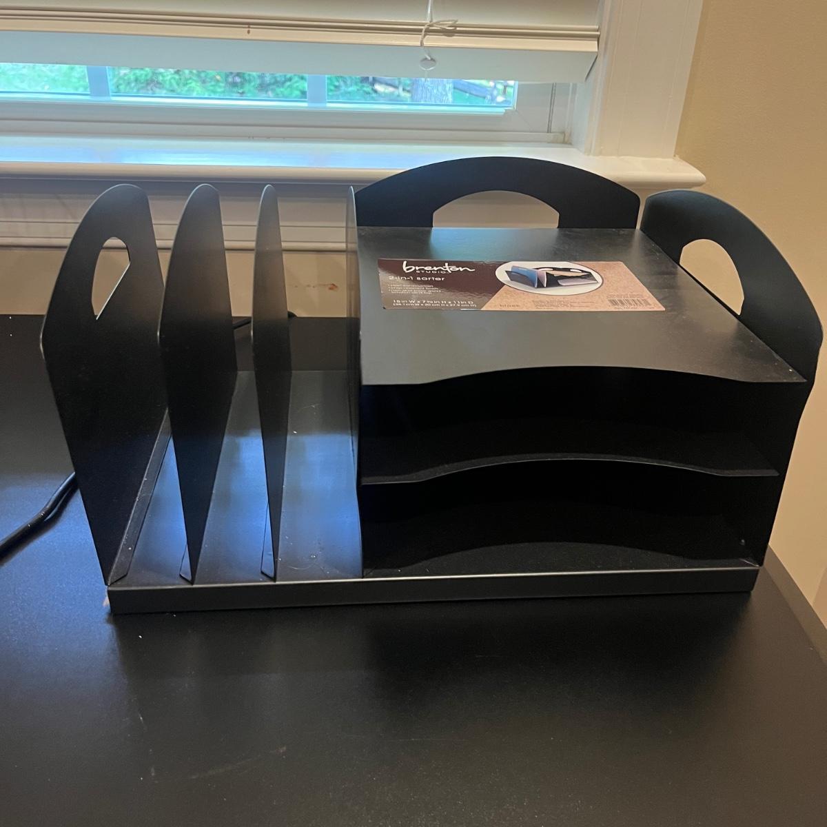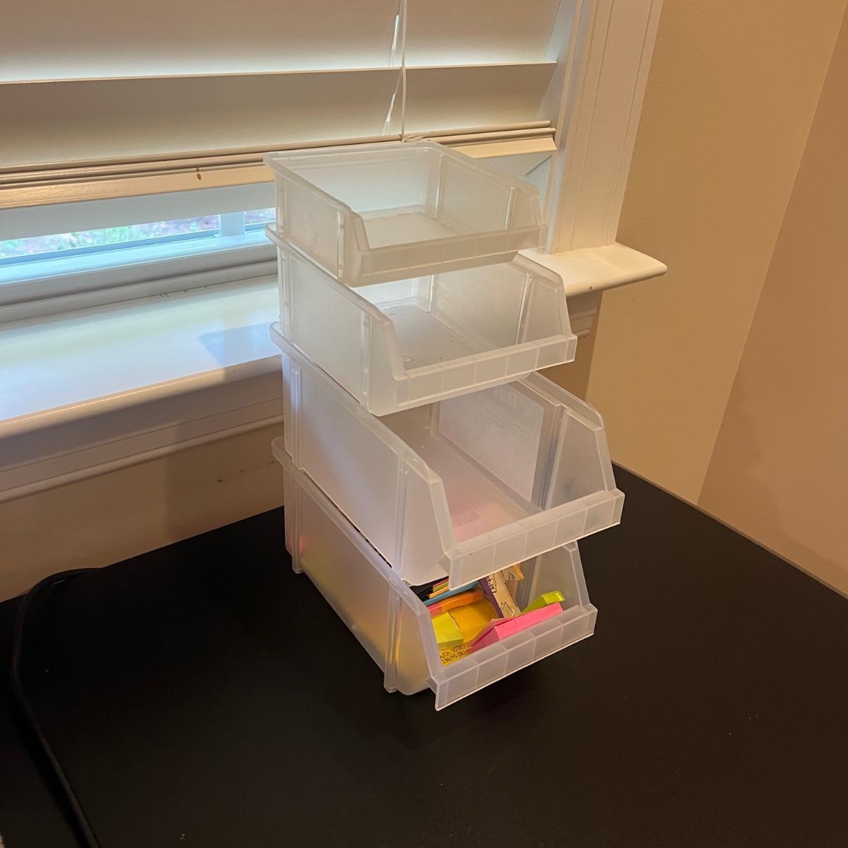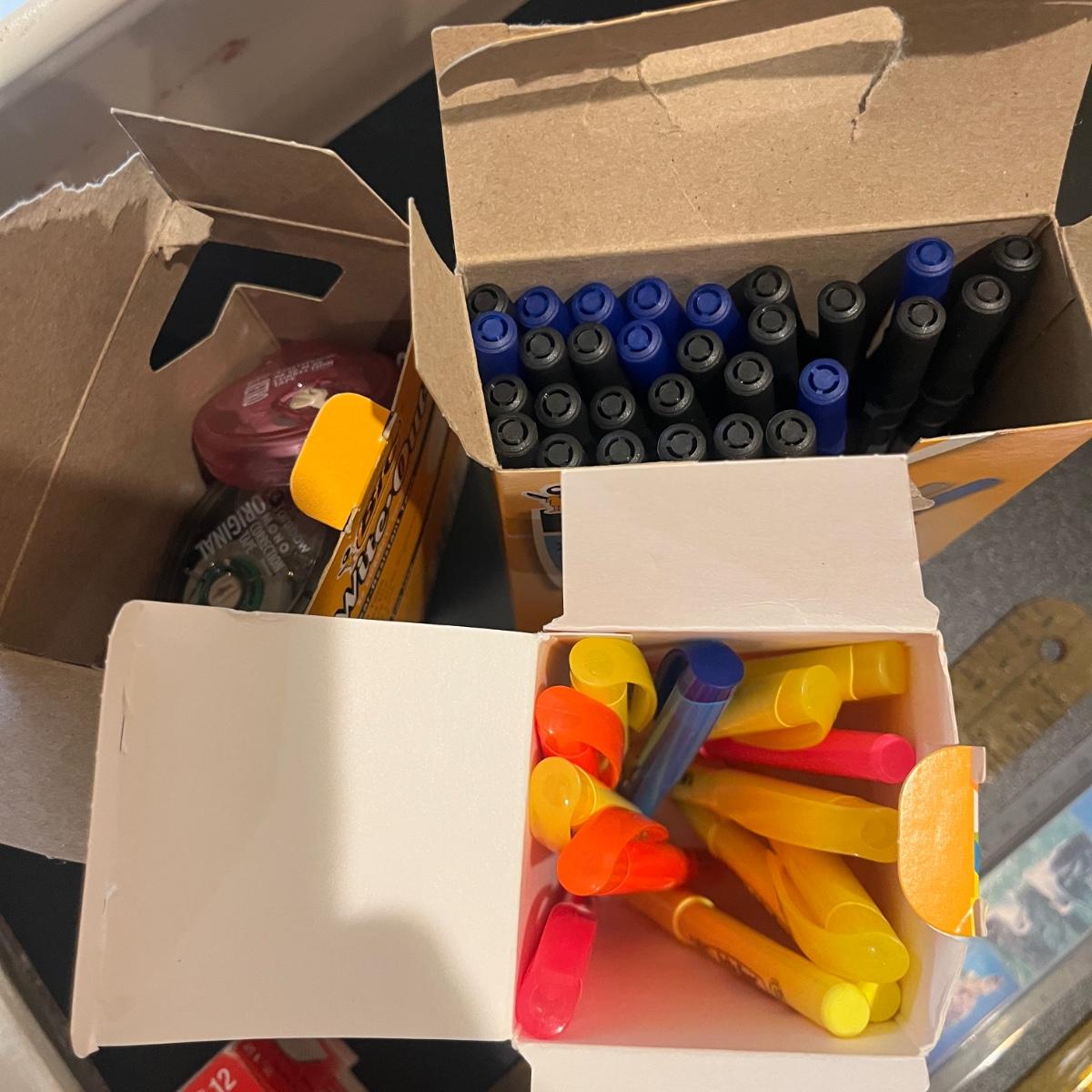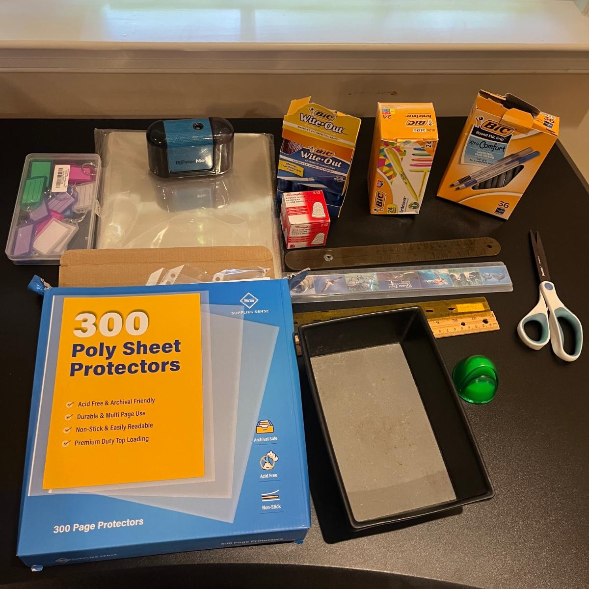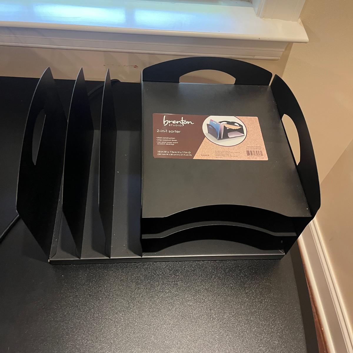 Lot includes a Bonsaii shredder, HP Officejet Pro 8028E printer with ink and paper, Studio Designs clamp light, plastic bins, pens, envelopes, file holders, rulers and more. Printer measures 18” x 20” x 10”H.
