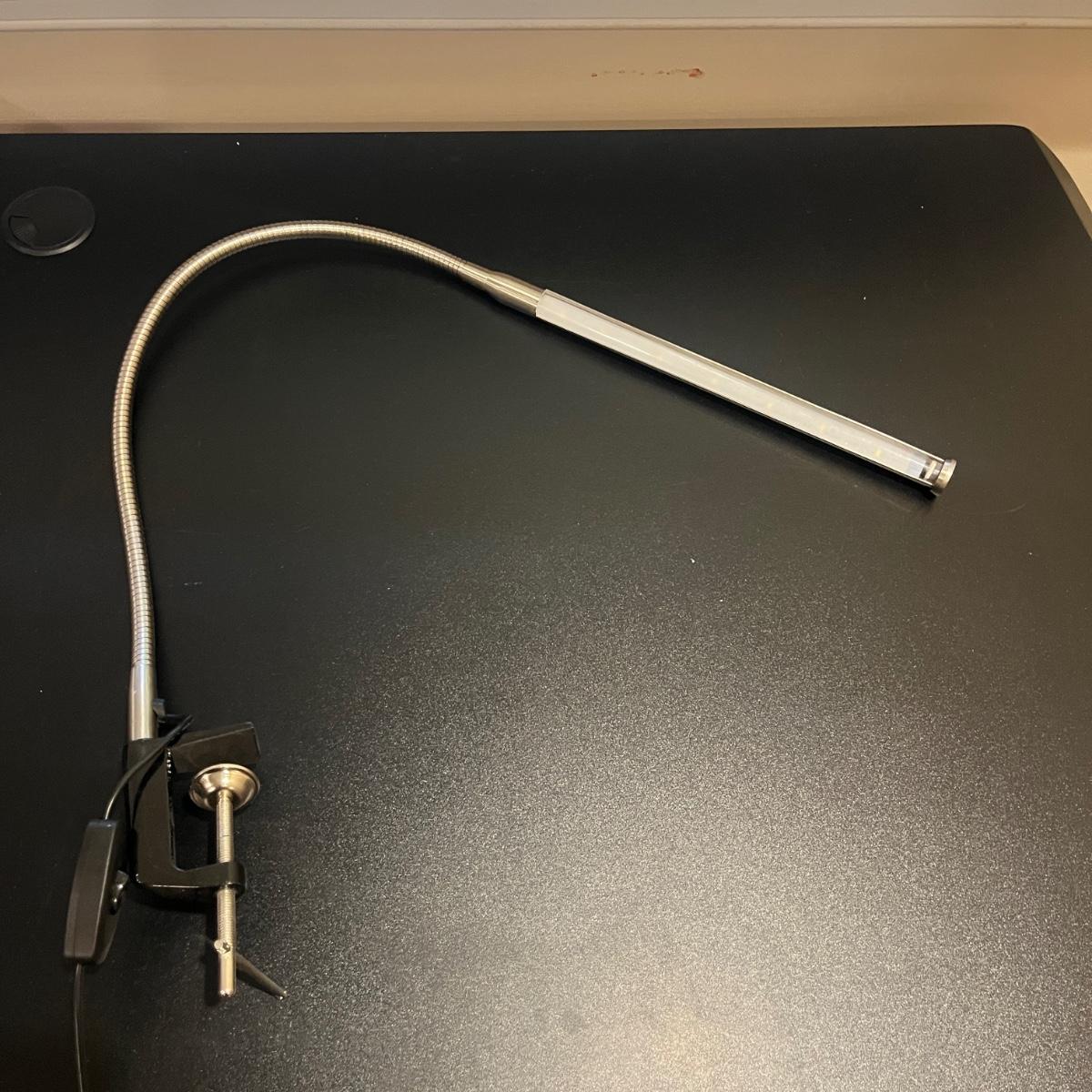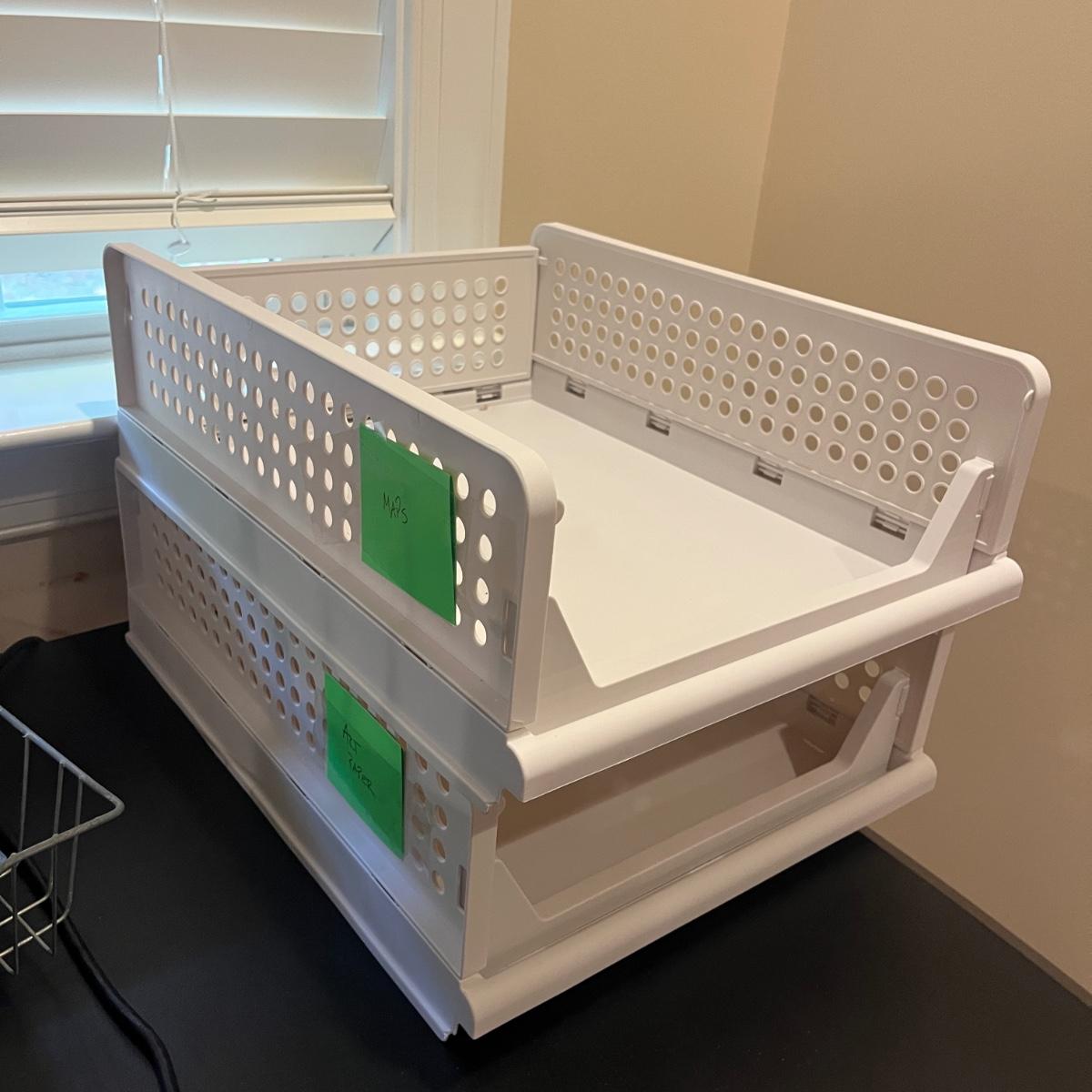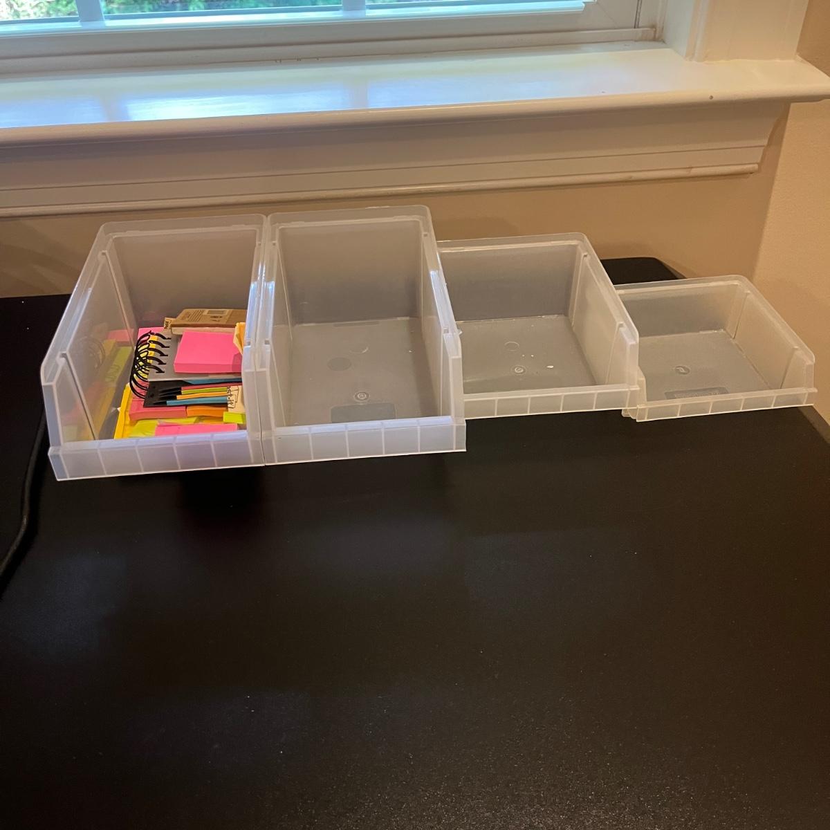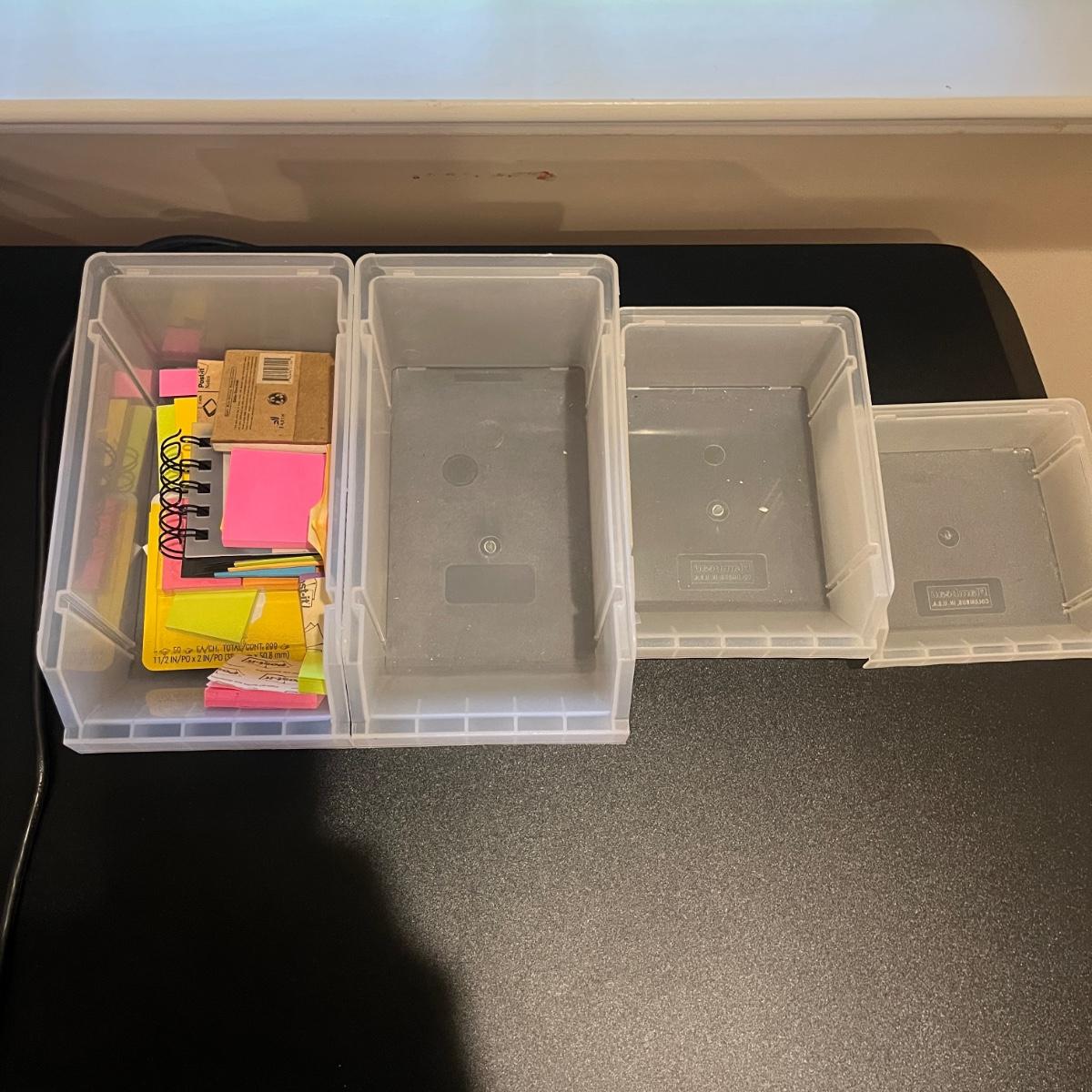 Lot includes a Bonsaii shredder, HP Officejet Pro 8028E printer with ink and paper, Studio Designs clamp light, plastic bins, pens, envelopes, file holders, rulers and more. Printer measures 18” x 20” x 10”H.