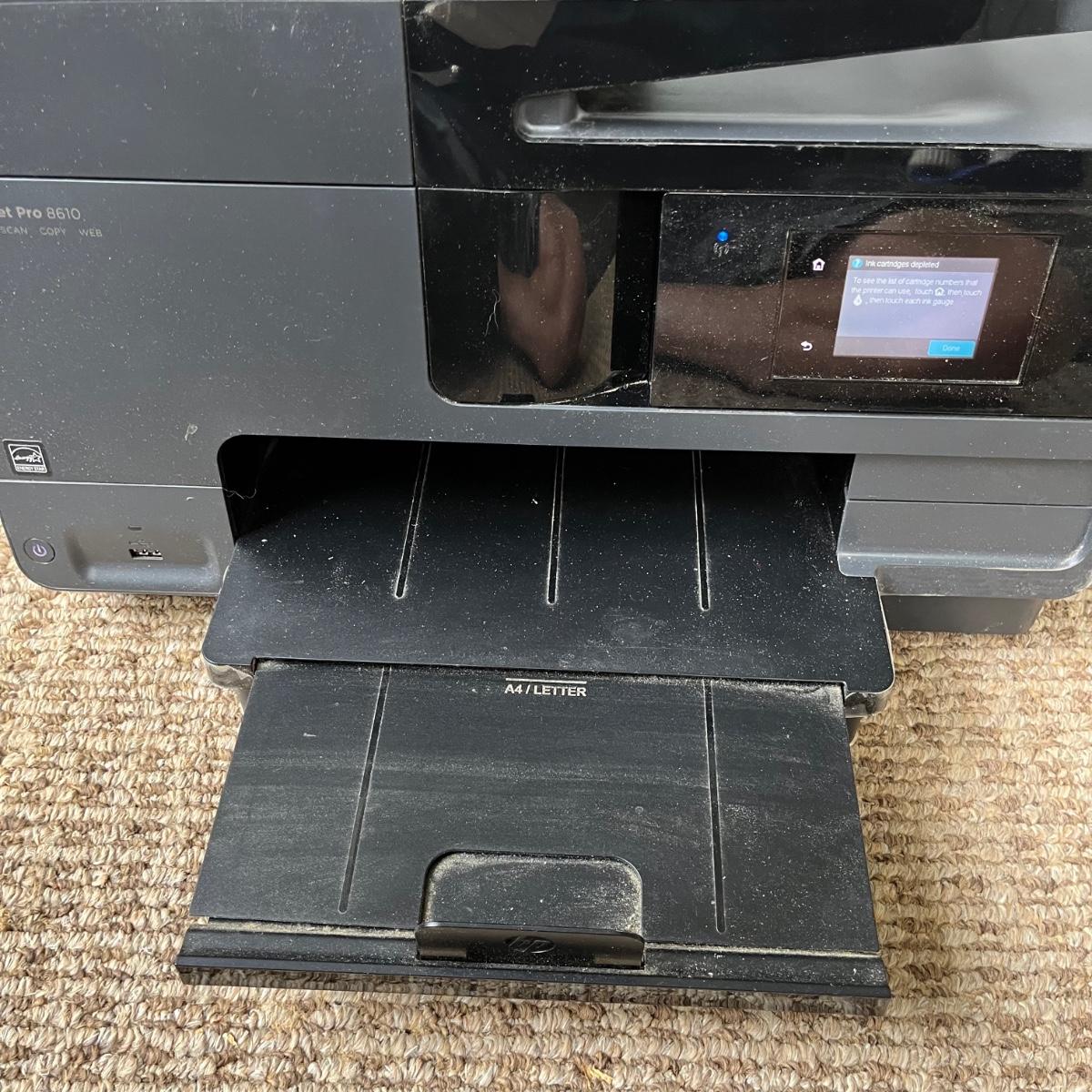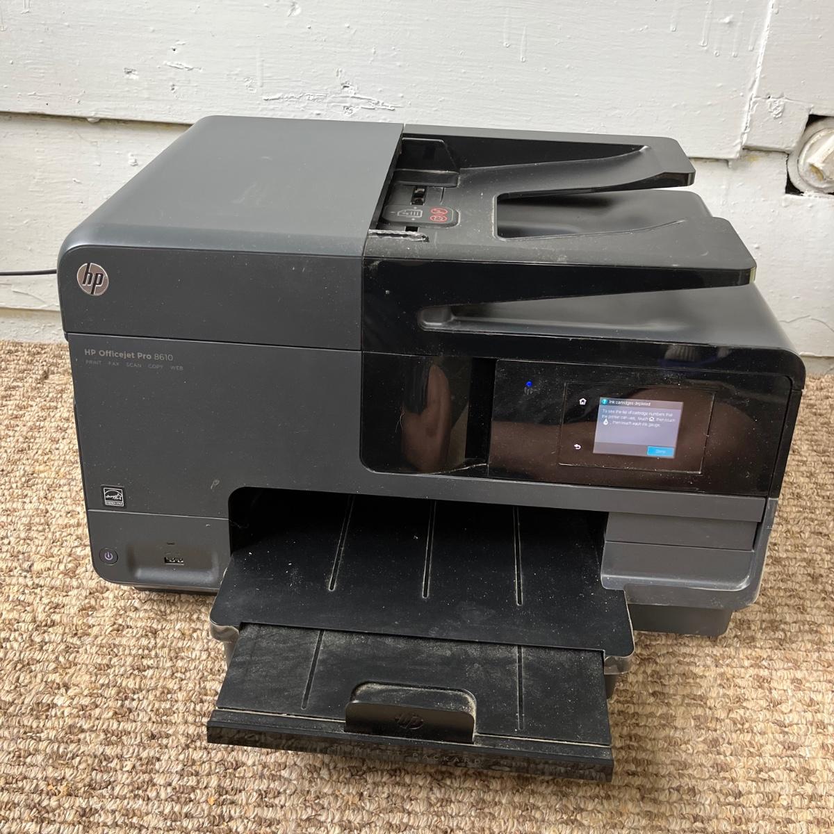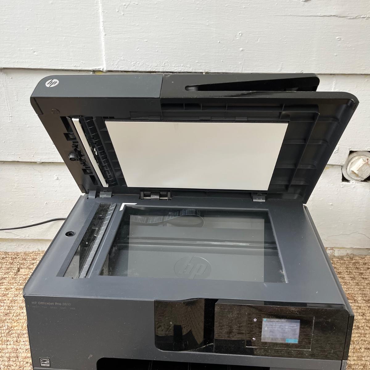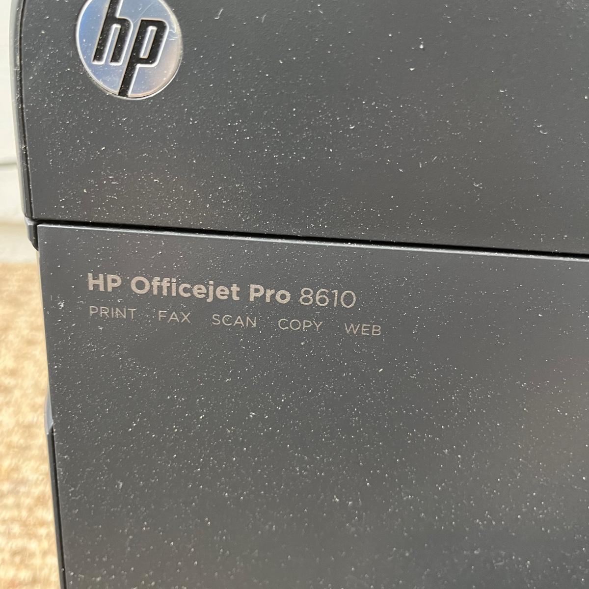 Lot includes a HP Officejet Pro 8610 all in one printer. Printer powered on when tested. Printer measures 18” x 19.5” x 12”.