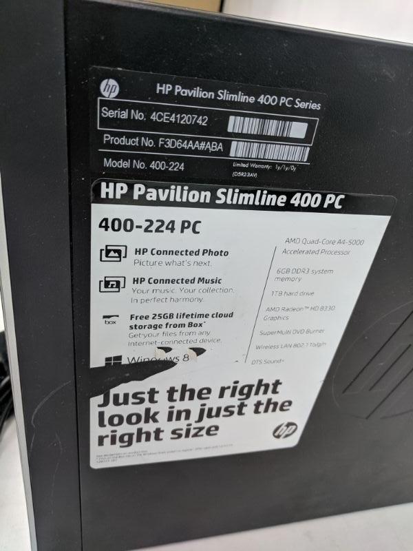 HP Pavilion SlimLine 400 PC: AMD A4-5000 1.5 GHZ 6gb ram Win 8.1 ITB MOD Wireless Computer, Fresh Install, Ready to Go. Tower ONLY