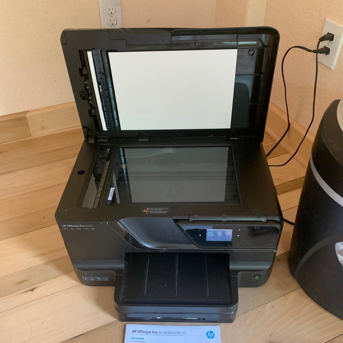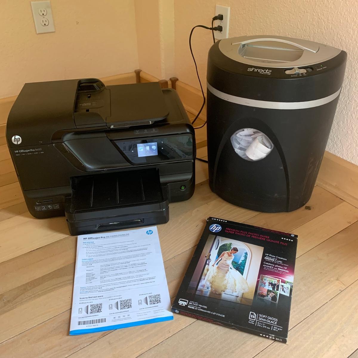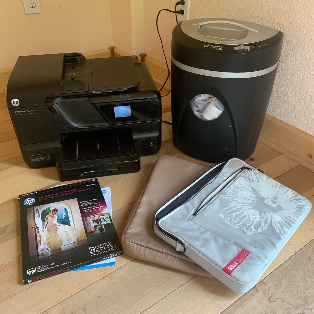 Lot includes HP Officejet Pro 8600 printer, two laptop cases for 17.5” laptop, Shredz FHC511M paper shredder, and HP Premium Plus Photo Paper. Printer measures, 19” x 15” x 12”H. Both paper shredder and printer power on, please see photos for more details. Shipping available.