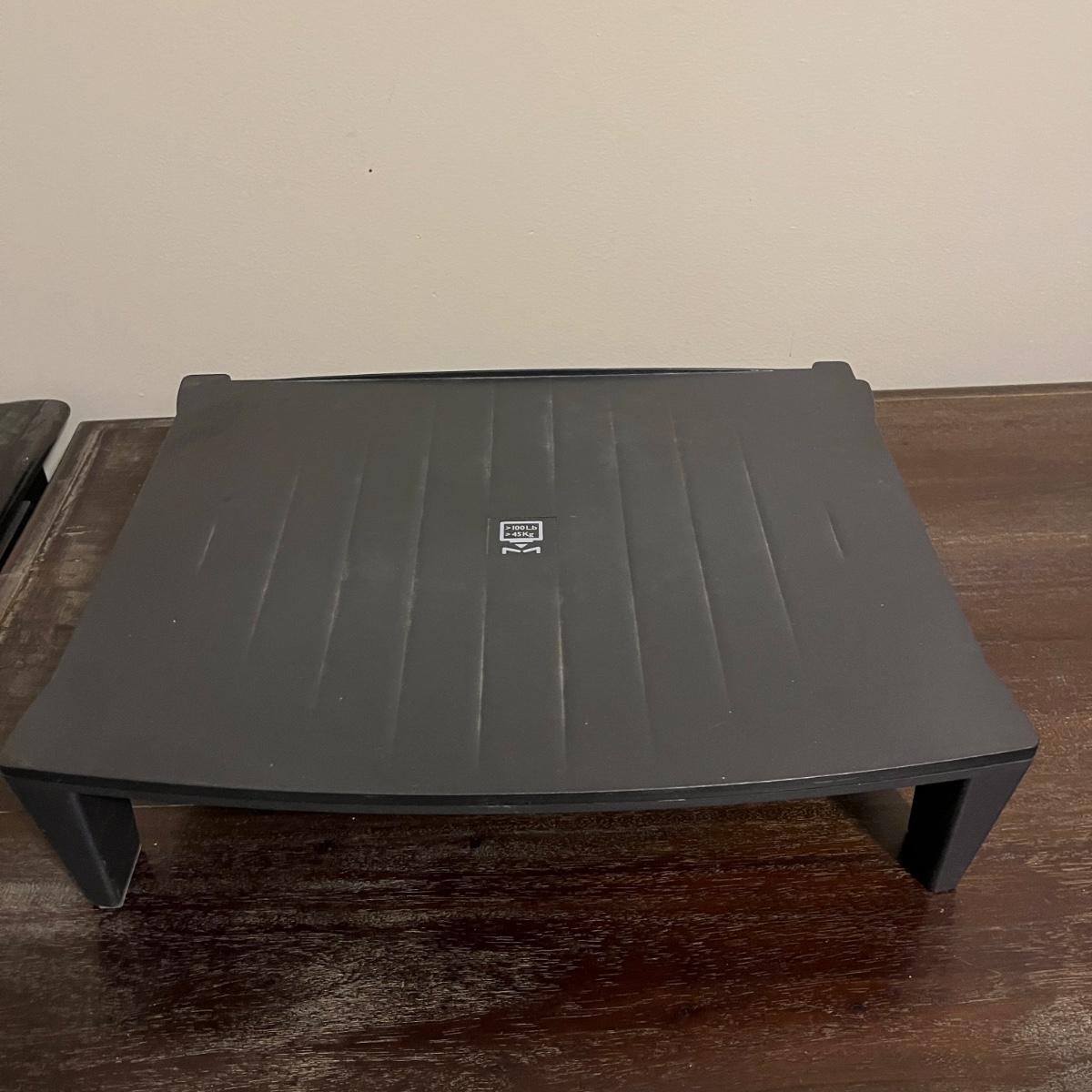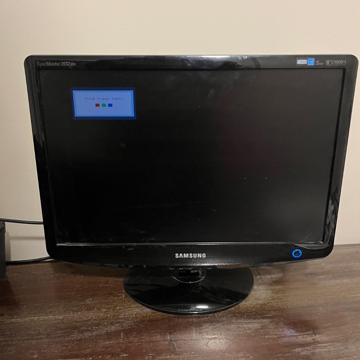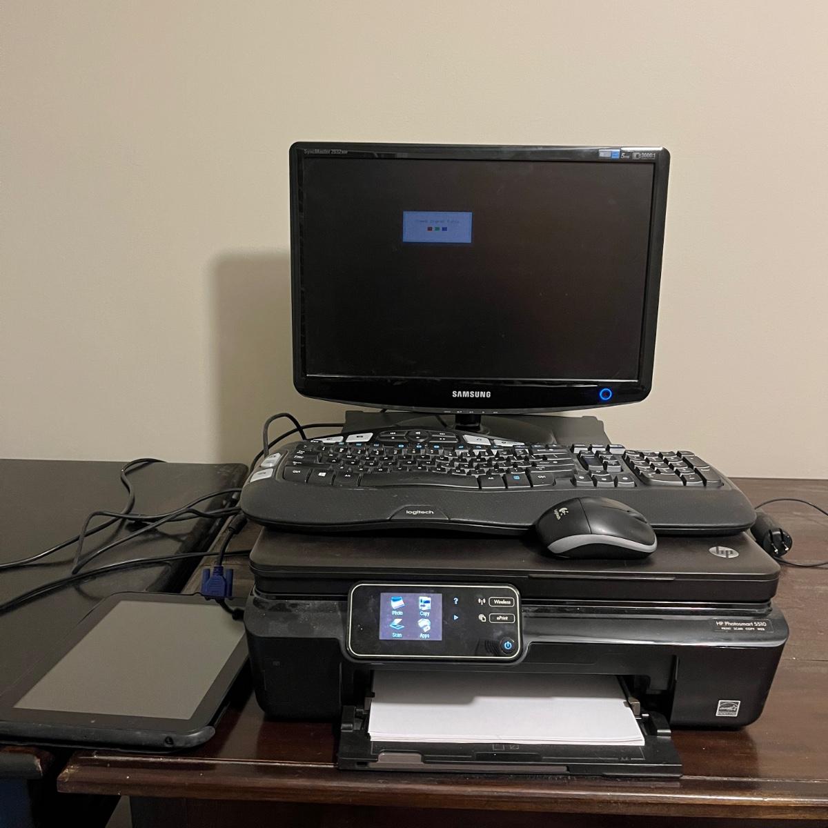 Lot includes a HP Photosmart printer, HP 10” tablet, Samsung 20” monitor, Logitech wireless keyboard and mouse and a monitor stand. Monitor, printer, mouse and tablet all powered on when plugged in, keyboard has no batteries.