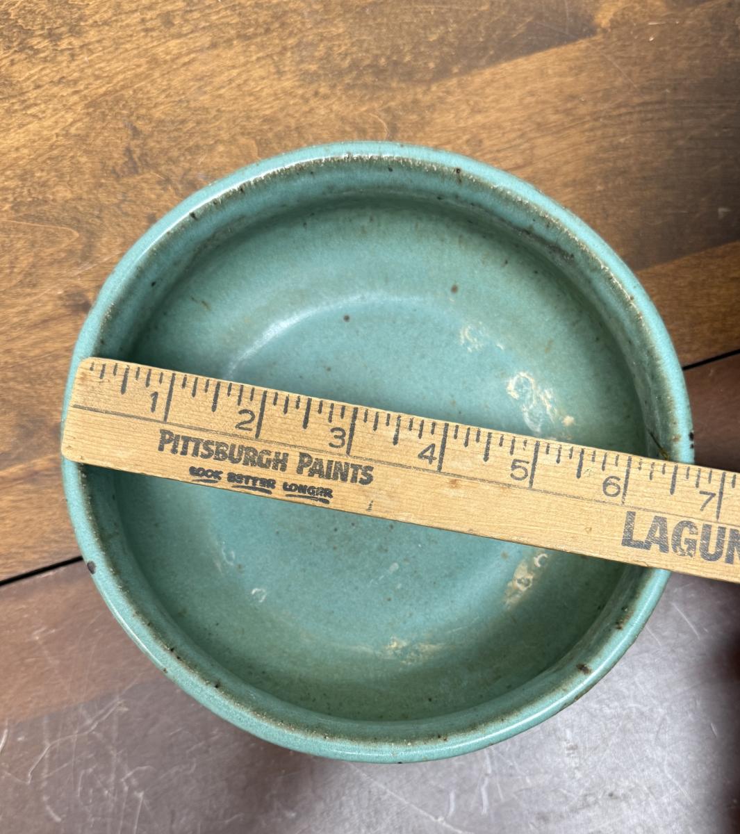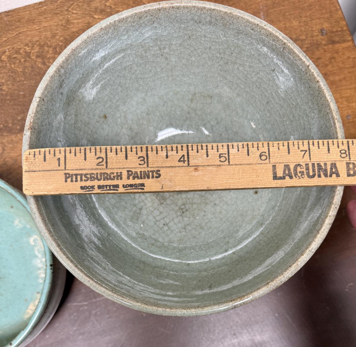 2 bowls: 1st bowl is Thai or Chinese-inspired design. 6" tall and 8" diameter pedestal bowl, glazed with green, aqua, gray and blue. Intricate design on the outside (see photos), some crazing inside the bowl. 2nd bowl is 3" tall and approx. 6.75" diameter, green-blue glaze on outer rim and inside. Pale blue-gray on majority of outside of bowl. No visible crazing.