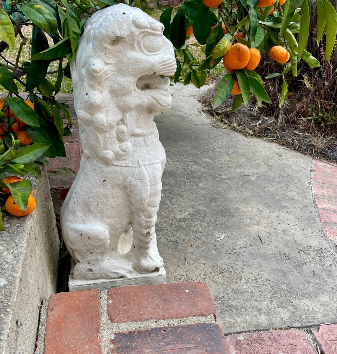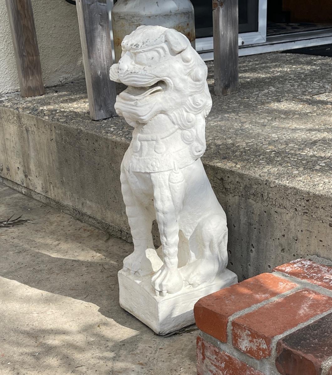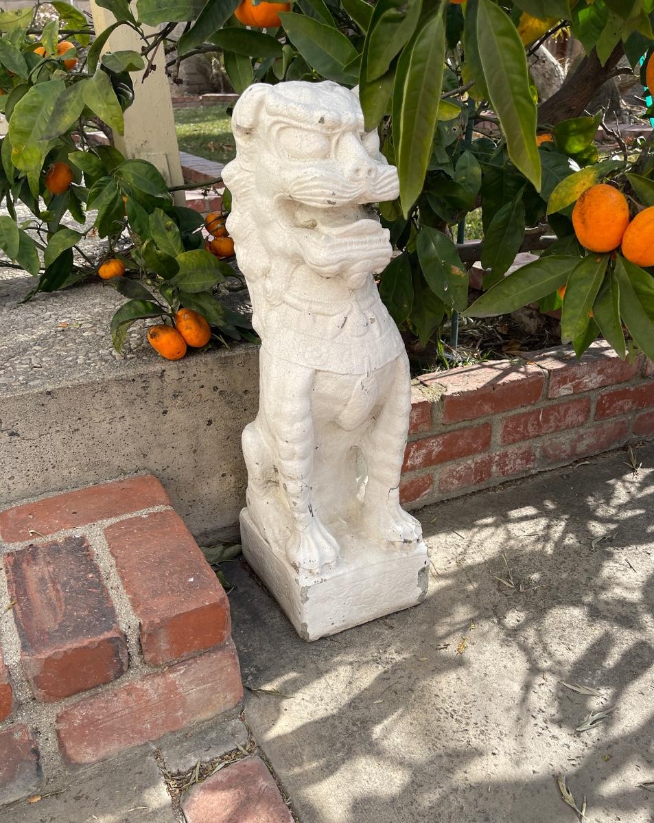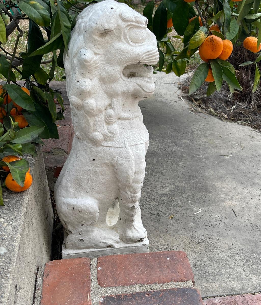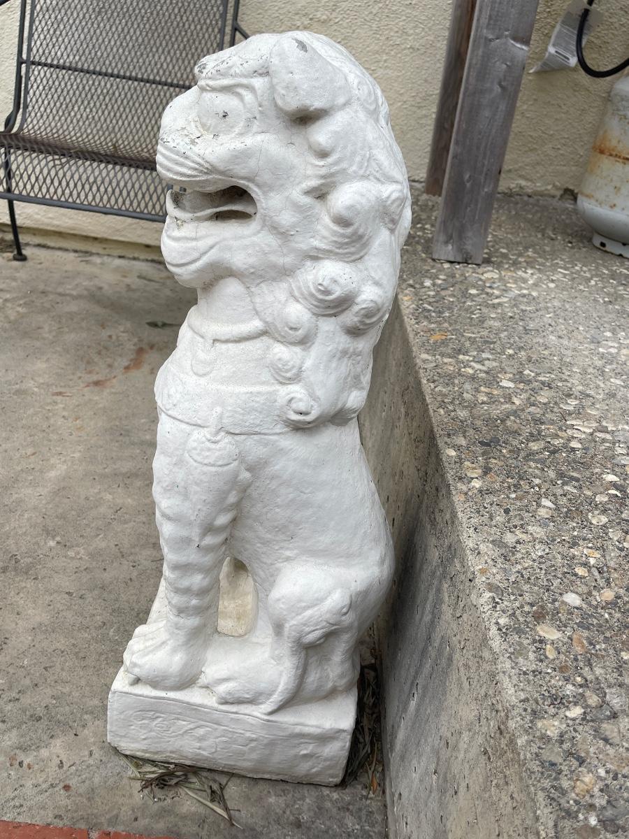 2 identical Chinese Lion Garden Statues, approx. 26" tall, made from cast concrete, painted white. Good condition.