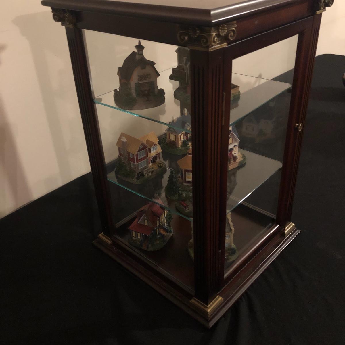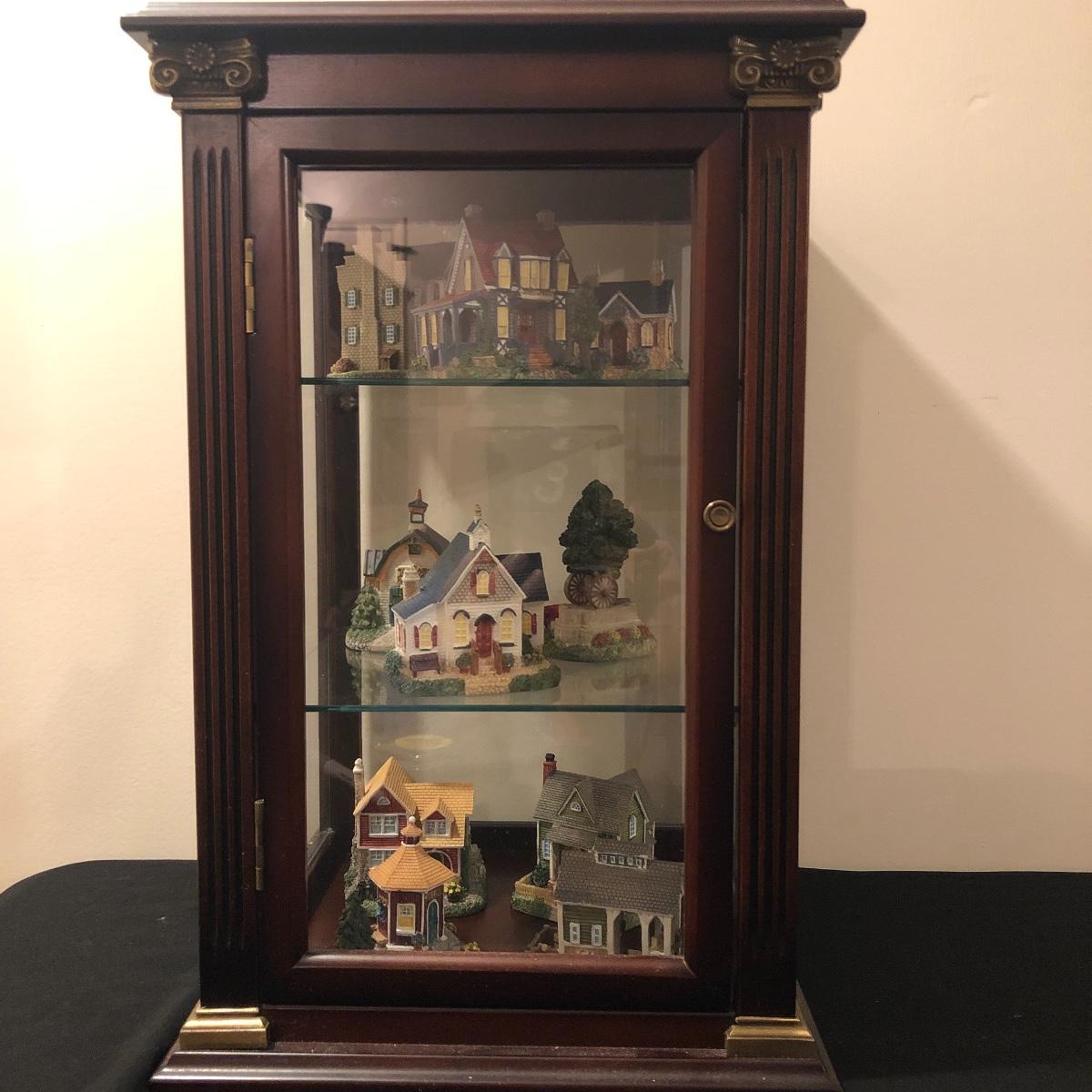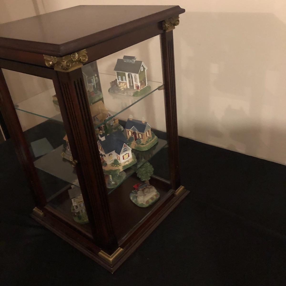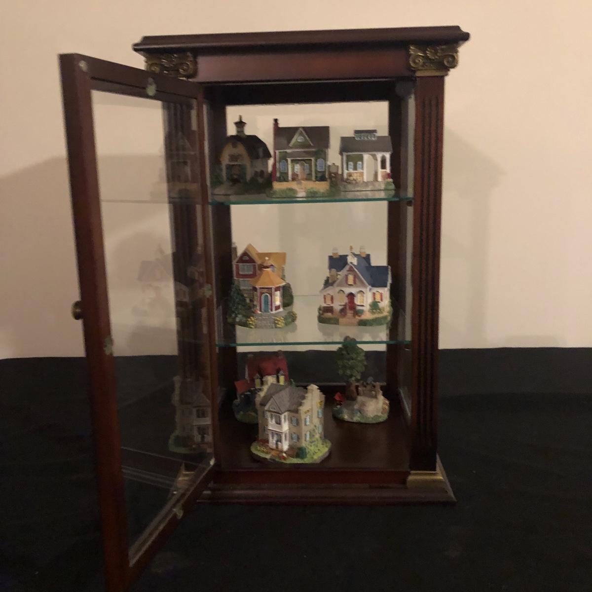 Figurines stand 2.5” - 3.5” tall and there are ten pieces. Each piece is made from International Resources, LLC and is HSE. The display case is wood and glass and framed in Roman columns. It measures 10.5” x 10.5” x 16.5”. Shipping Available.