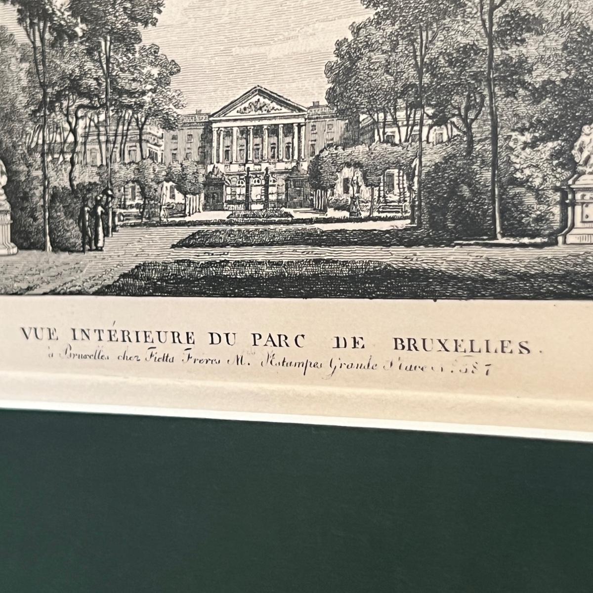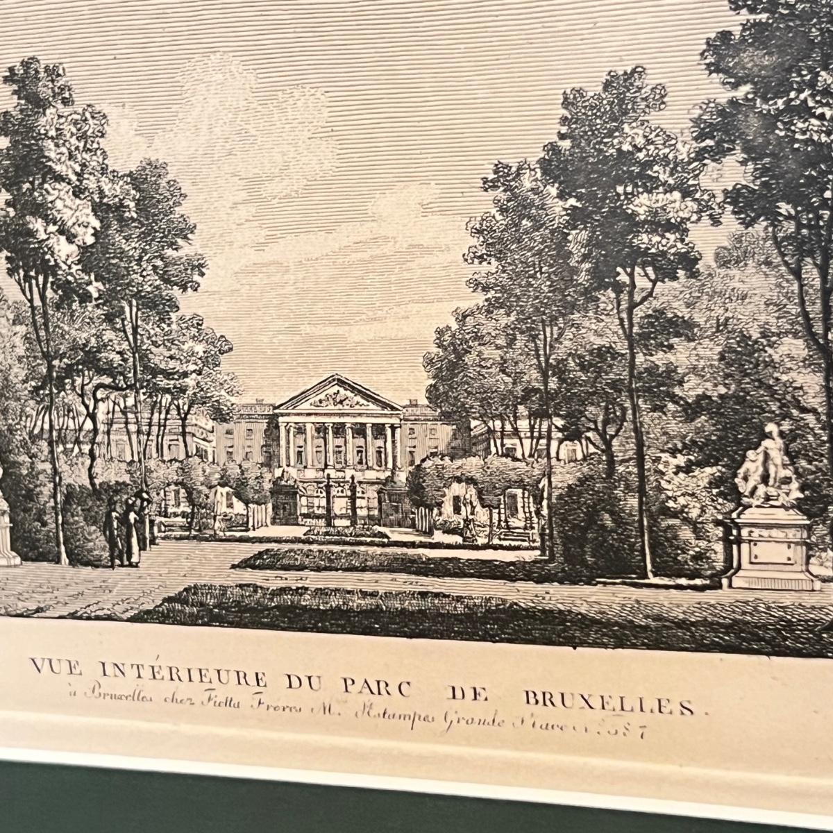 1950's print of the original copper engraving entitled "Interior view of the Brussels Park" ca. 1830 by Fietta Frères. Believed to be printed by Bibliotheca Chalcographia Regia Belge. There is a personal thank you note to the original owners that is stuck to the brown paper backing.