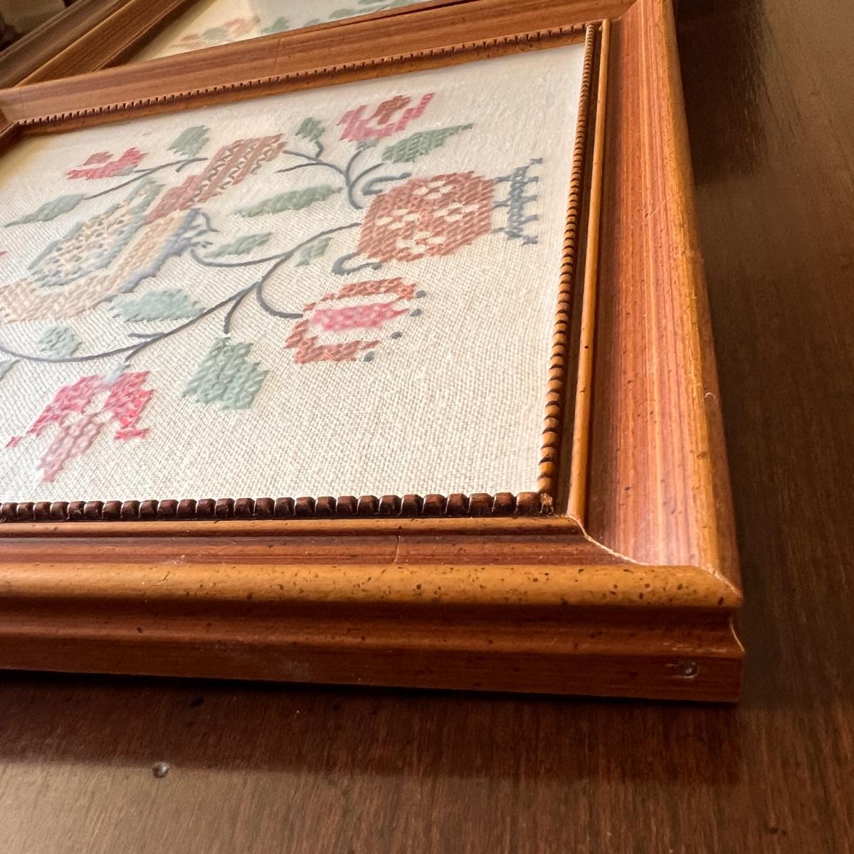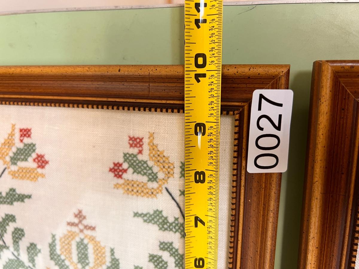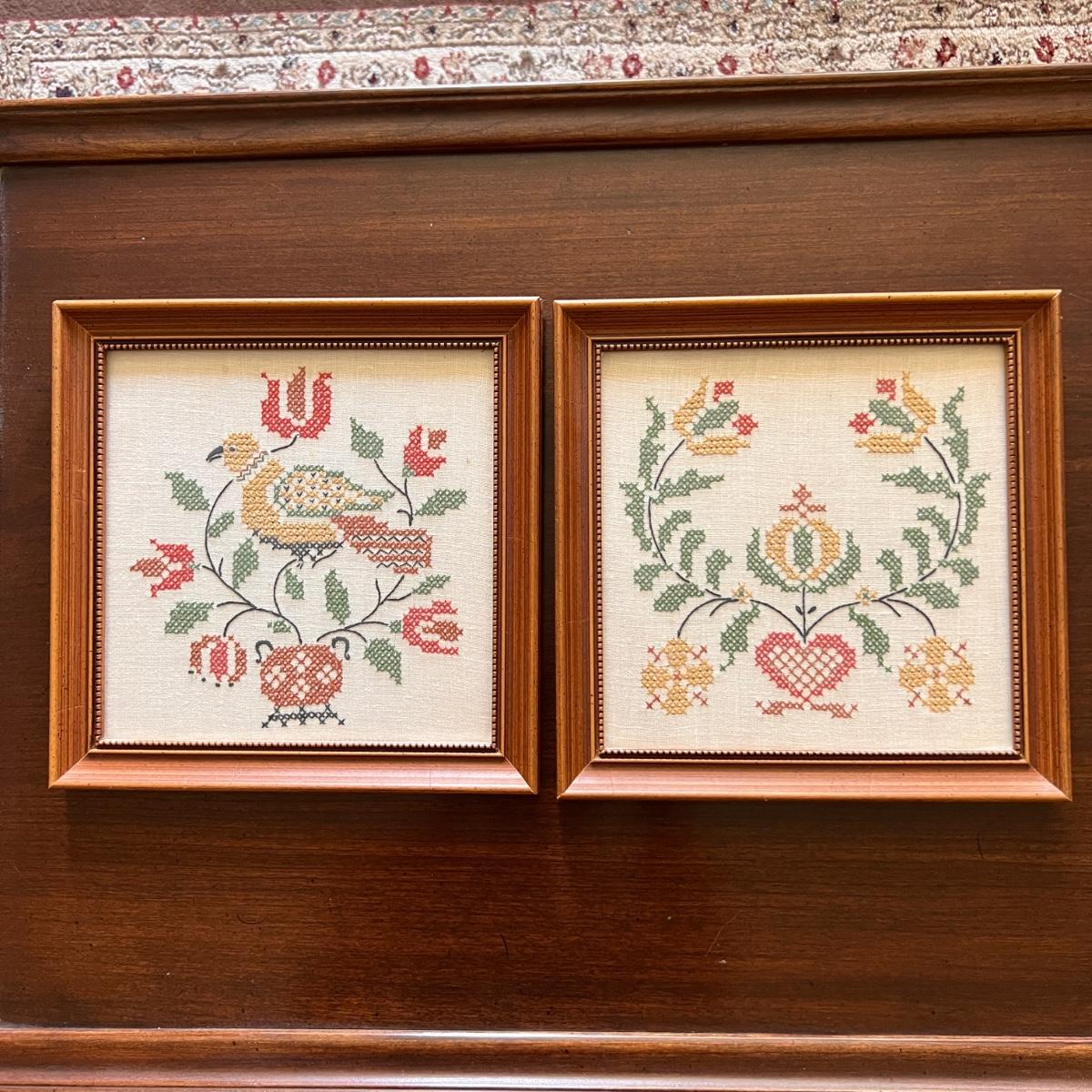 Lot of 2 professionally wooden framed embroidered hand stitched folk art pieces.