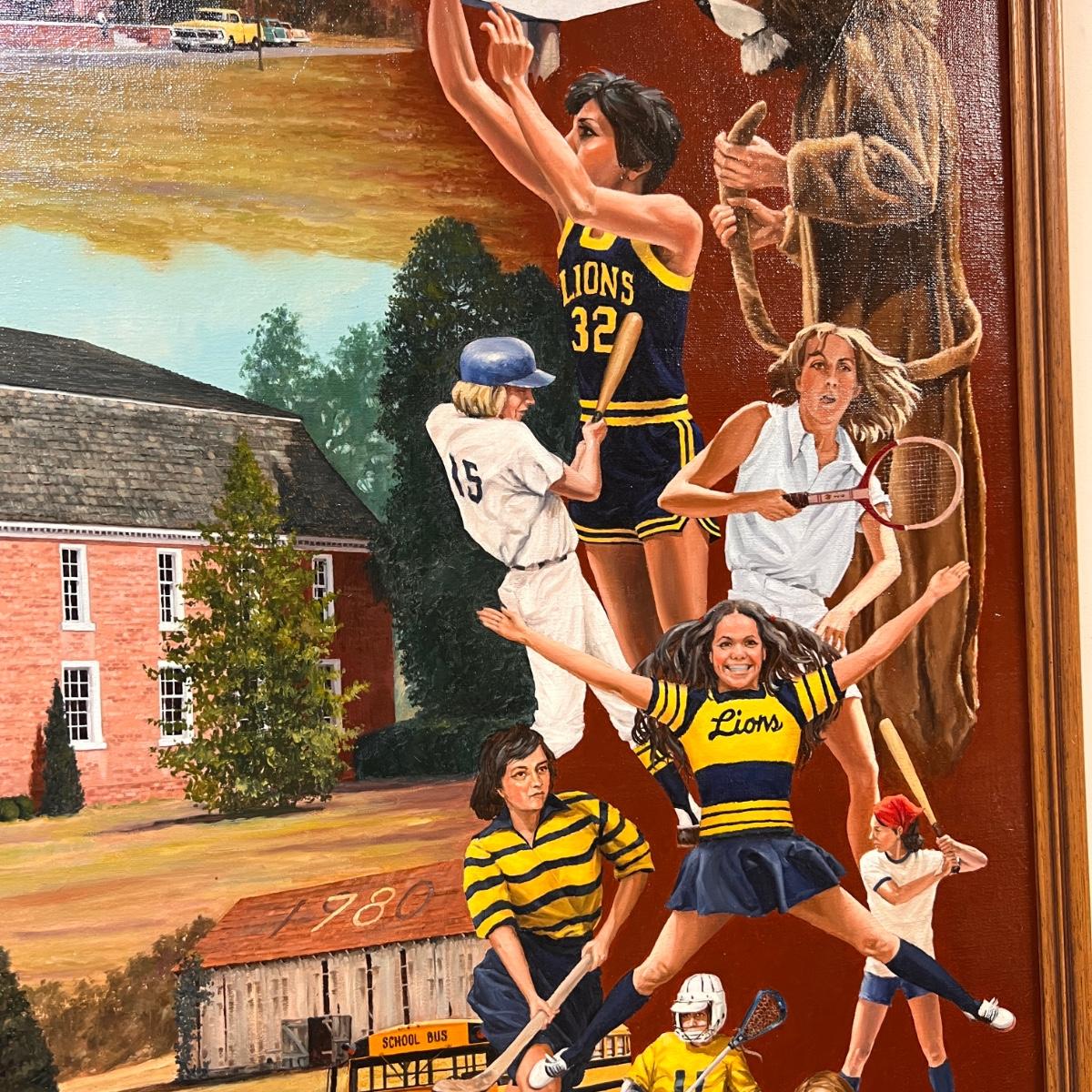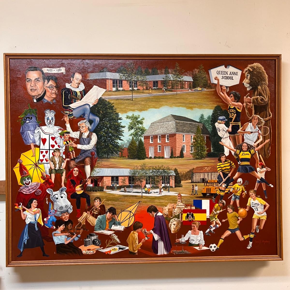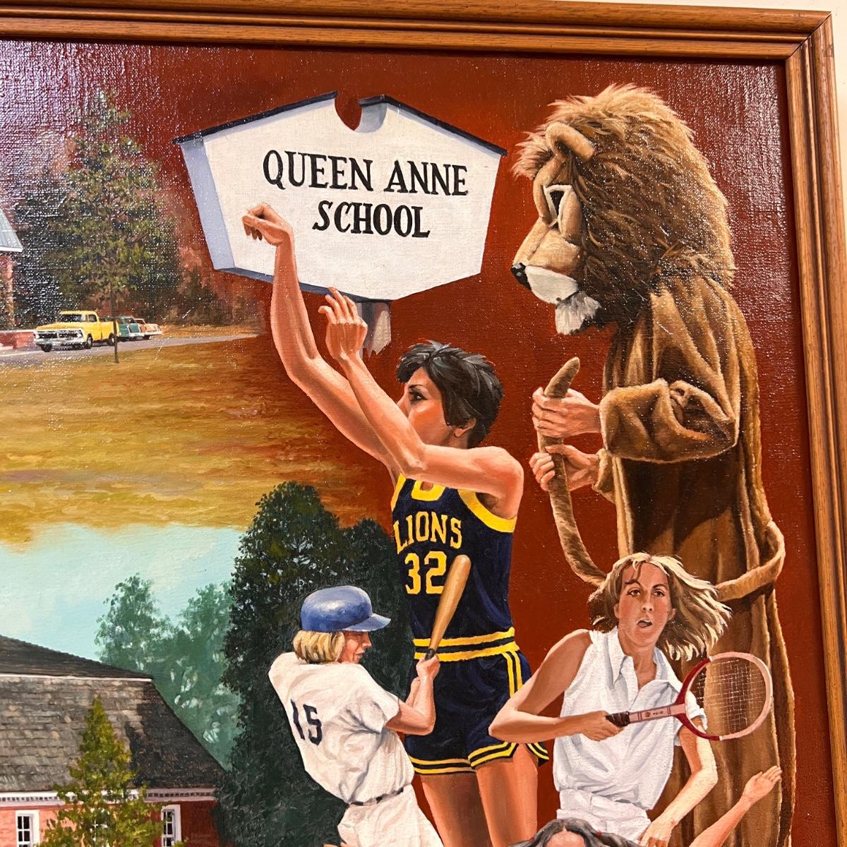 Awesome large oil painting of Queen Anne School measuring 50" x 37". Wooden frame.