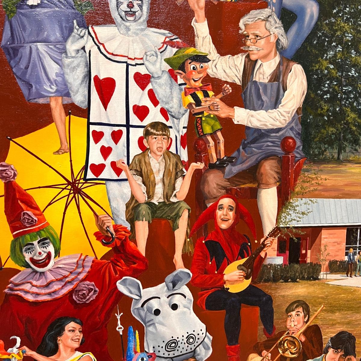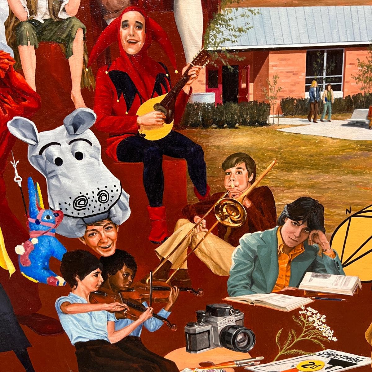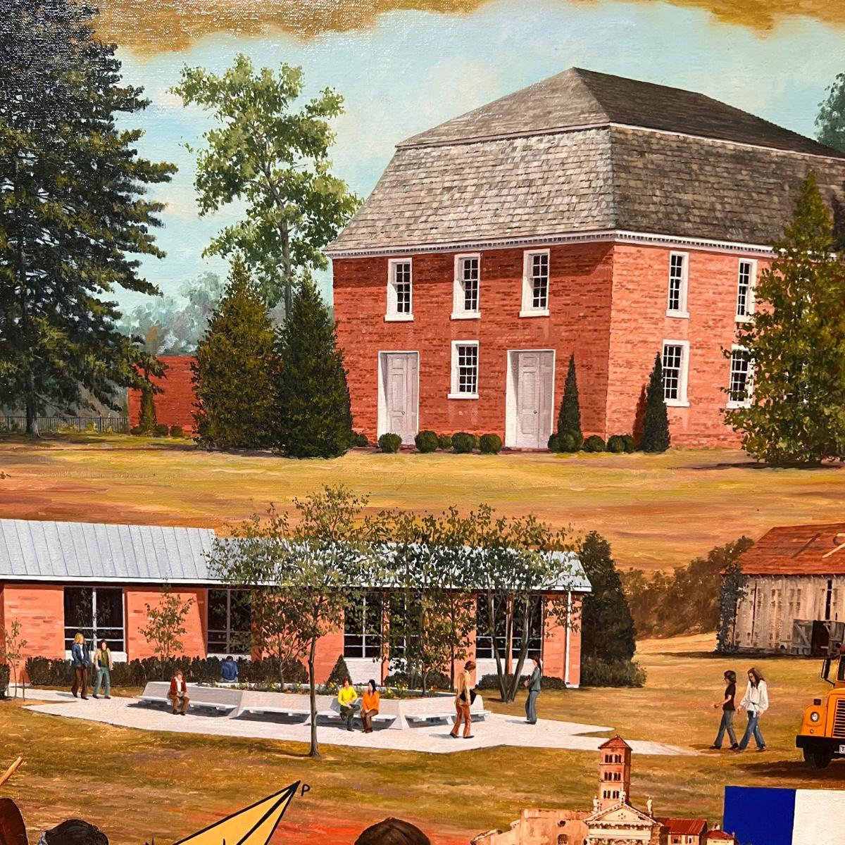 Awesome large oil painting of Queen Anne School measuring 50" x 37". Wooden frame.