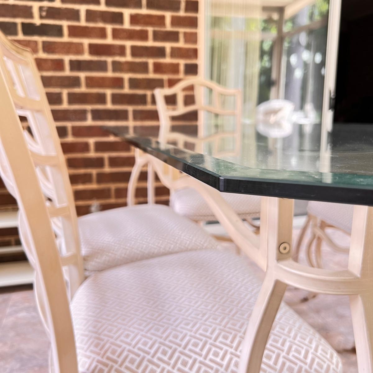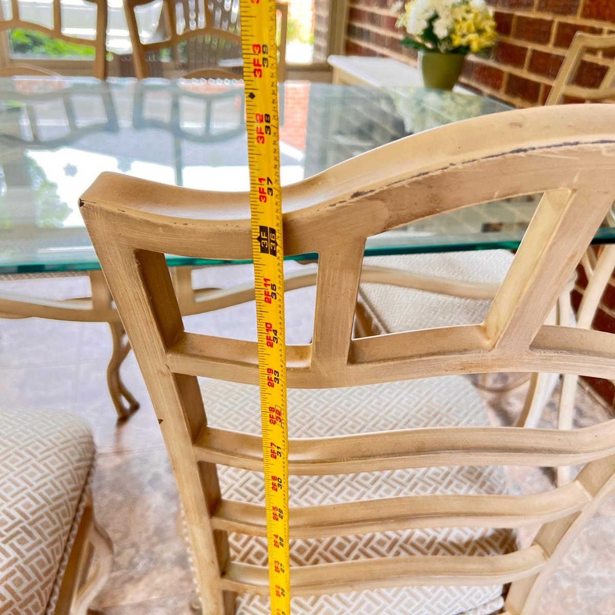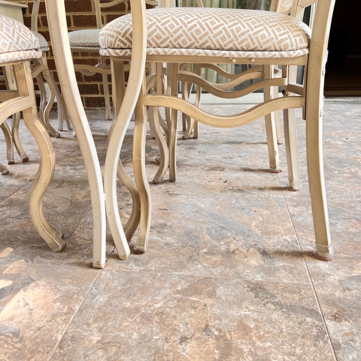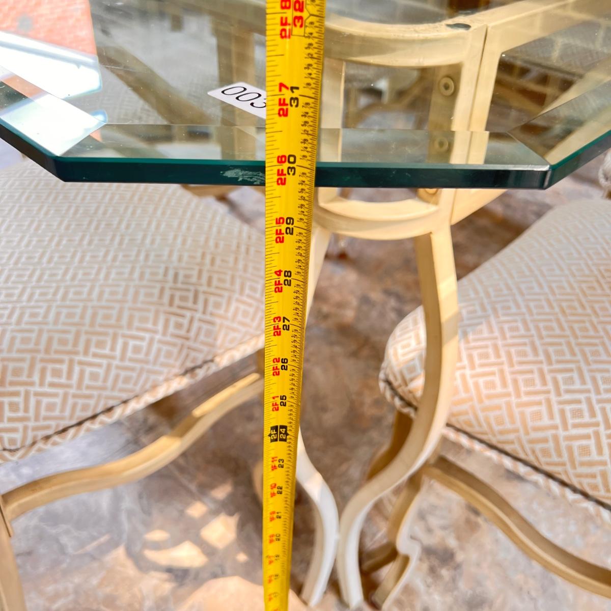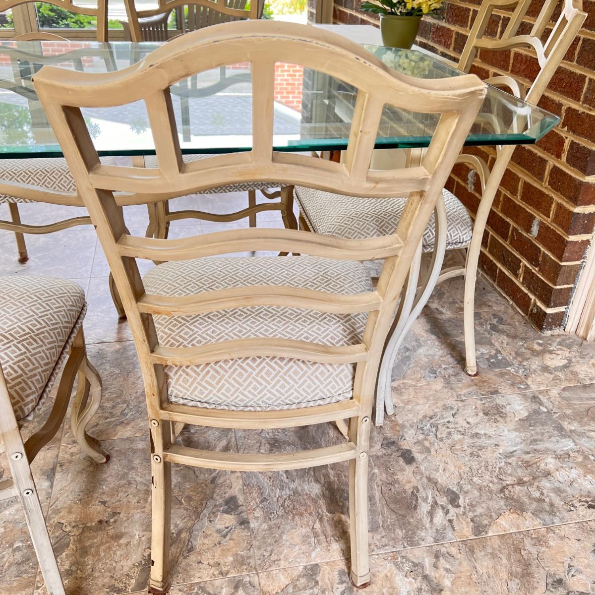 This set is in great condition. The owner had covers made for the chairs as shown in the 6th picture (they come with the set as well). So the upholstery is pristine! The cream colored metal has a brushed effect to it best seen in second to last picture. The glass top has a beveled edge. Very good quality furniture! NOTE: This set is made of metal. It will be on the heavier side. Prepare to properly move the heavy glass top carefully.