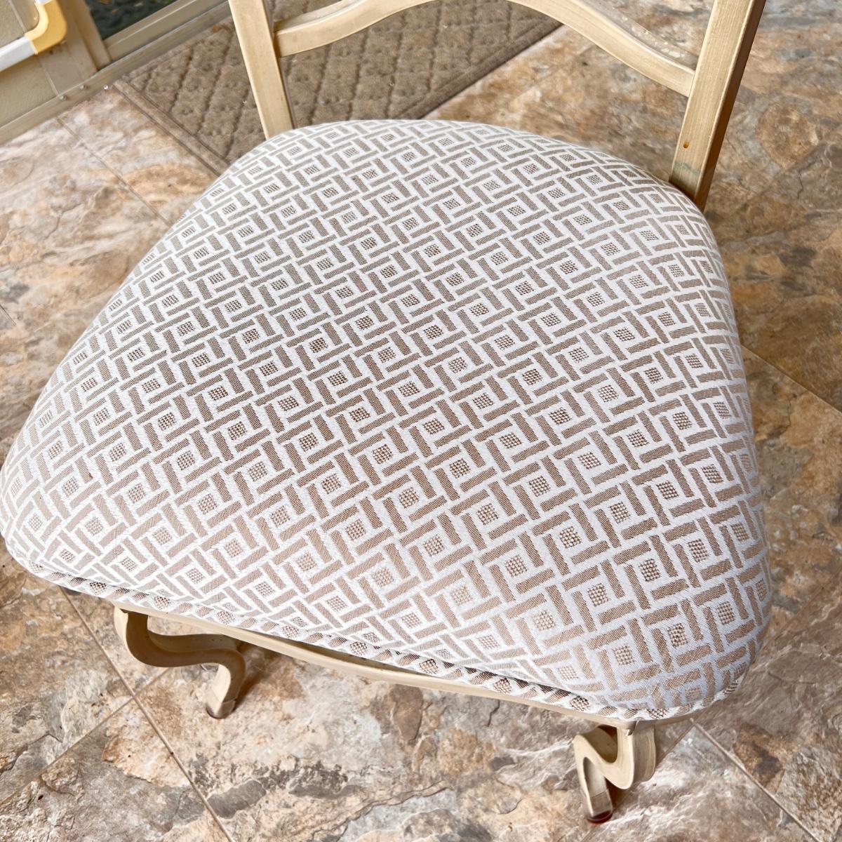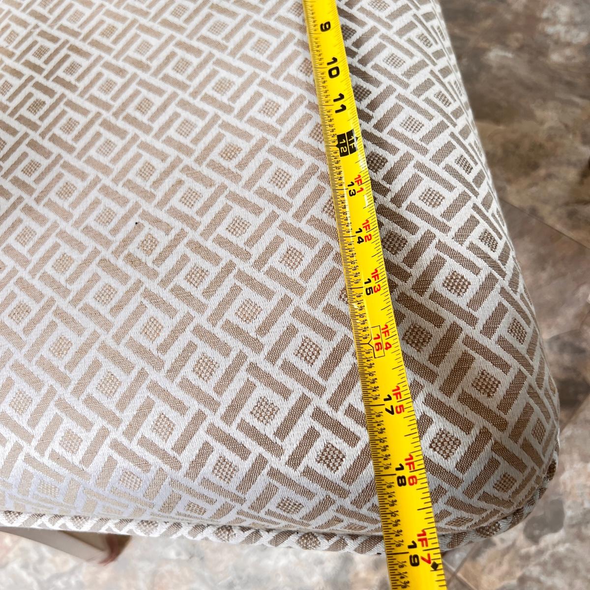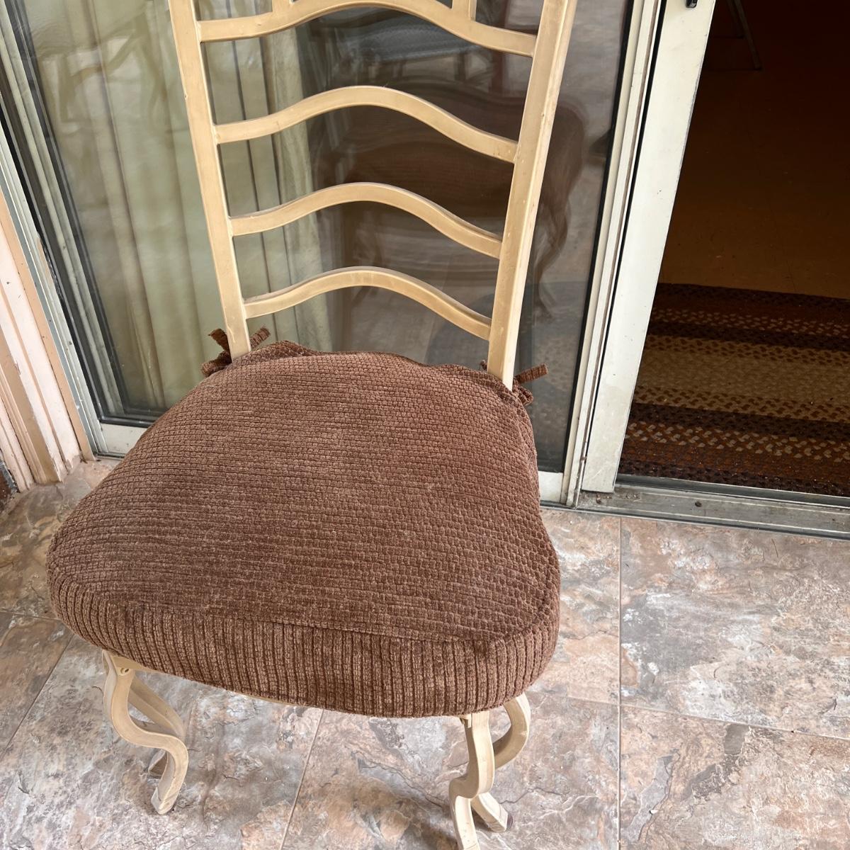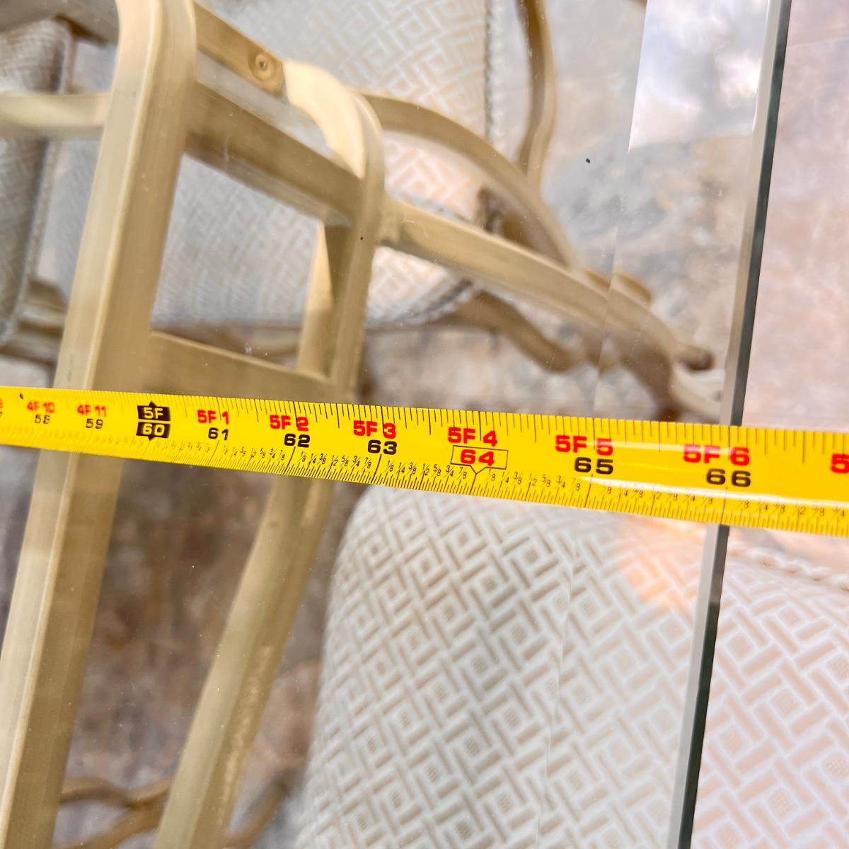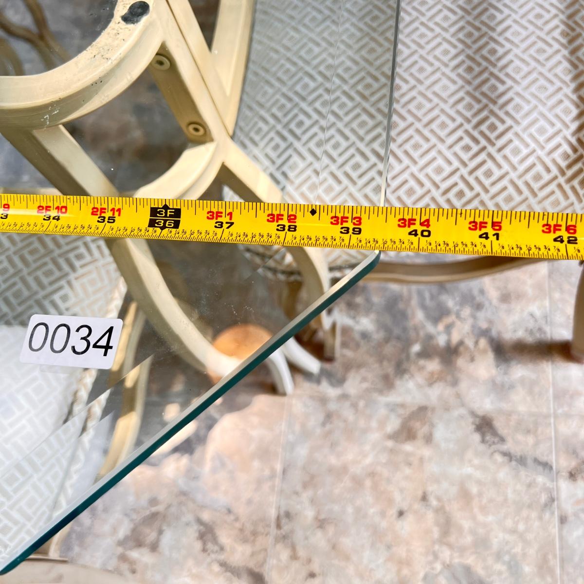 This set is in great condition. The owner had covers made for the chairs as shown in the 6th picture (they come with the set as well). So the upholstery is pristine! The cream colored metal has a brushed effect to it best seen in second to last picture. The glass top has a beveled edge. Very good quality furniture! NOTE: This set is made of metal. It will be on the heavier side. Prepare to properly move the heavy glass top carefully.