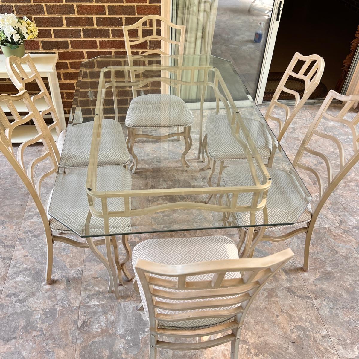 Metal Glass Topped Patio Table with 6 Upholstered Chairs