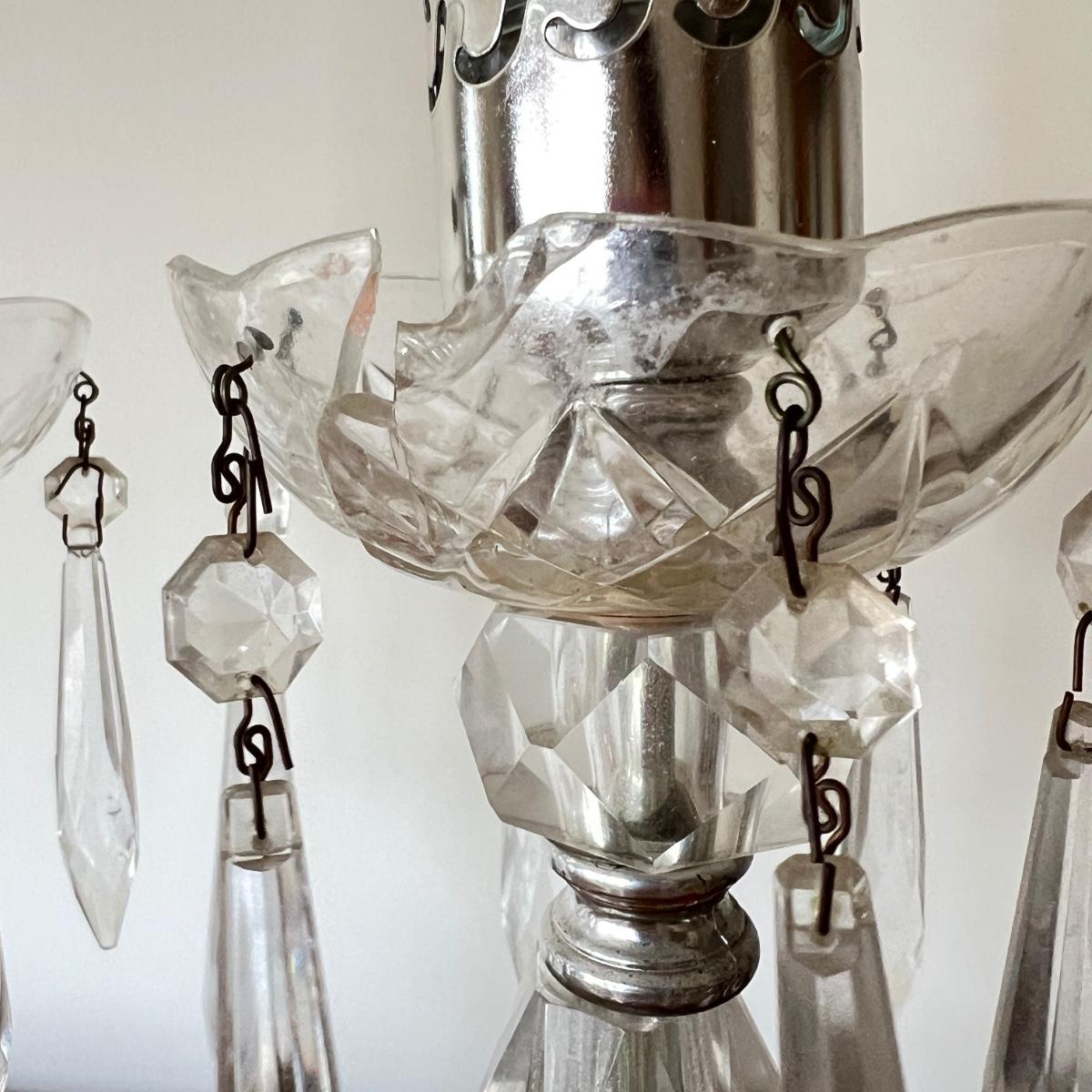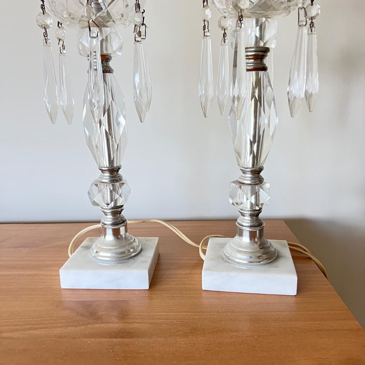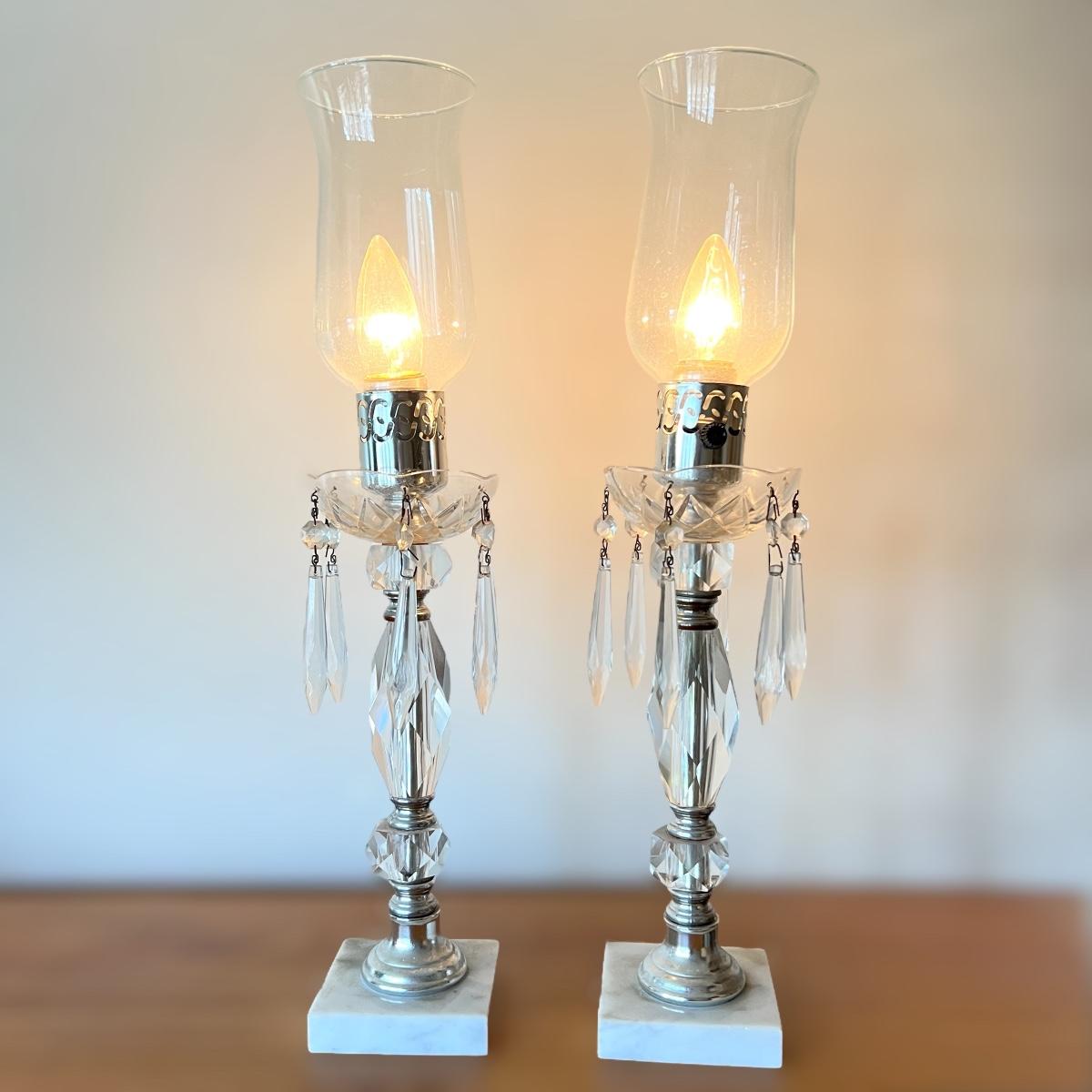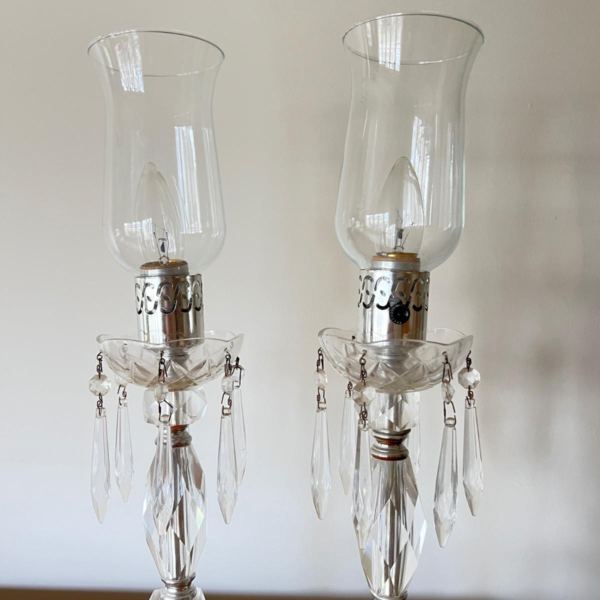 All hanging crystals included. One lamp has a chip missing from the back of the dish as shown in pics. Buying "as is - as found" in this wonderful estate. See ALL PHOTOS for content, condition, & dimensions. NEVER a Buyer's Premium or Credit Card Fee added.