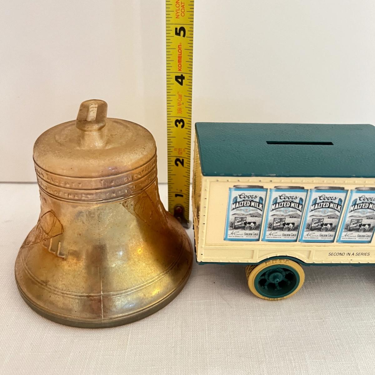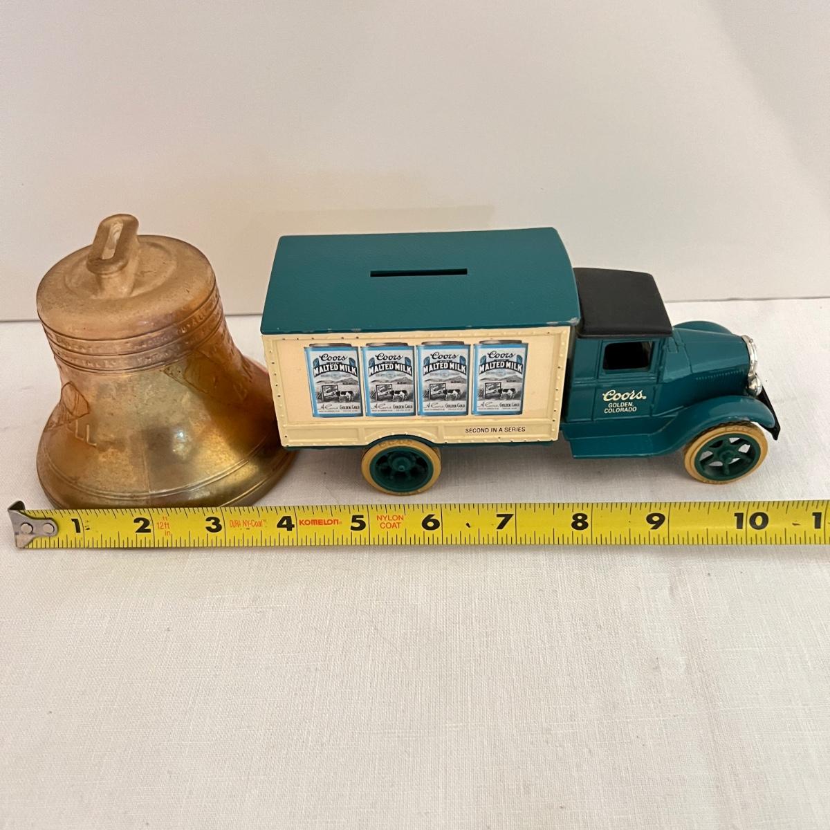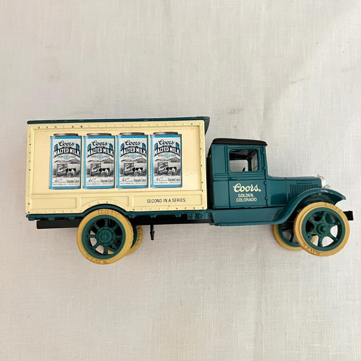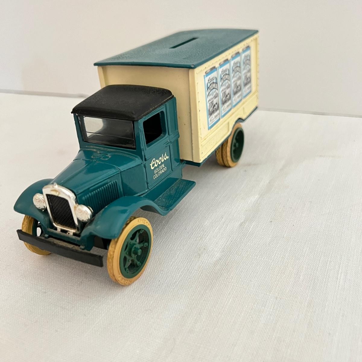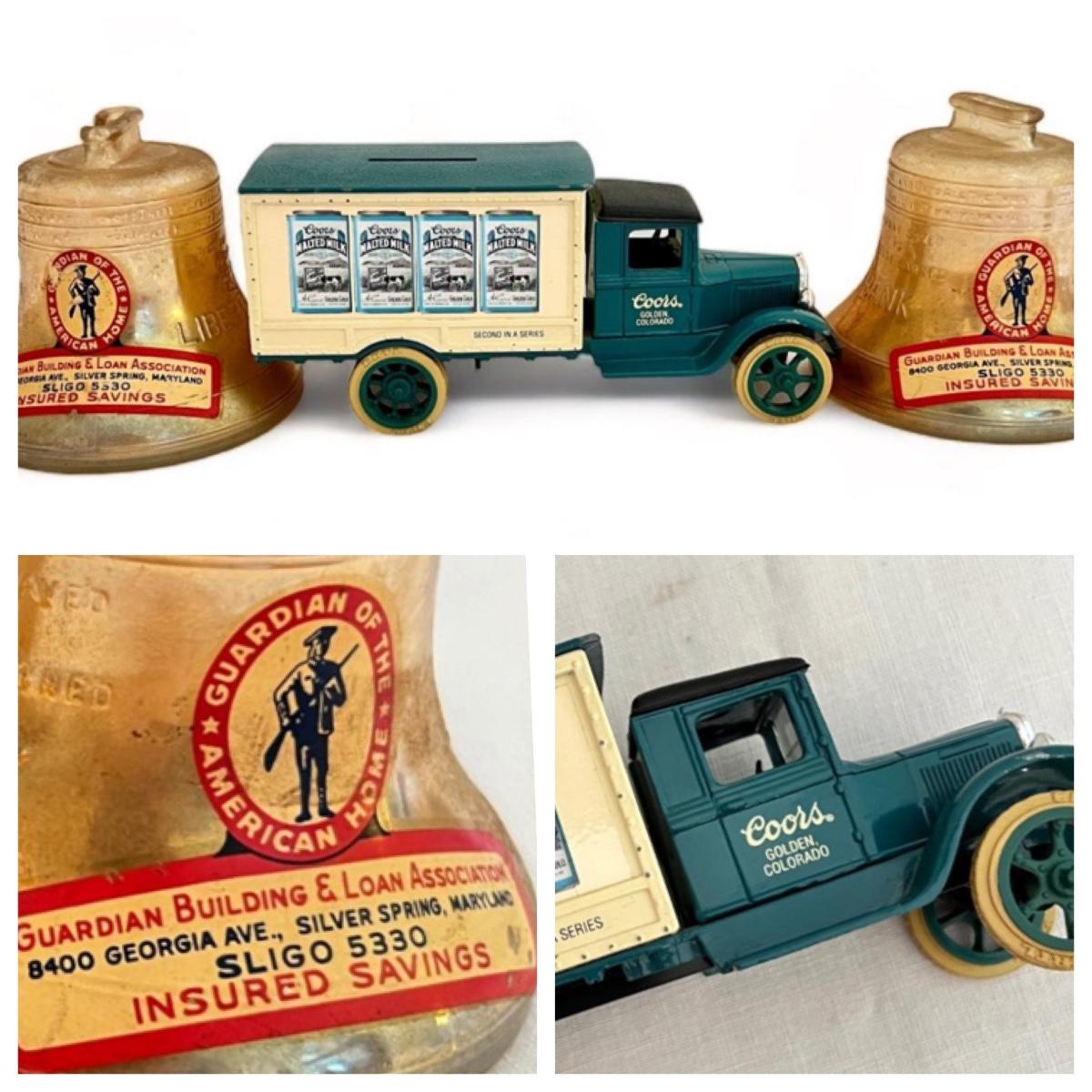 2 vintage carnival glass banks - one has a chip to the coin opening. Both have coins in them. 1 (issued in 1994) 1/30 scale diecast 1931 Hawkeye Truck bank. Features the Coors Malted Milk logo on the truck and Coors Golden Colorado on the doors of the truck