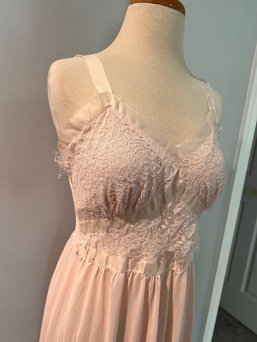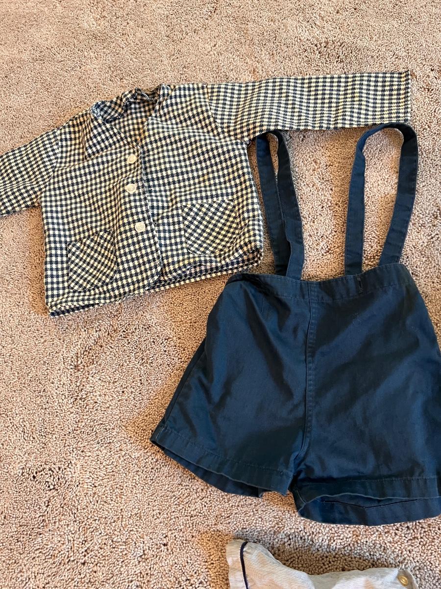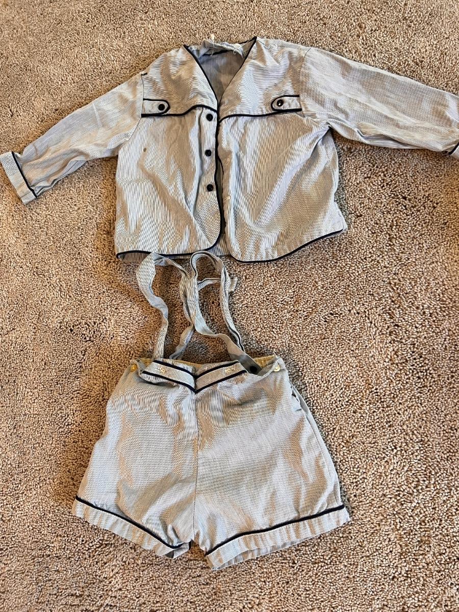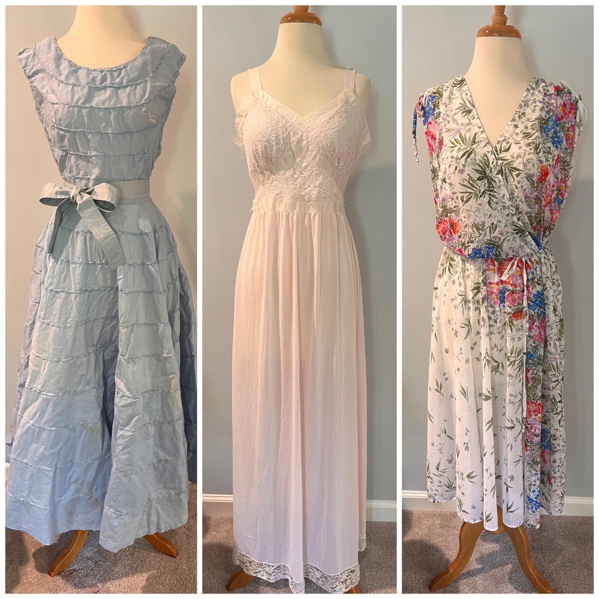 Lot of vintage clothes. 2 baby toddler outfits, 3 pairs men’s pants. 1 slip (lace has pulls), 50’s 60’s gown (fabric damage and some small stains as shown in pics). Anthony Sicari top and skirt set. Various sizes.