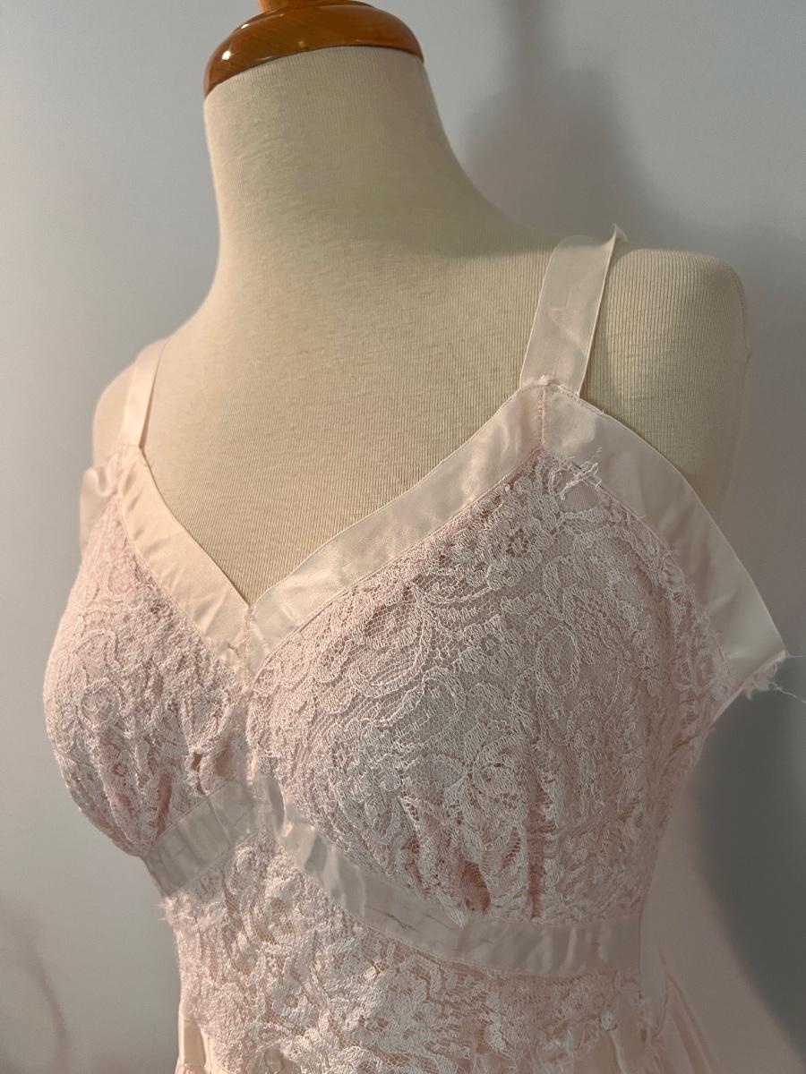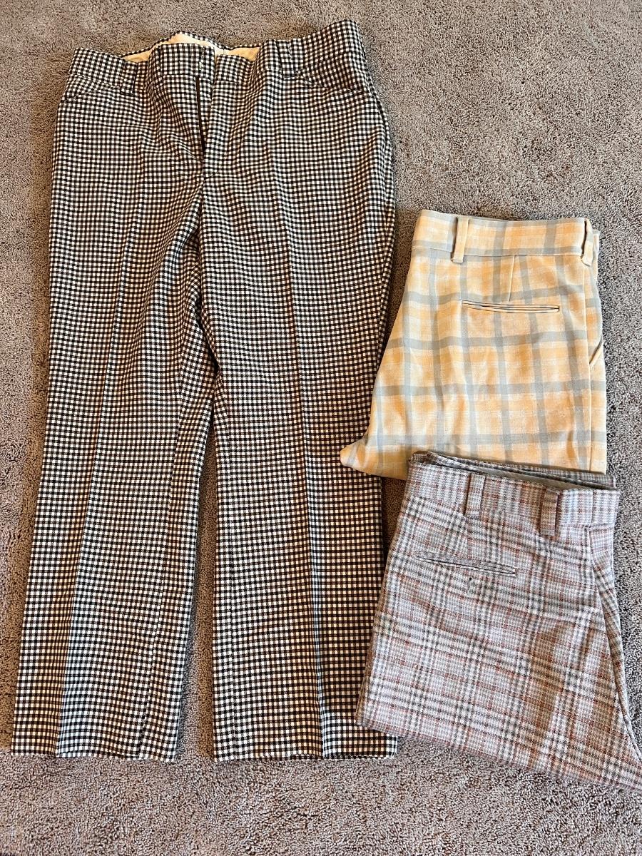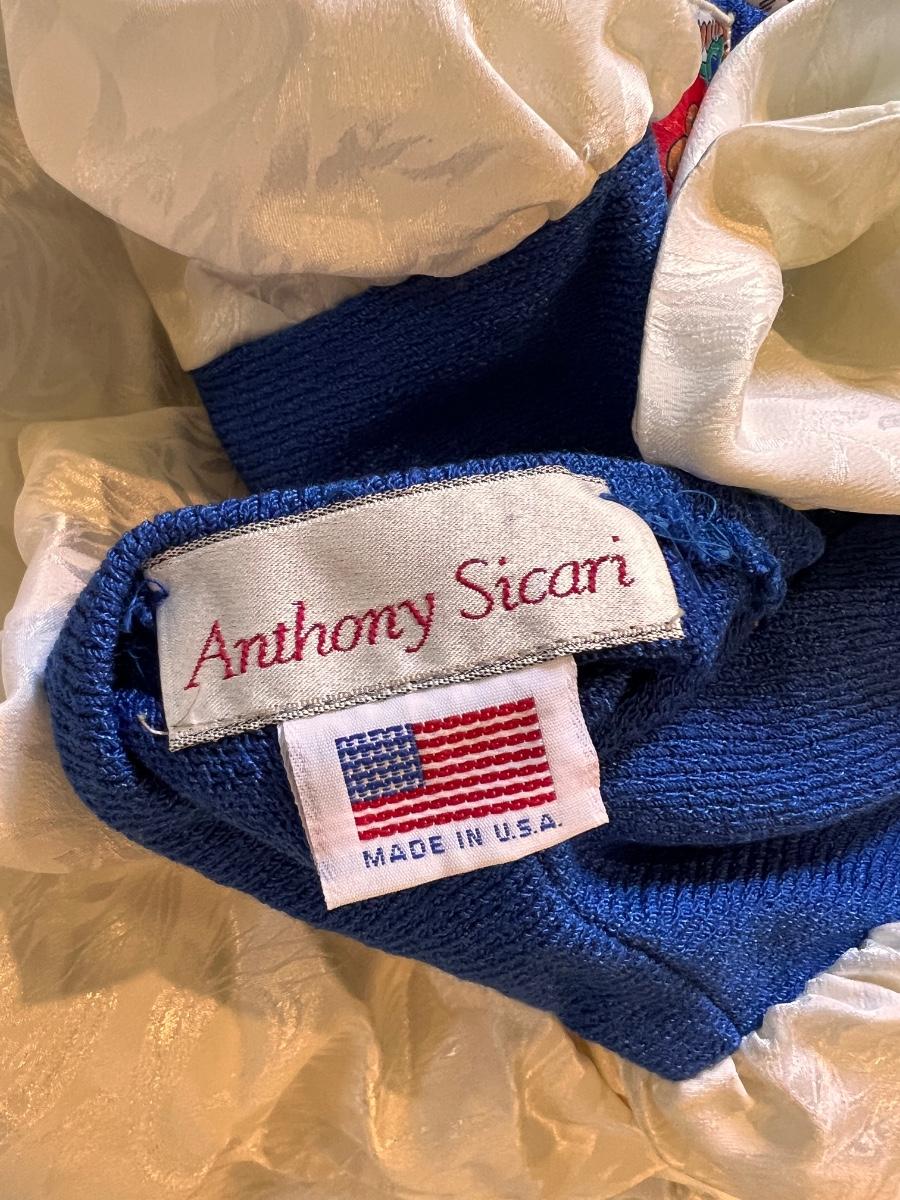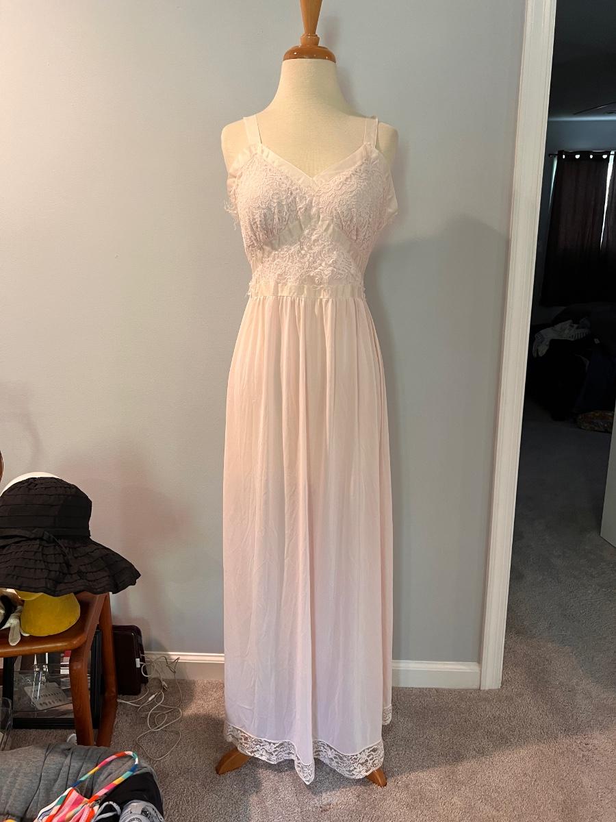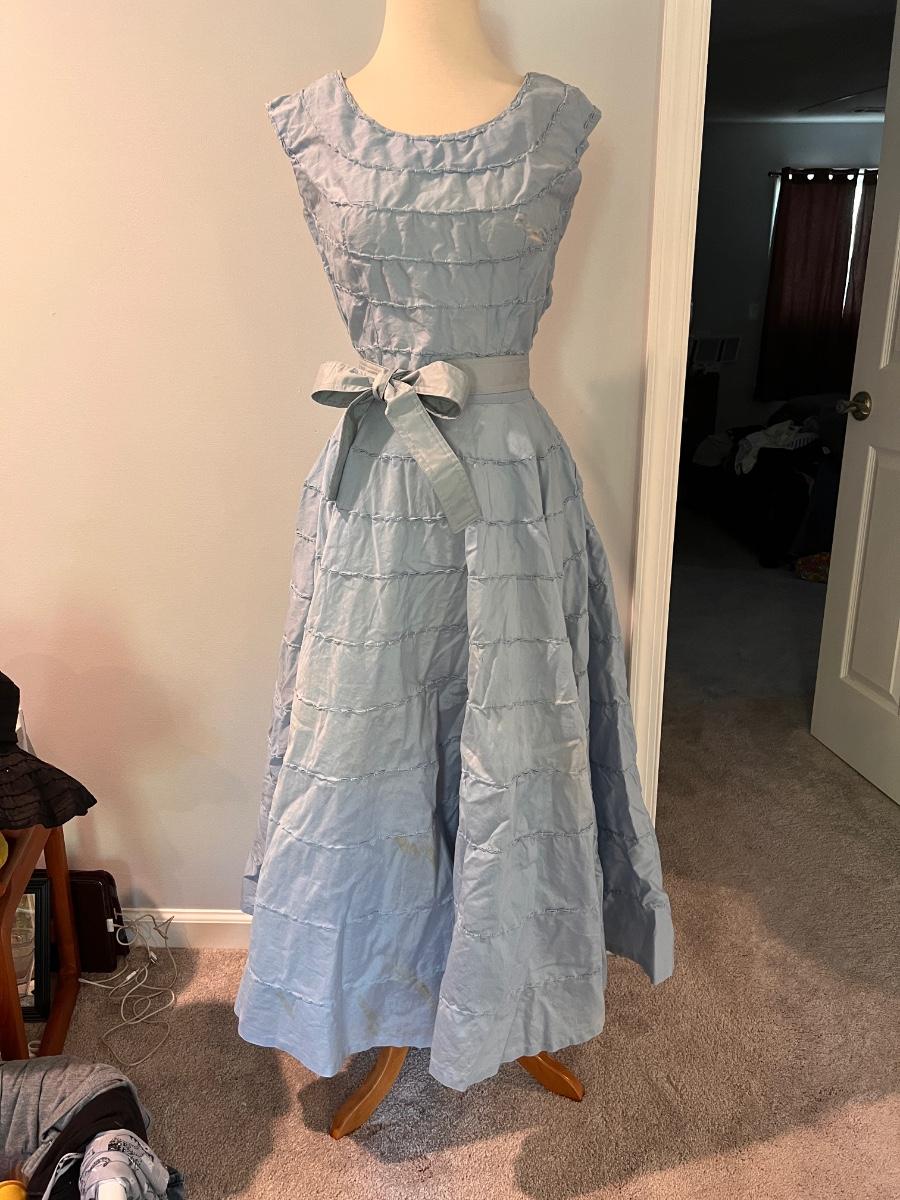 Lot of vintage clothes. 2 baby toddler outfits, 3 pairs men’s pants. 1 slip (lace has pulls), 50’s 60’s gown (fabric damage and some small stains as shown in pics). Anthony Sicari top and skirt set. Various sizes.