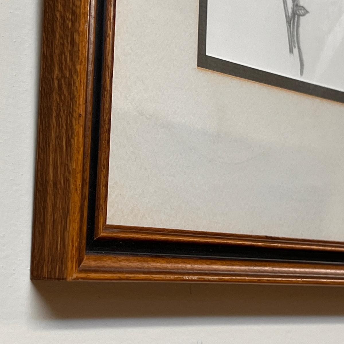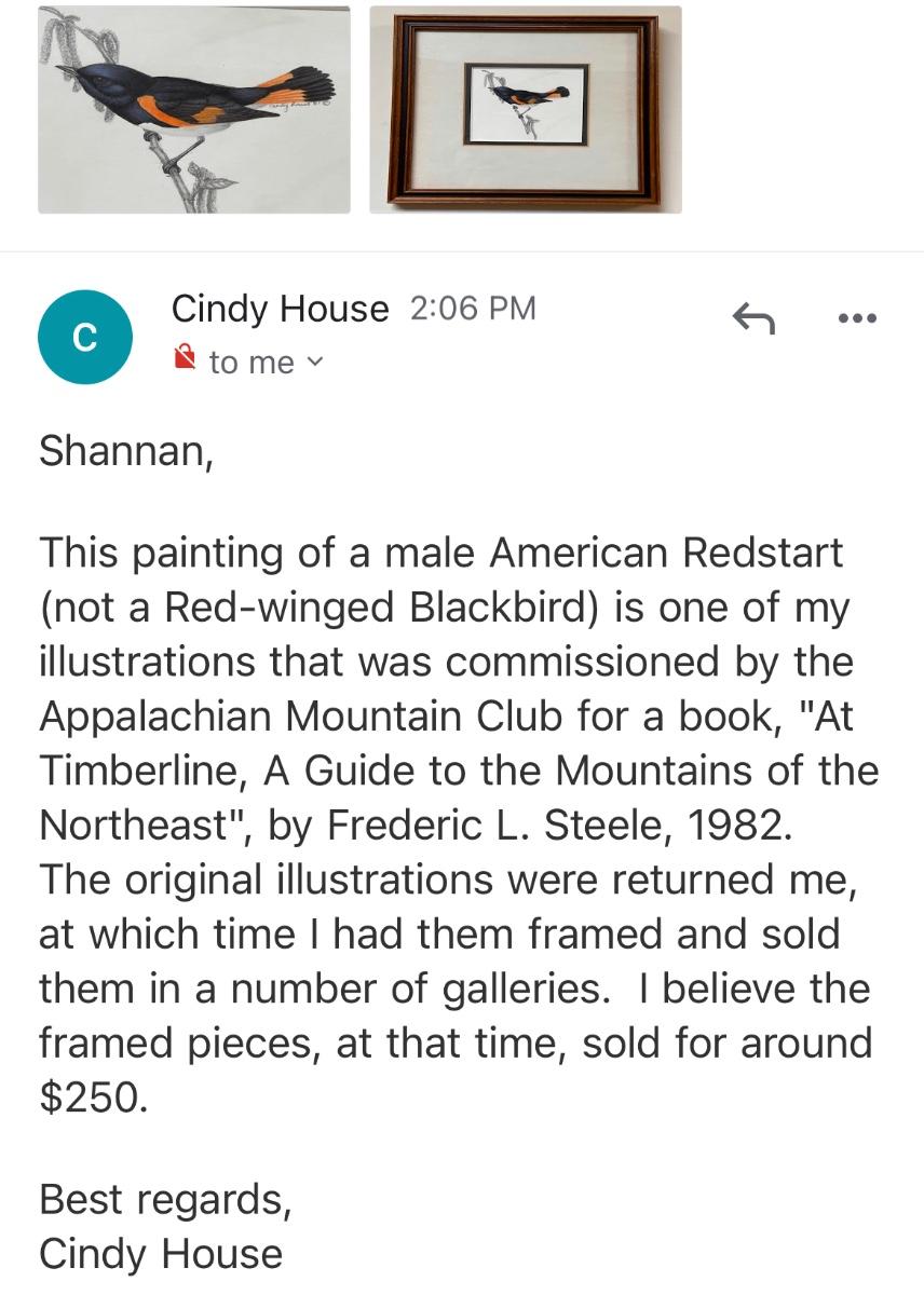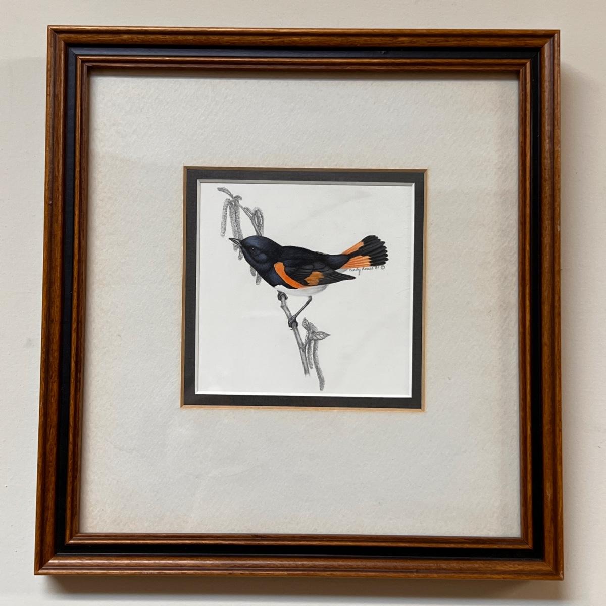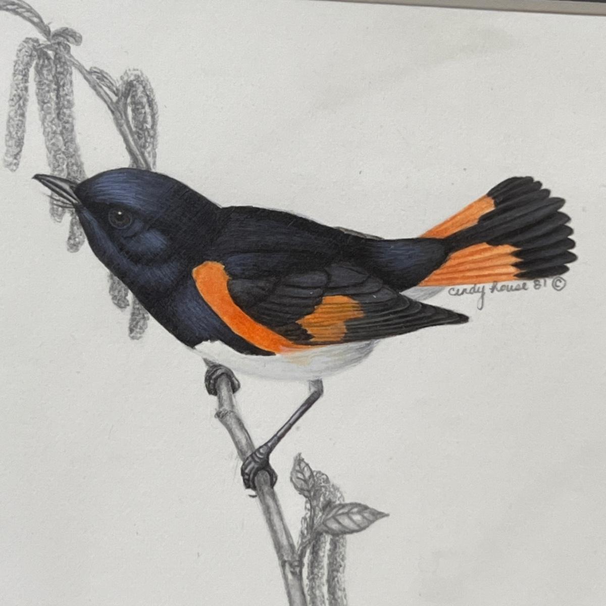 Vintage painting of a male American Redstart bird by Cindy House signed and dated 1981. As you can see from the second picture, I reached out to Cindy who gave me the background on this piece. Very impressive! Wooden two tone beveled frame. Professionally framed.