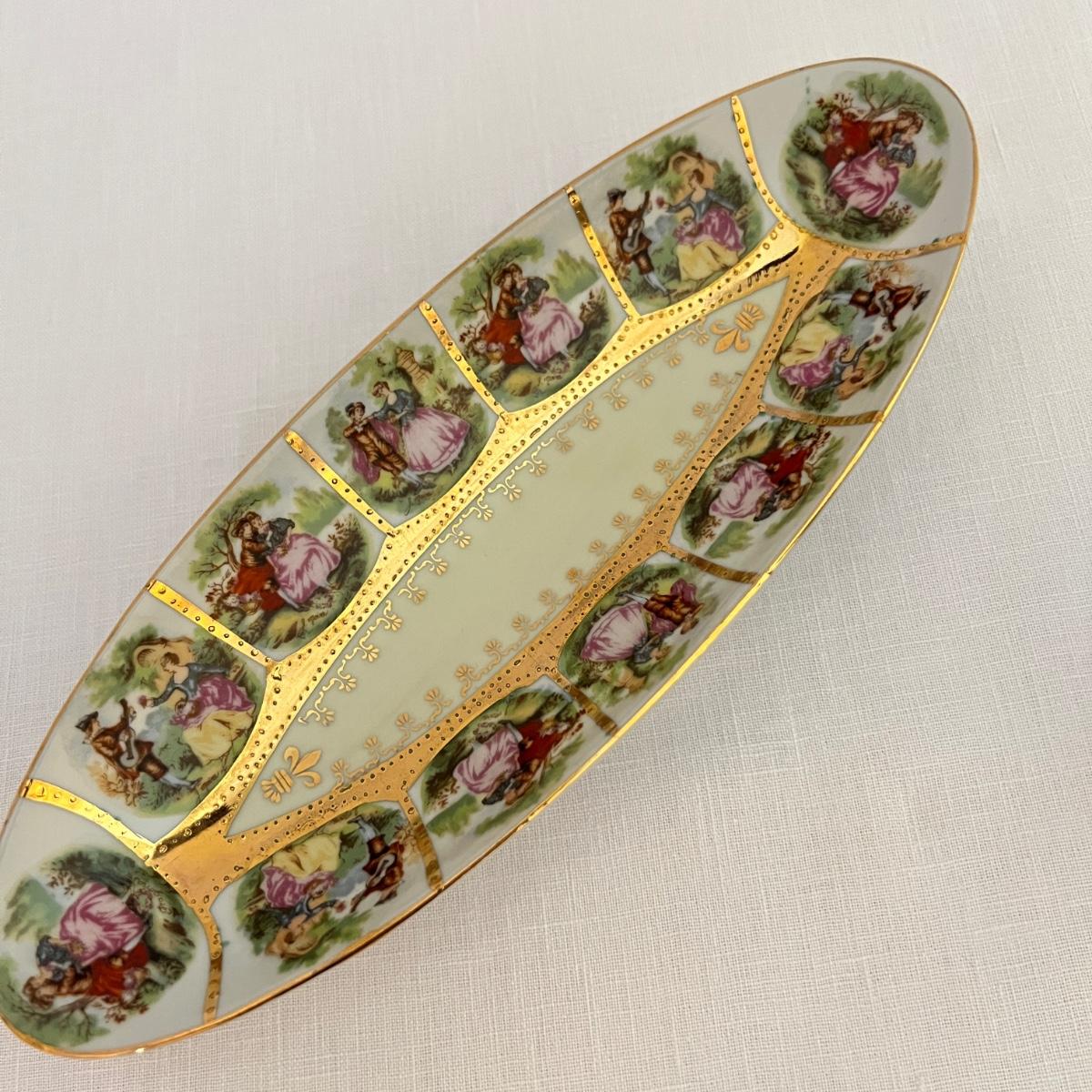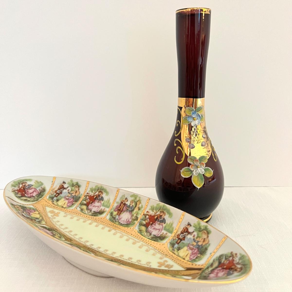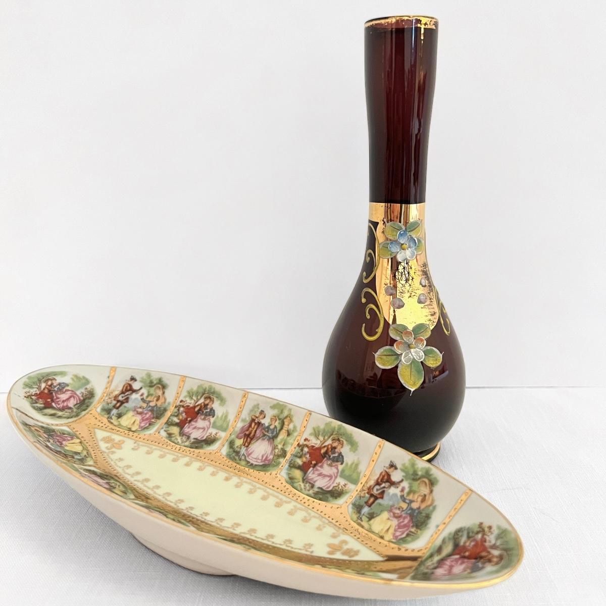 Bohemian style gold gilded blown glass vase with enameled flowers, (Possibly Arnart Royal Vienna?) gold gilded oval serving dish with Fragonard Love Story Courting Couple design.