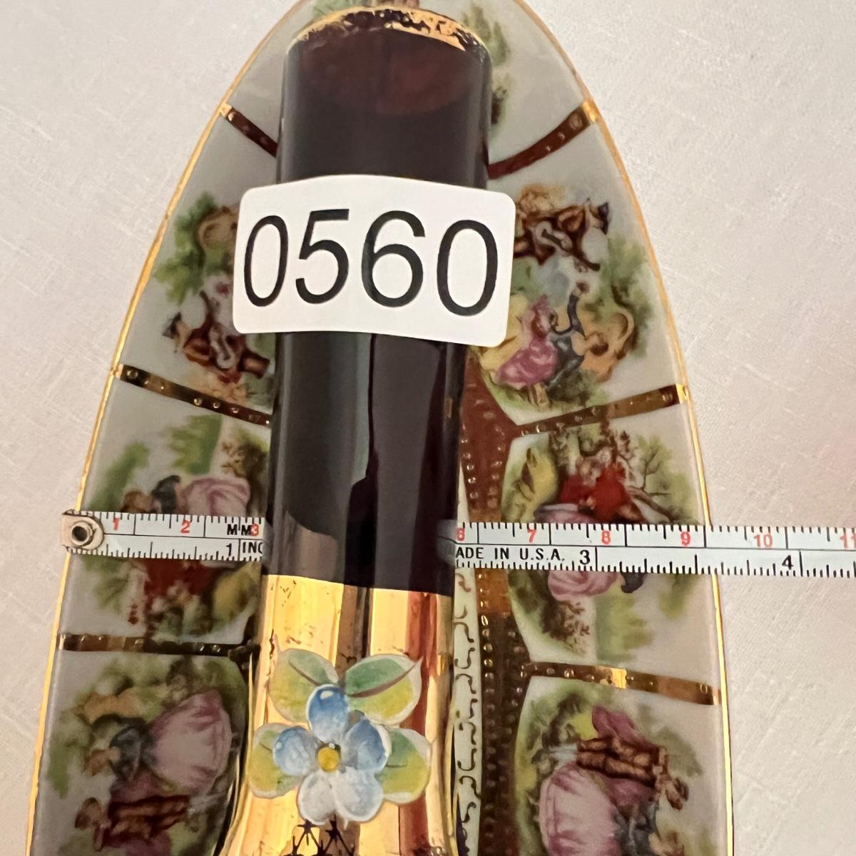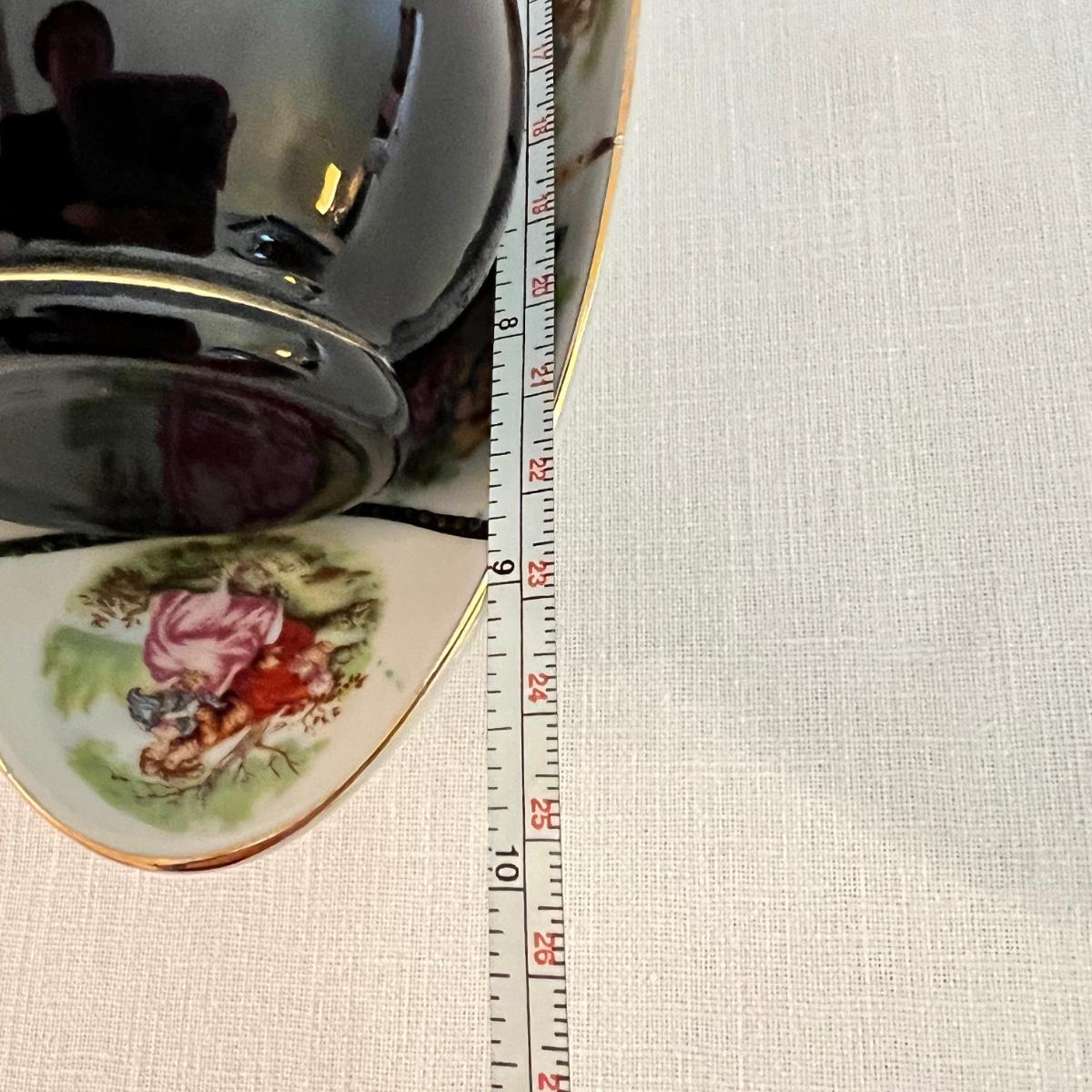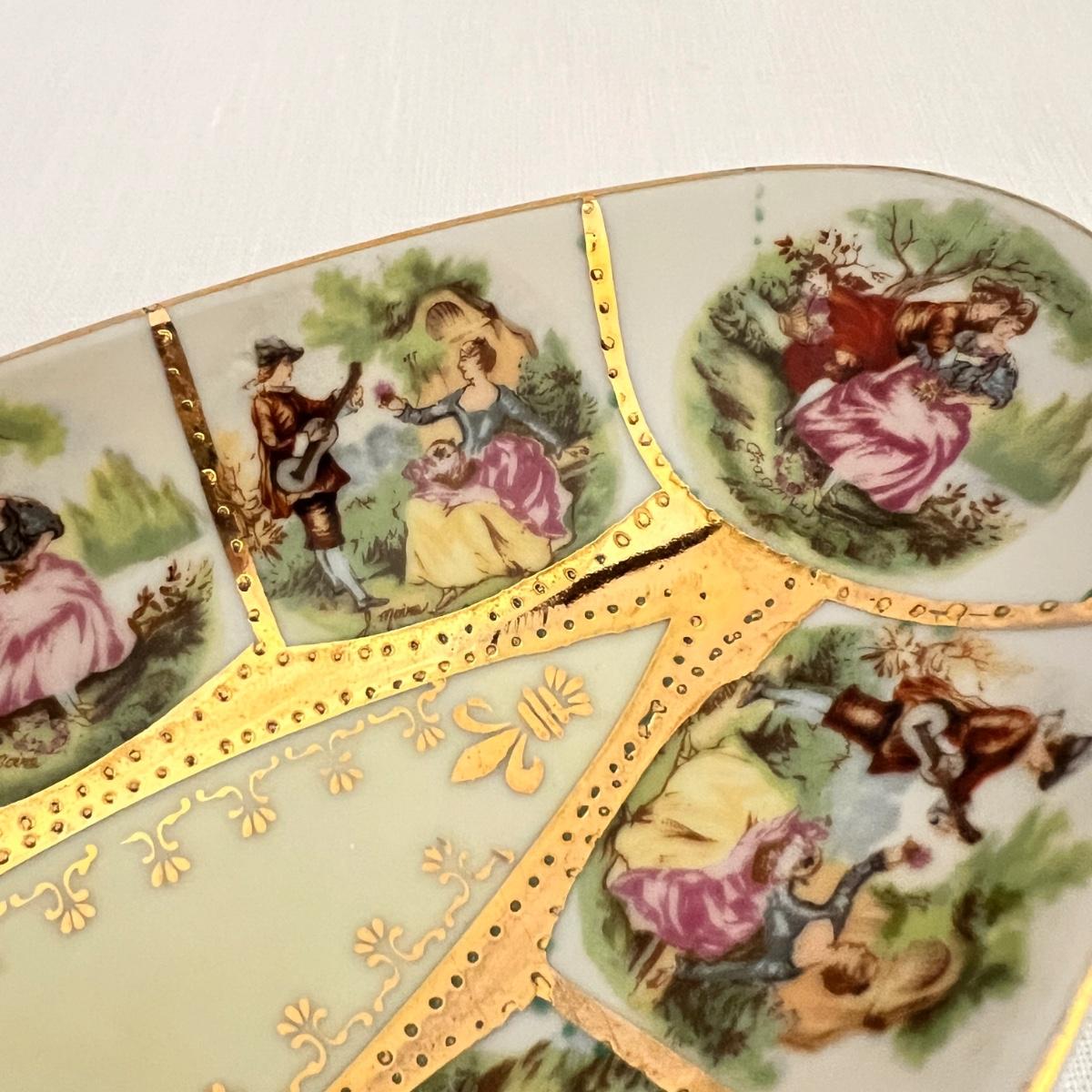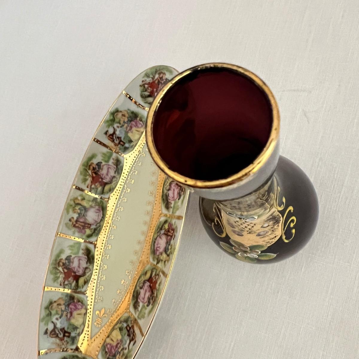 Bohemian style gold gilded blown glass vase with enameled flowers, (Possibly Arnart Royal Vienna?) gold gilded oval serving dish with Fragonard Love Story Courting Couple design.