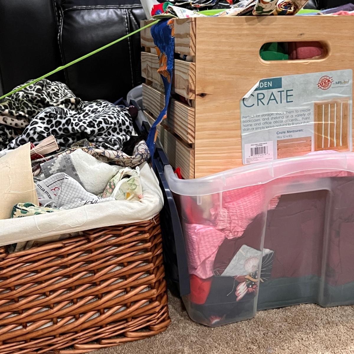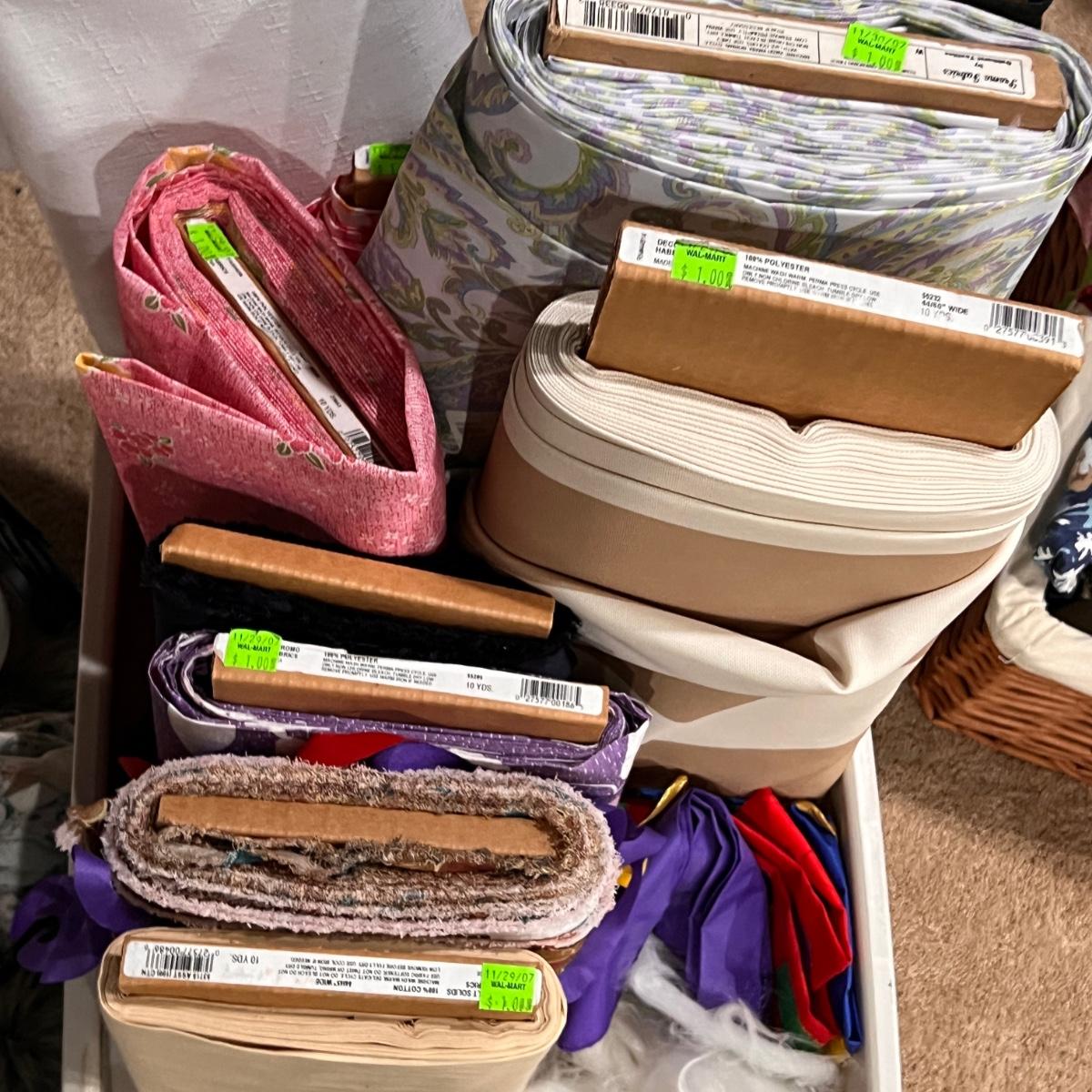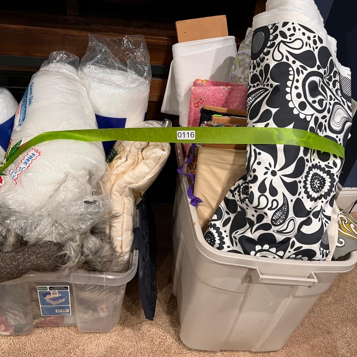 1 crate, 1 basket and 1 plastic storage container filled with fabric including faux fur, upholstery, bolts, huge pieces of ikea fabric etc. Storage containers included!