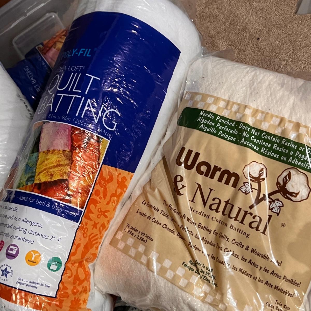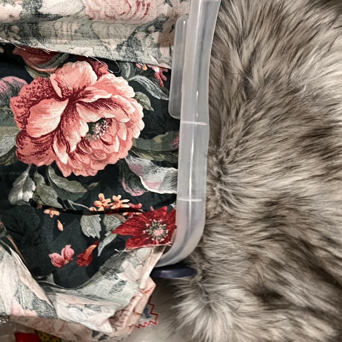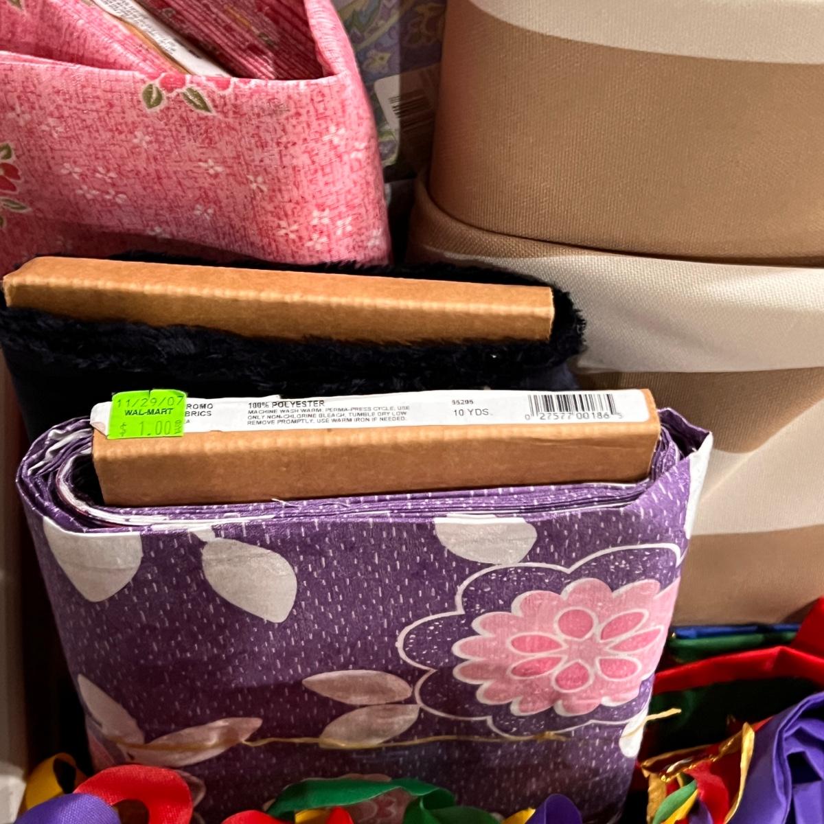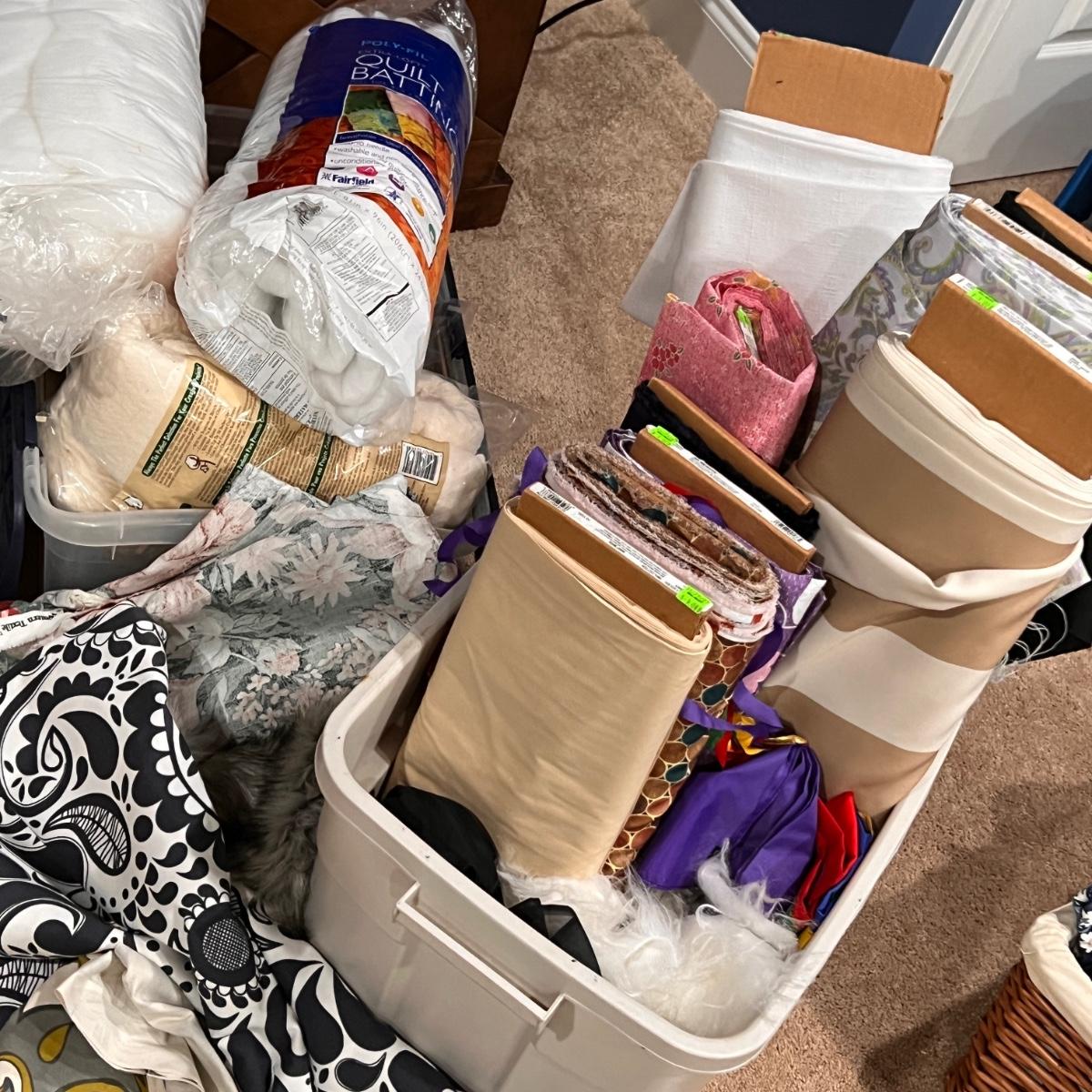1 crate, 1 basket and 1 plastic storage container filled with fabric including faux fur, upholstery, bolts, huge pieces of ikea fabric etc. Storage containers included!