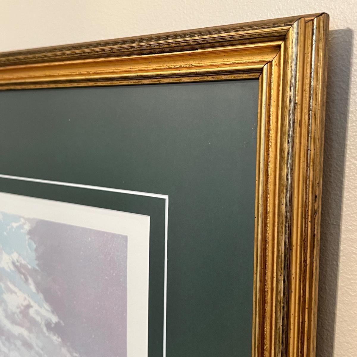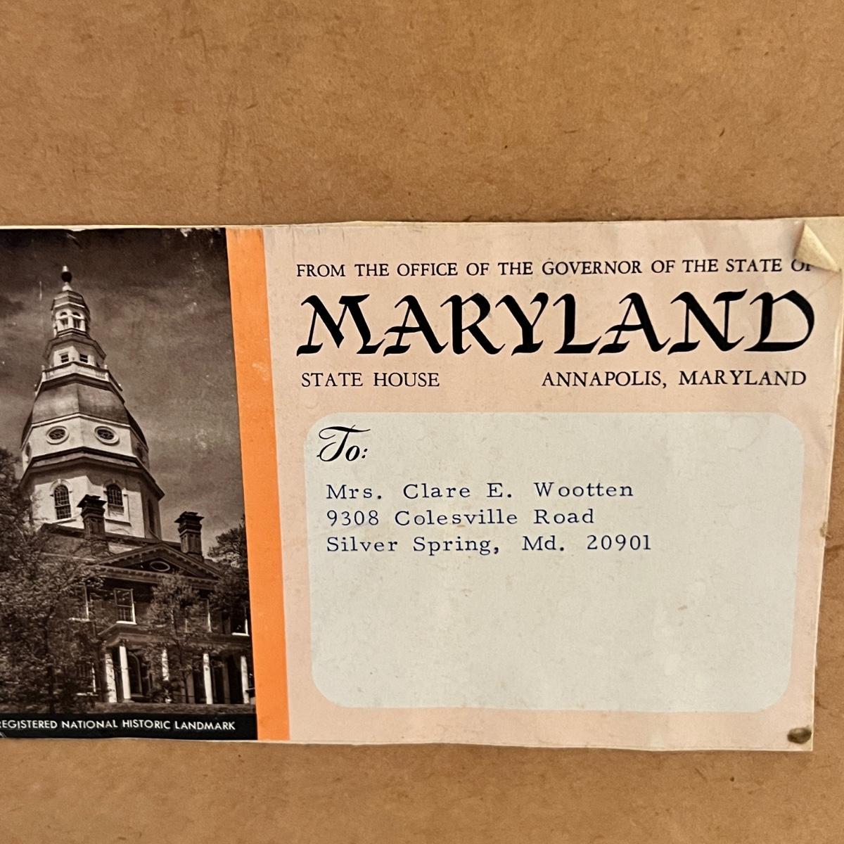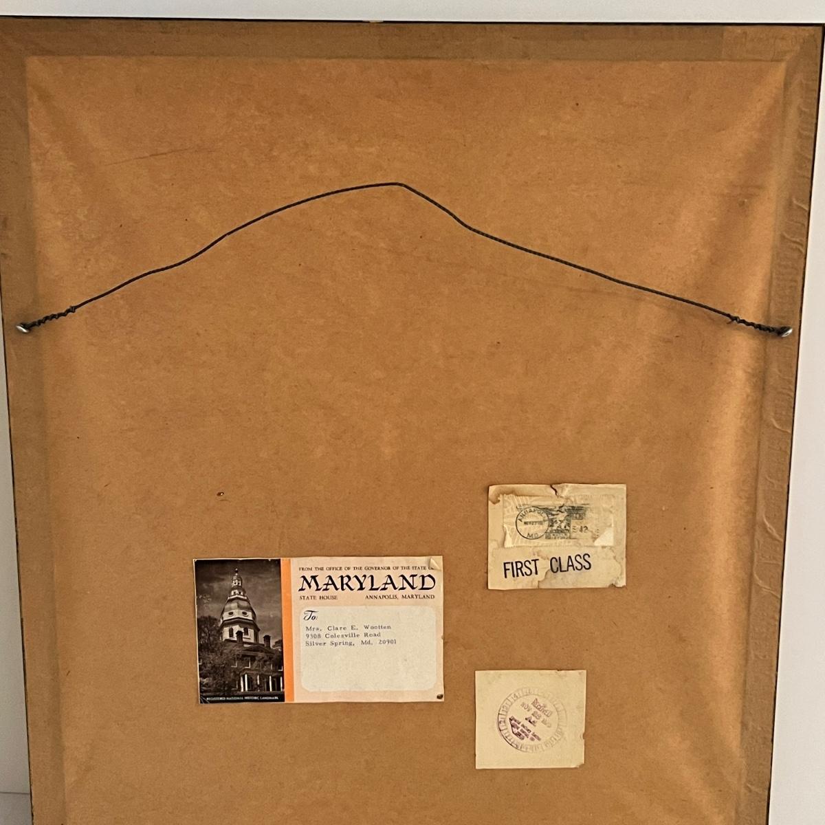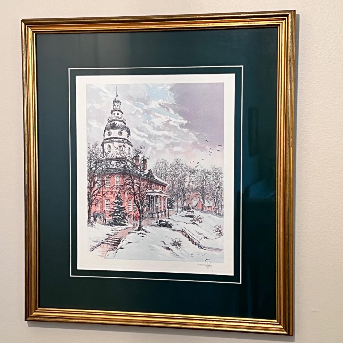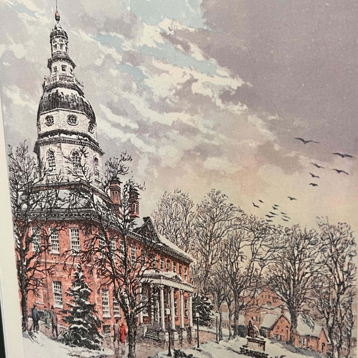 Vintage Print of colored etching of the Annapolis, Maryland State House in the snow, completed in 1779. The back has a sticker that reads "From the office of the Govenor of the State of Maryland State House".