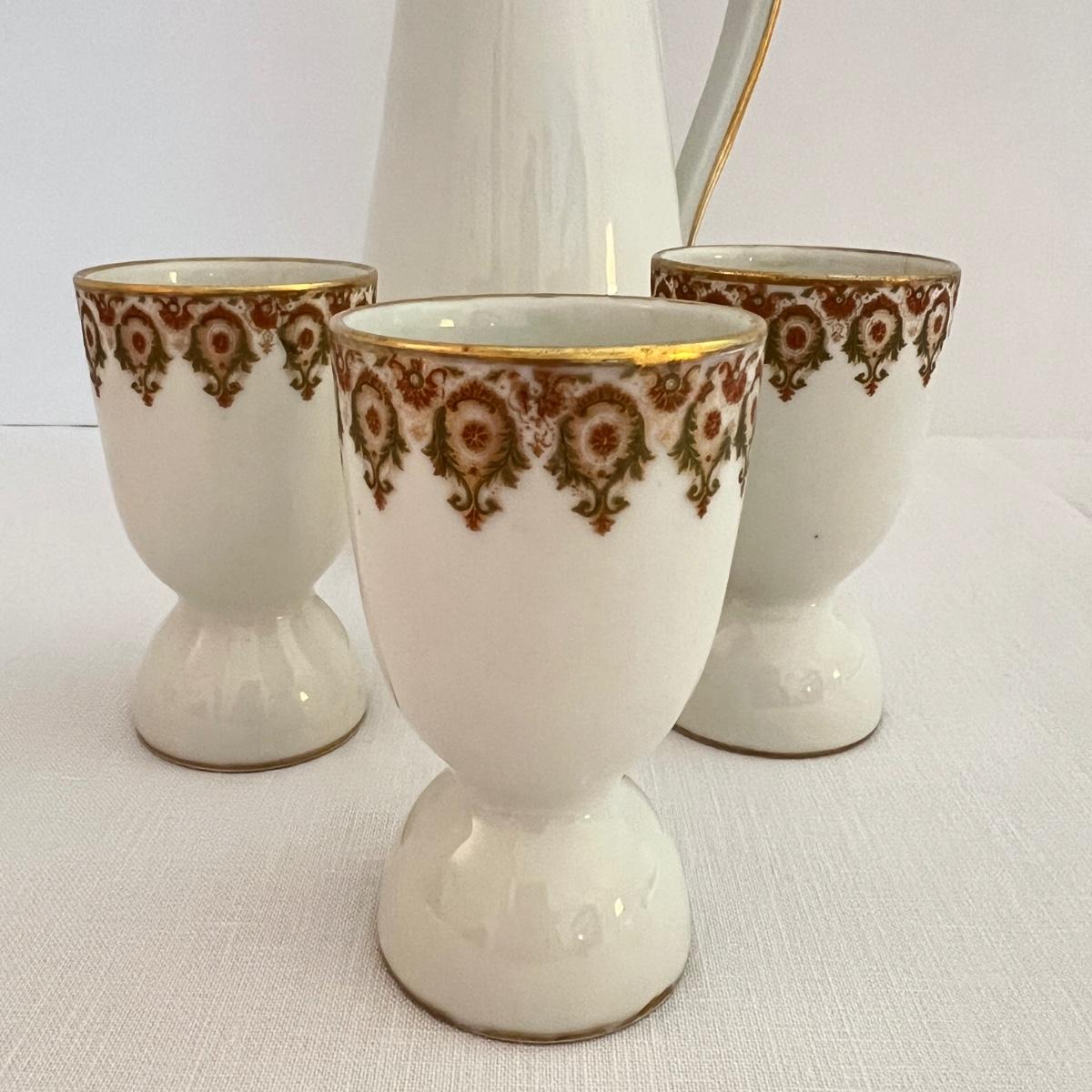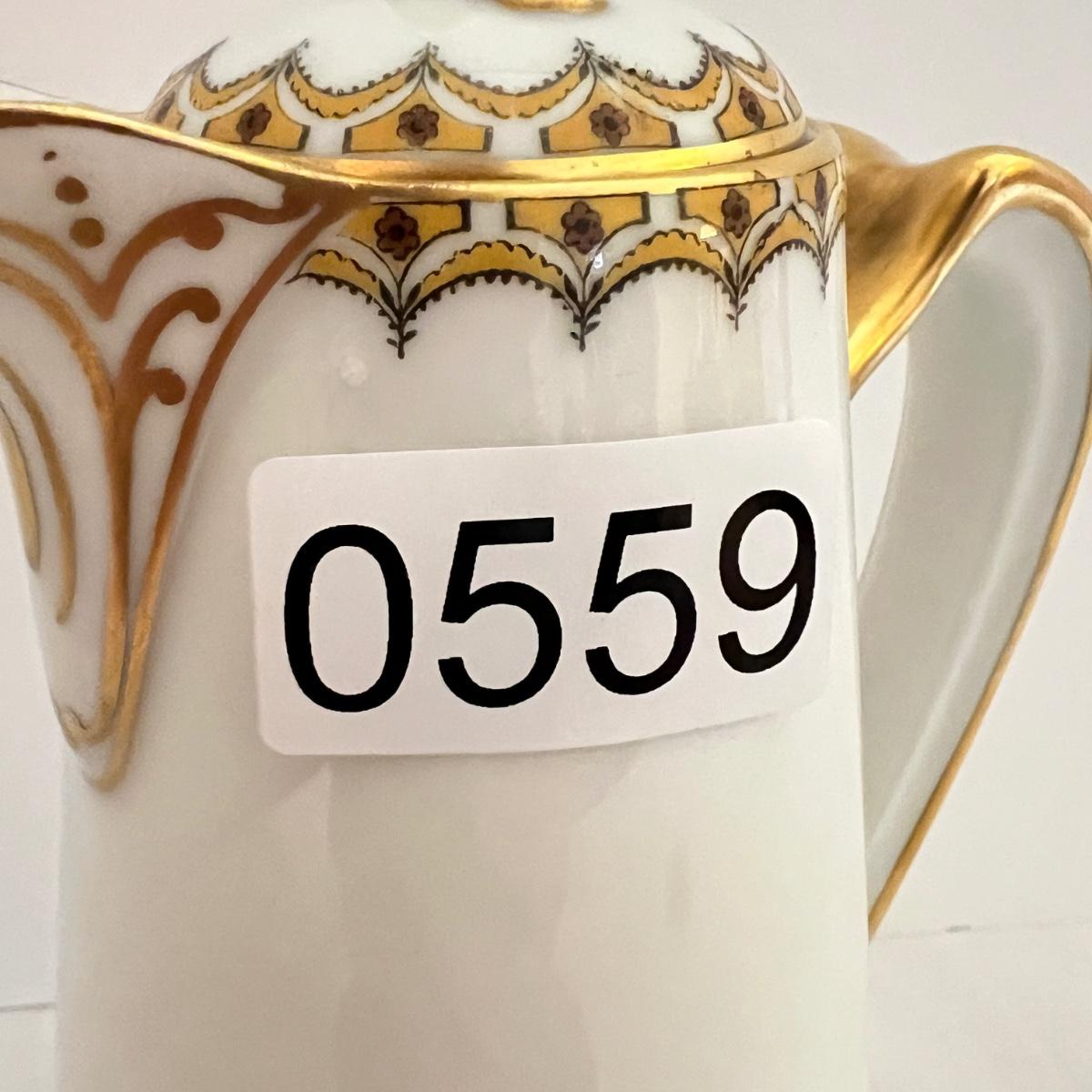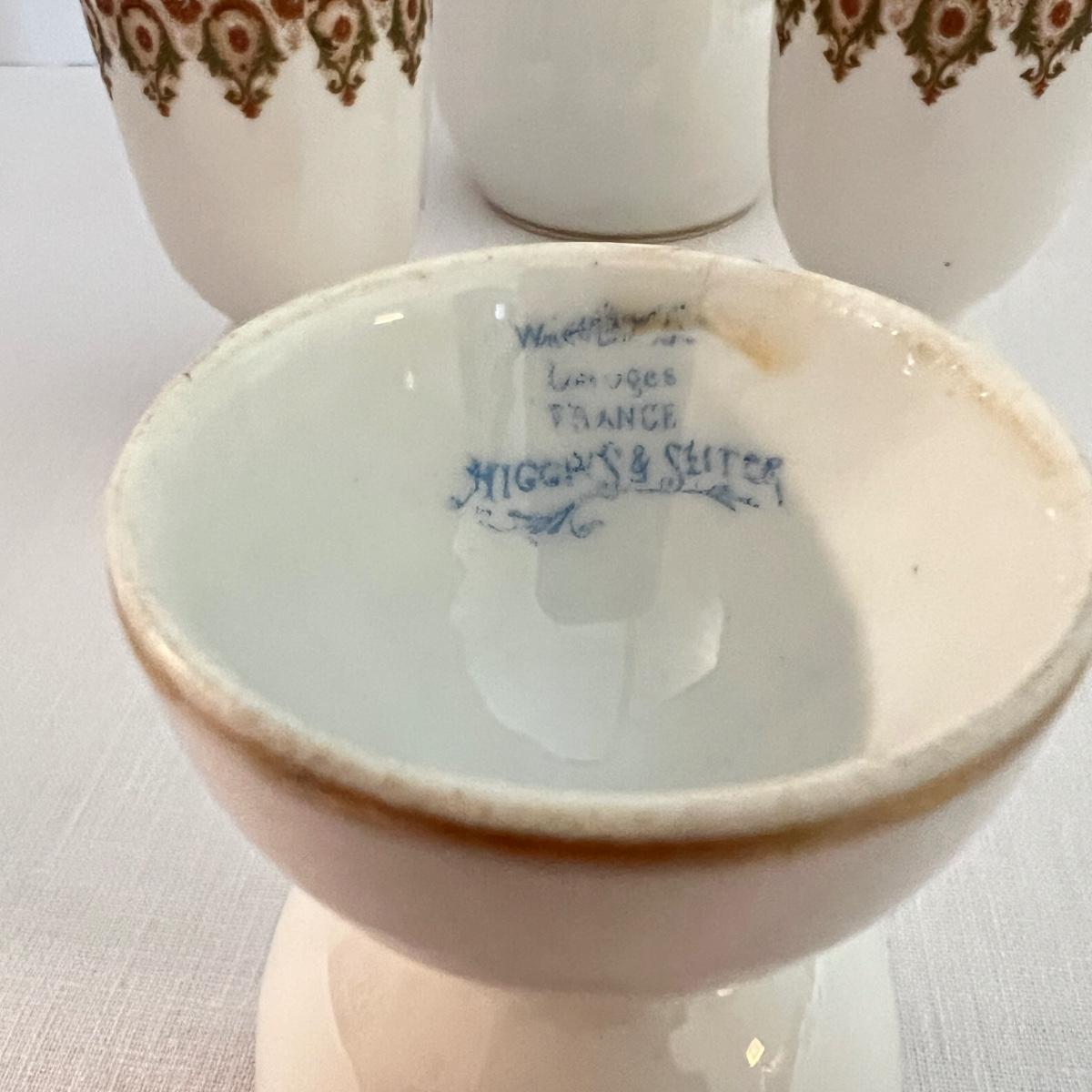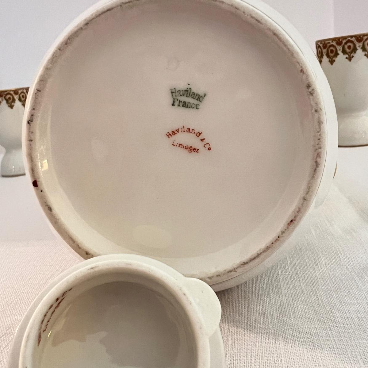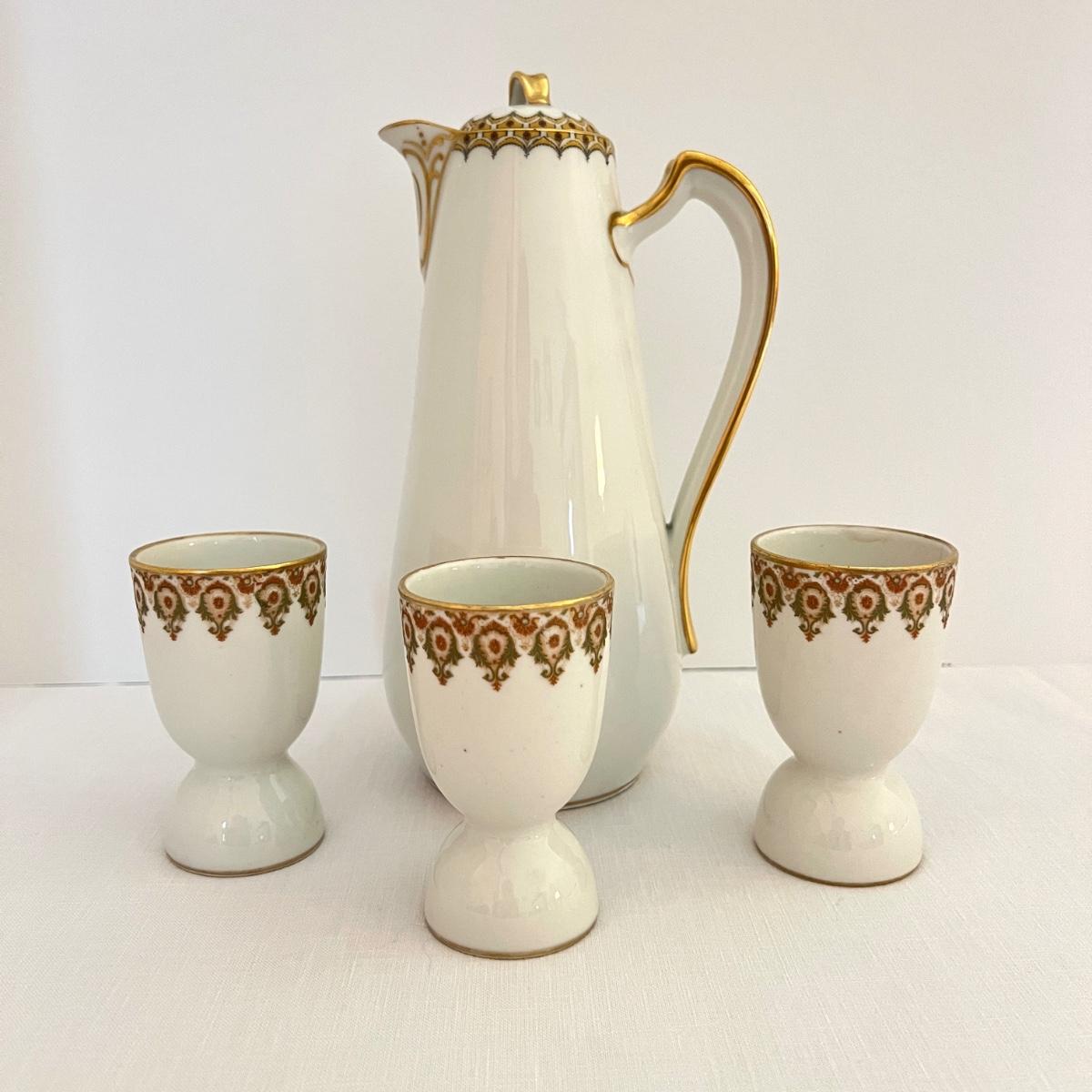 3 antique Higgins & Seiter Limoges France gilded cups. 1 gilded Haviland & Co. Limoges chocolate pot. The pot and the cups do not have the exact same pattern but they do have the same color scheme and work well together.