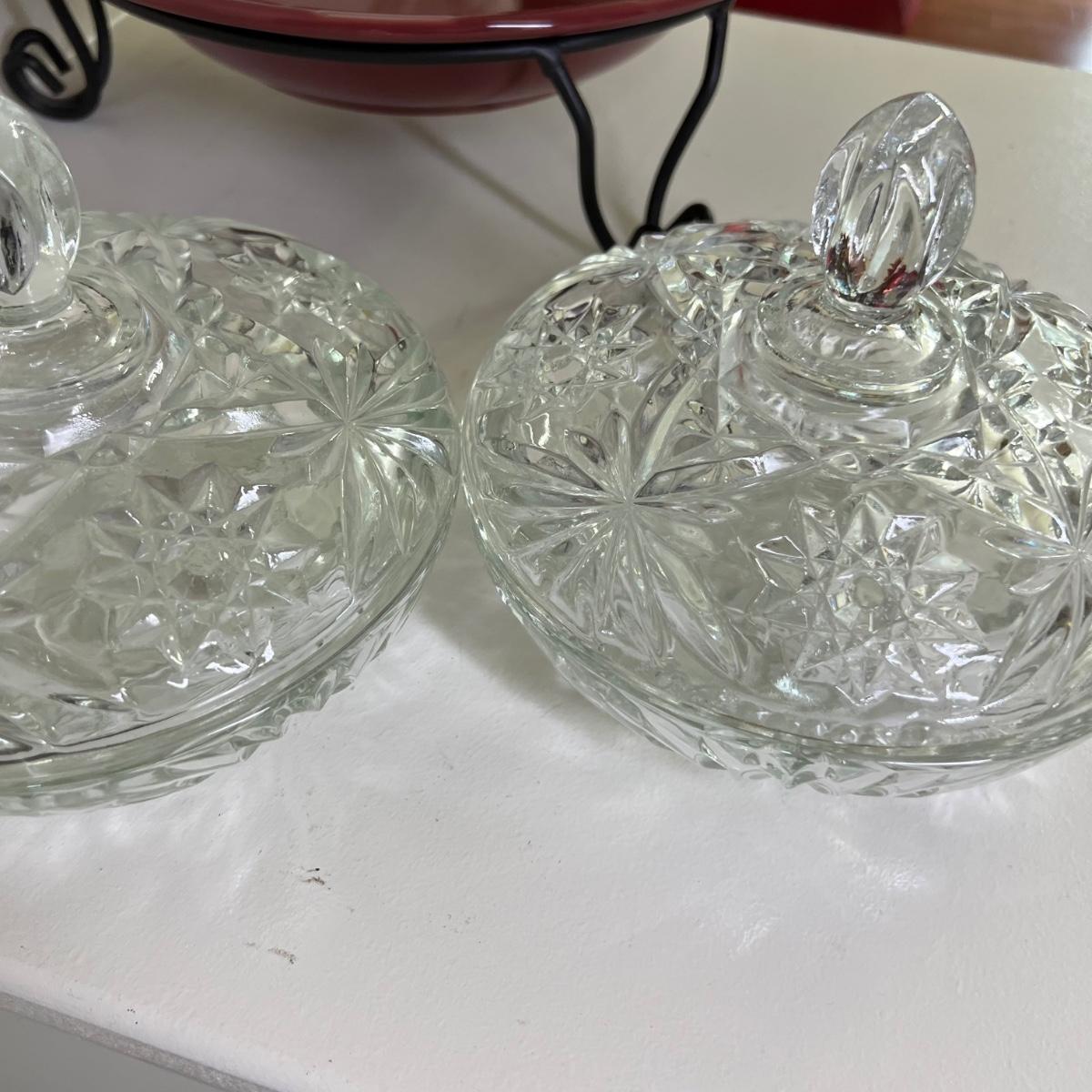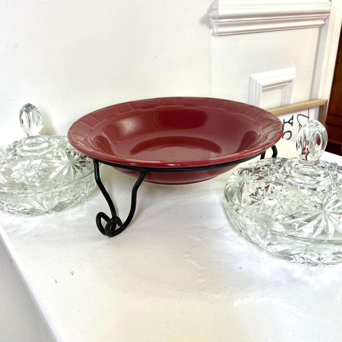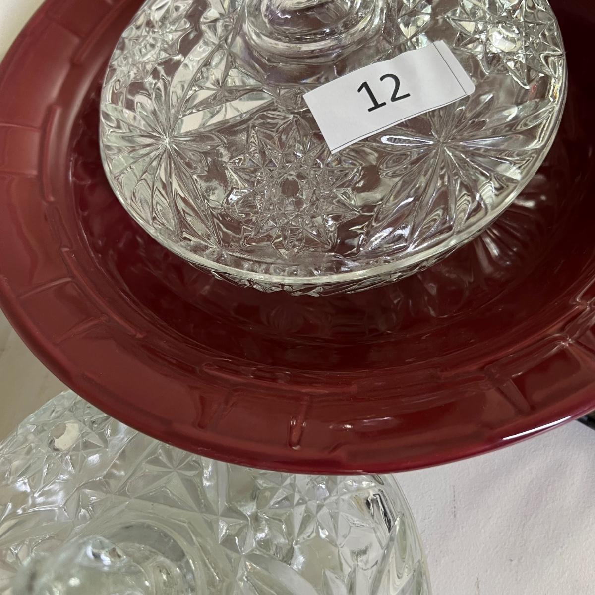 Maroon pottery Longaberger large bowl with stand, 2 star cut glass candy dishes with lids. Great condition.