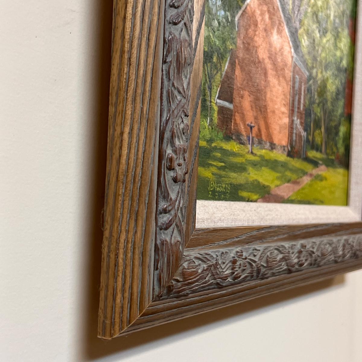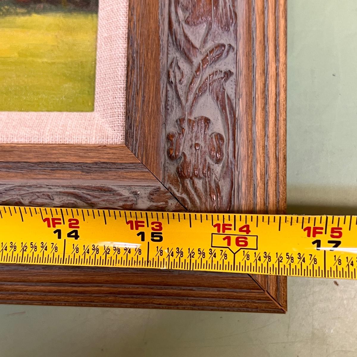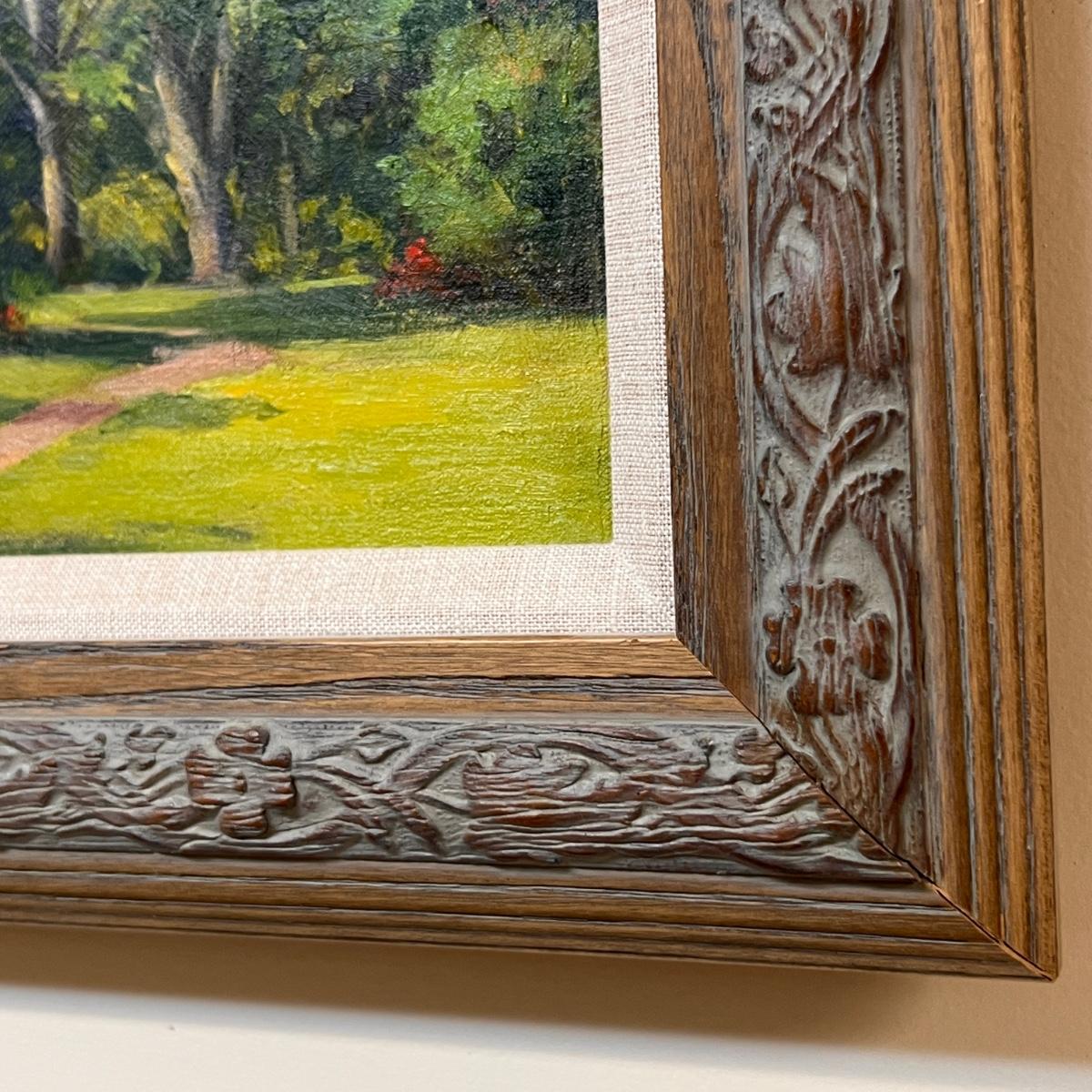 Professionally framed oil house portraiture painting with linen linter mat. The details in the floral carved wooden frame are gorgeous. We listed another similar painting with the same frame that would look very nice as a set.