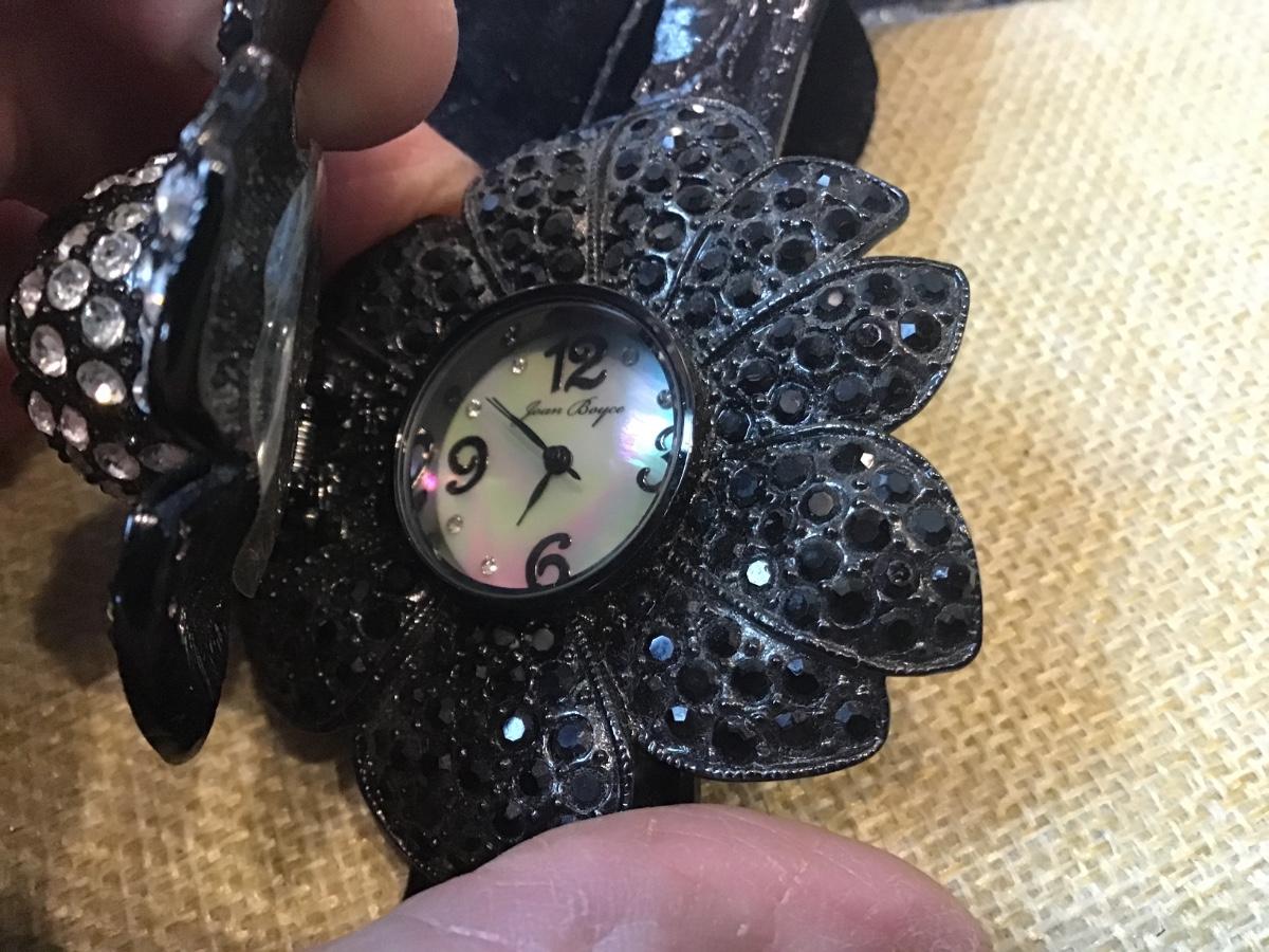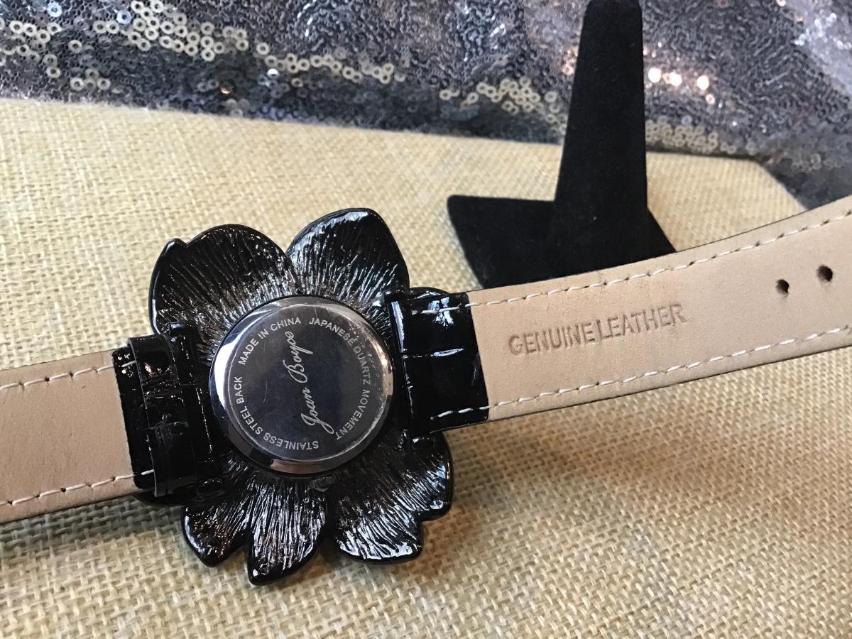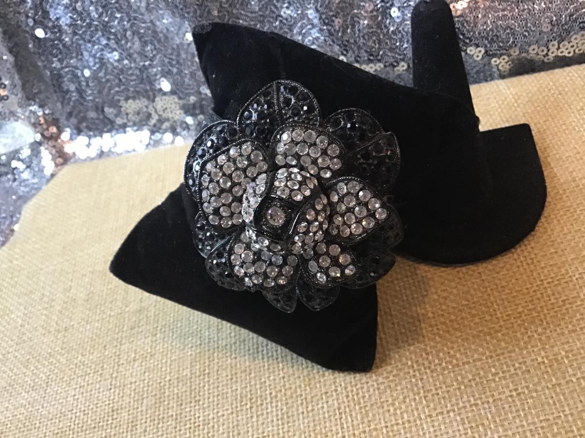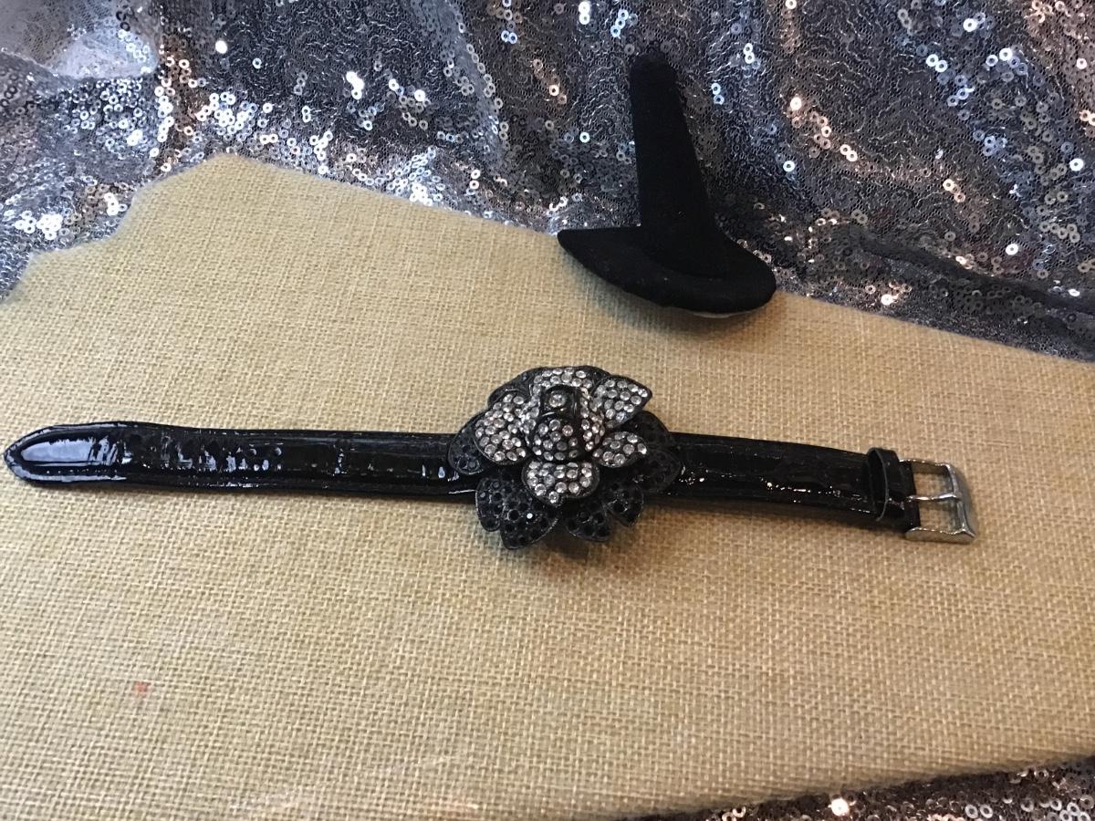 HSN Joan Boyce HematiteTone "Rosette Pave Black Crystal Leather Bracelet Watch