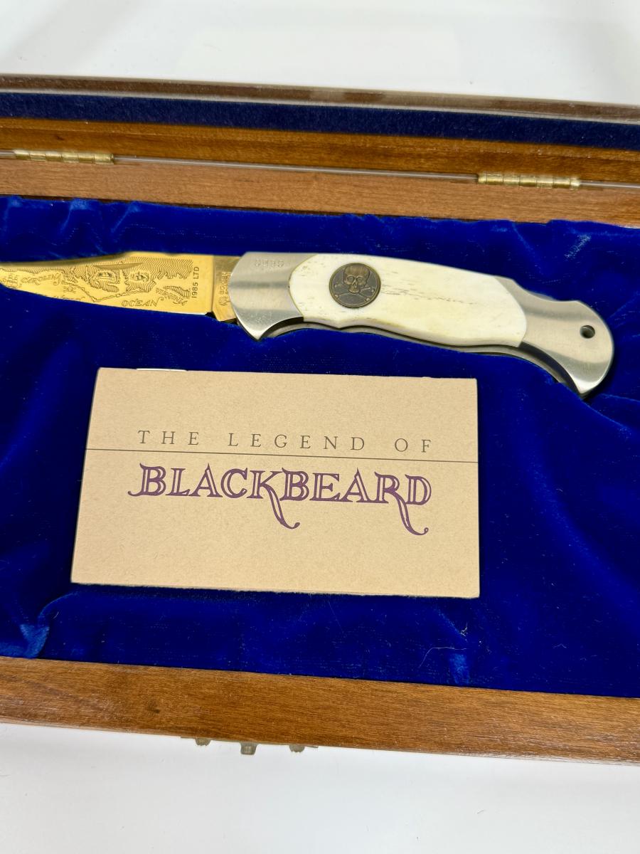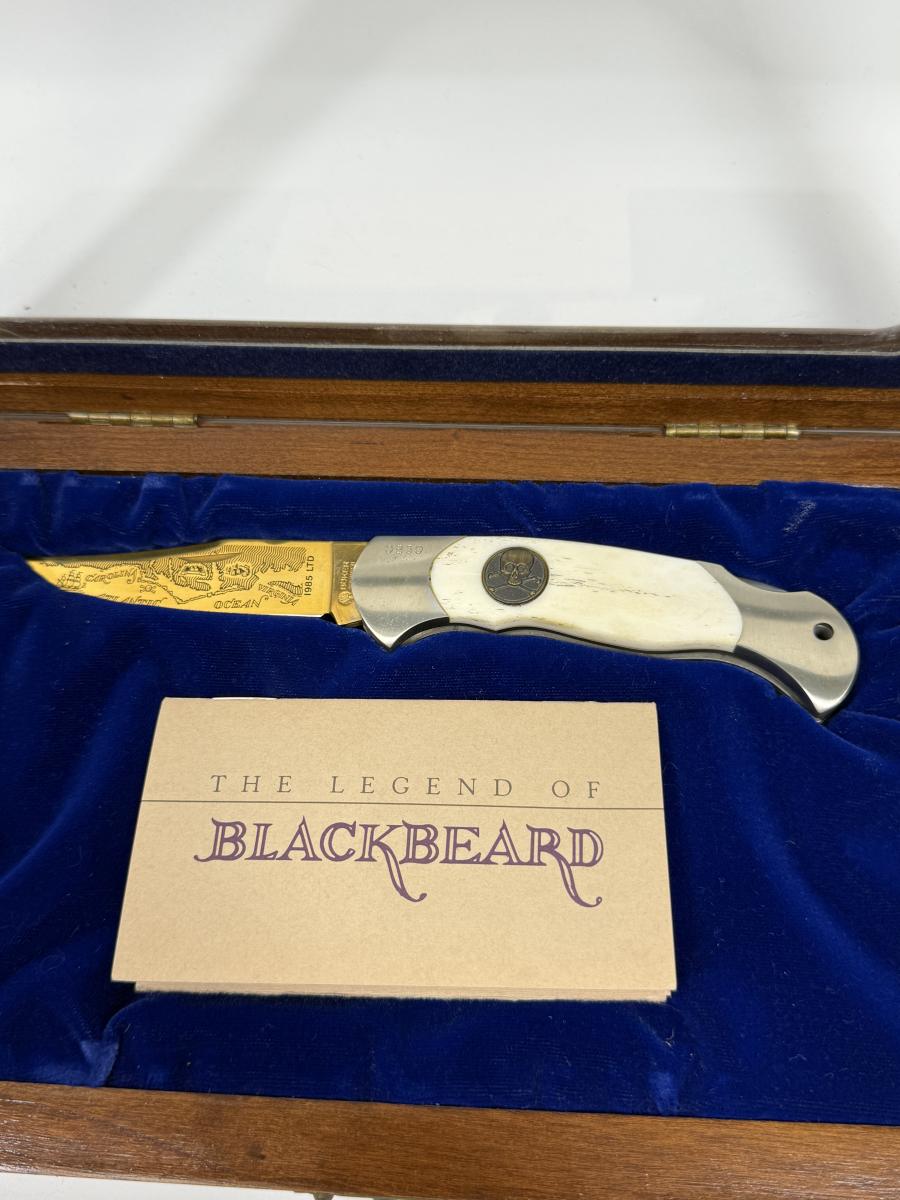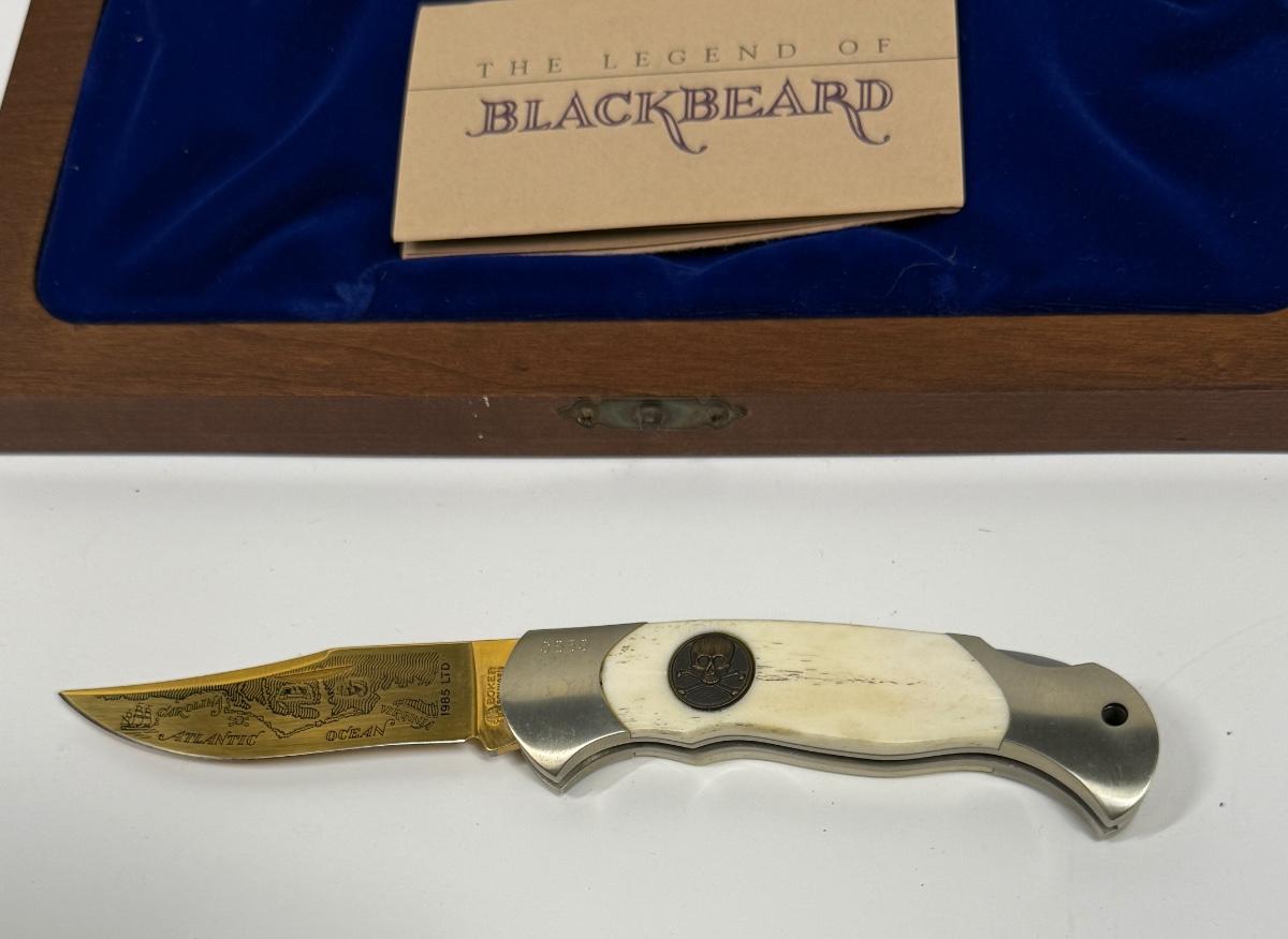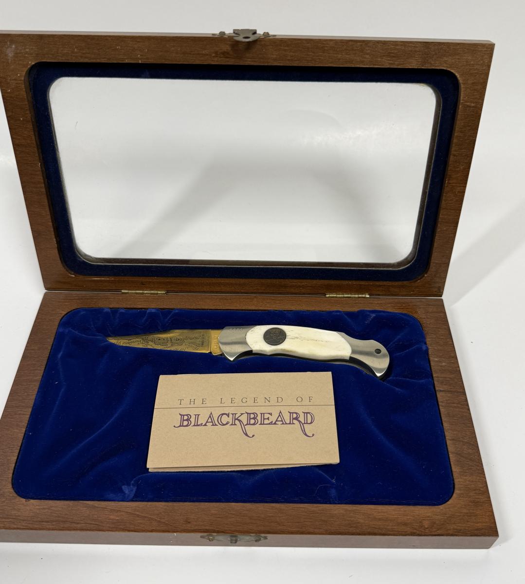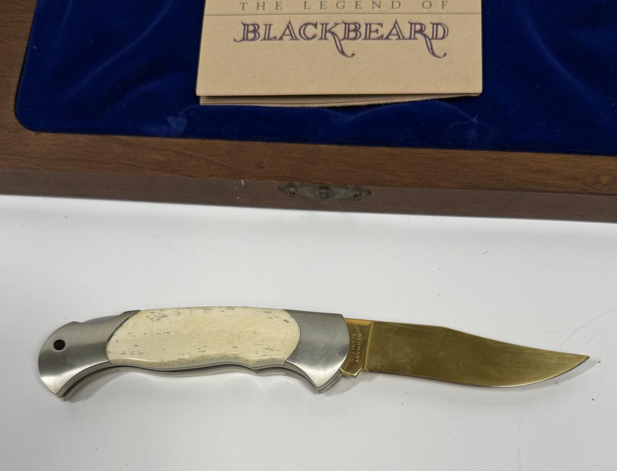Legend of Blackbeard Lockback Pocket Knife Gold Color Blade w/ Treasure Map Etched skull and crossbones Germany