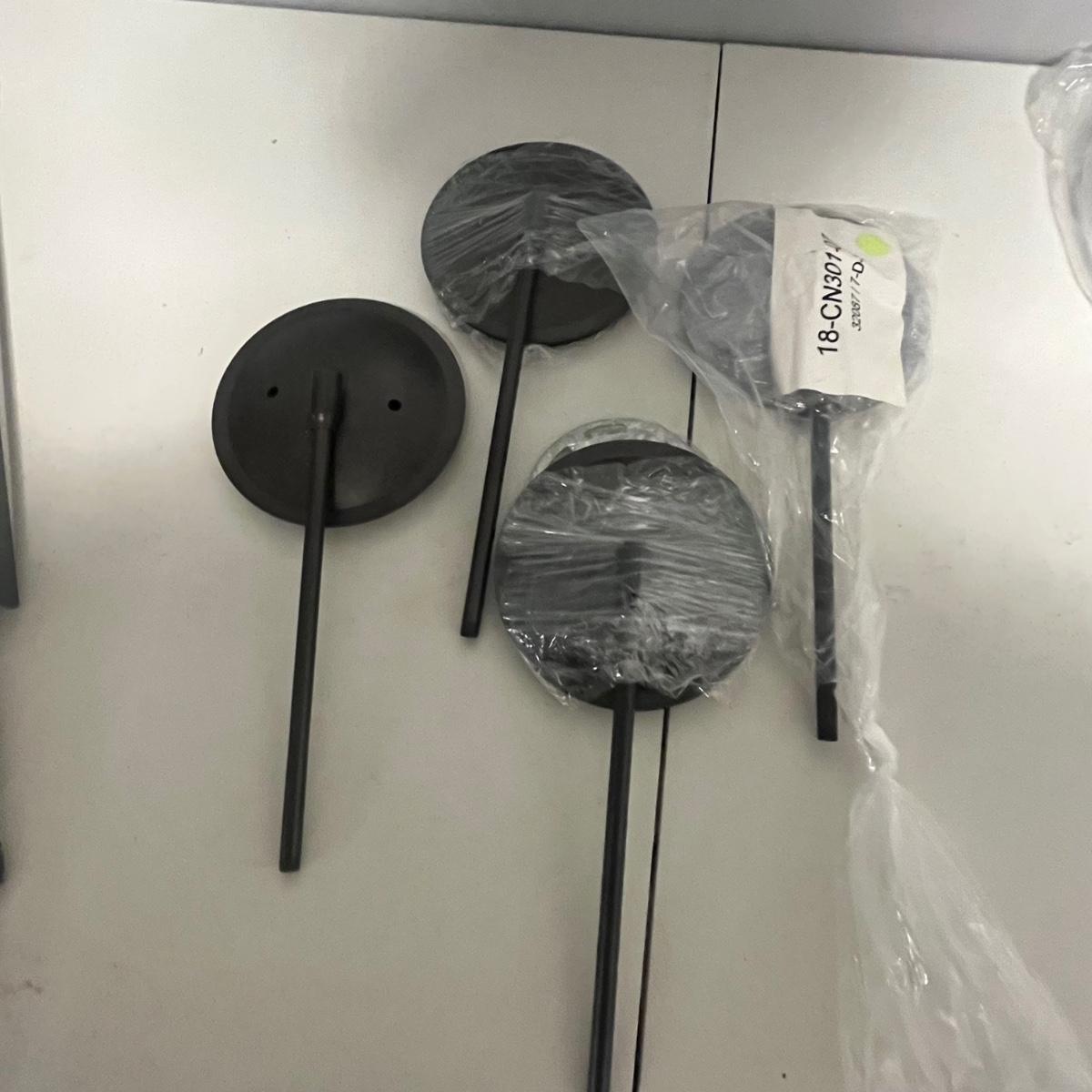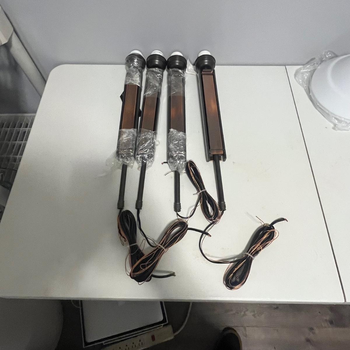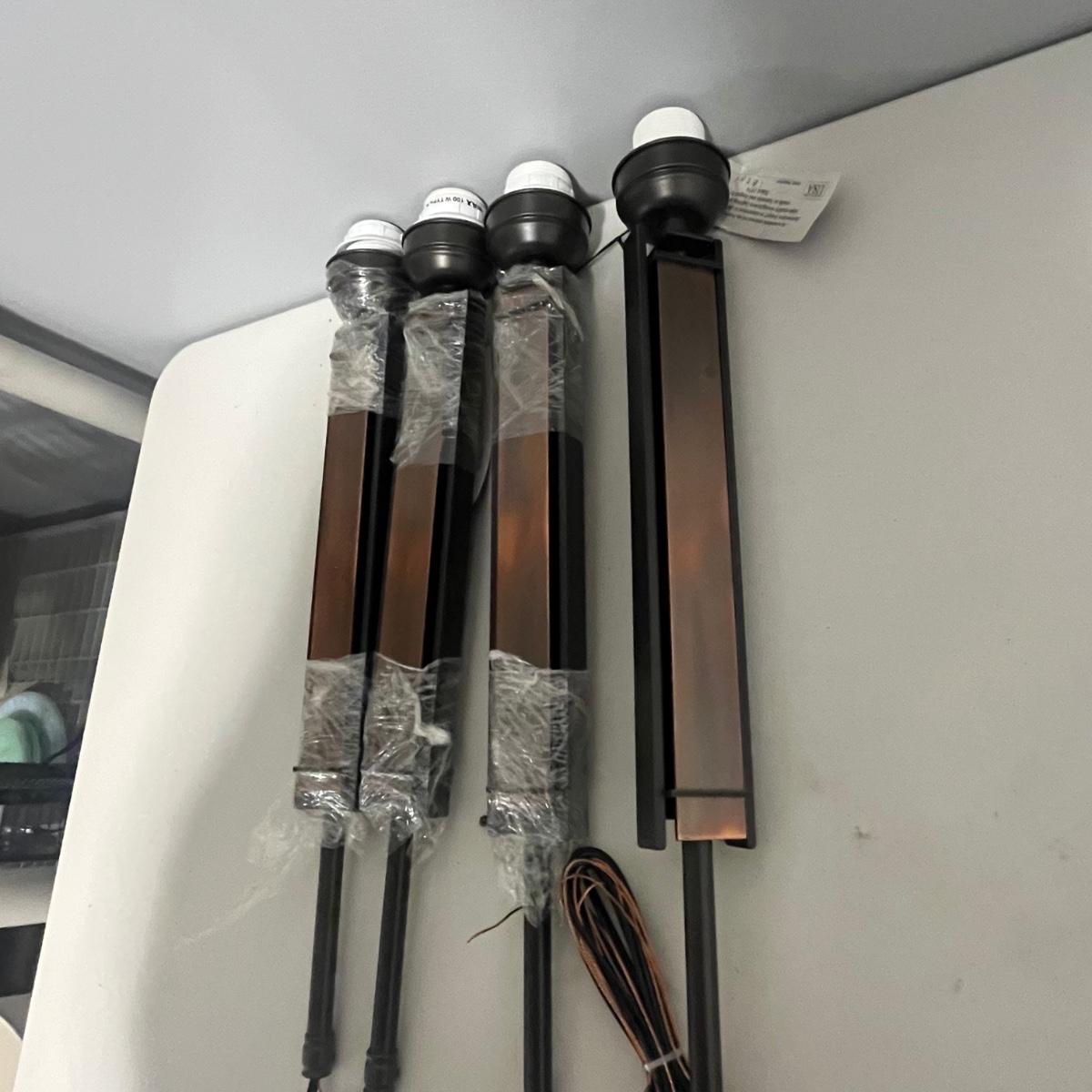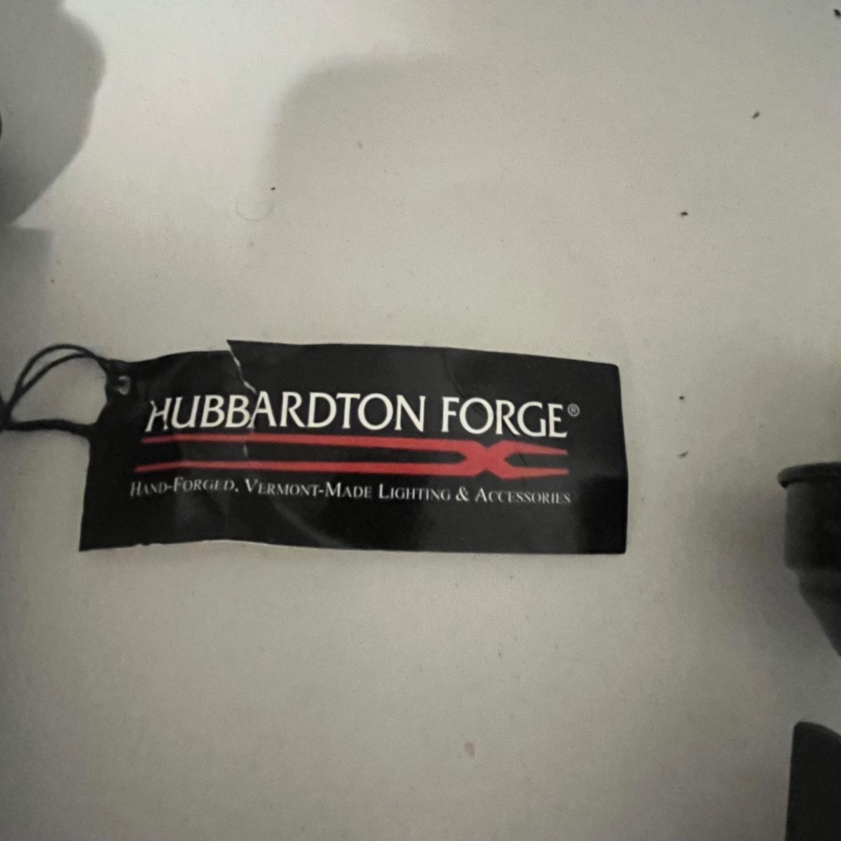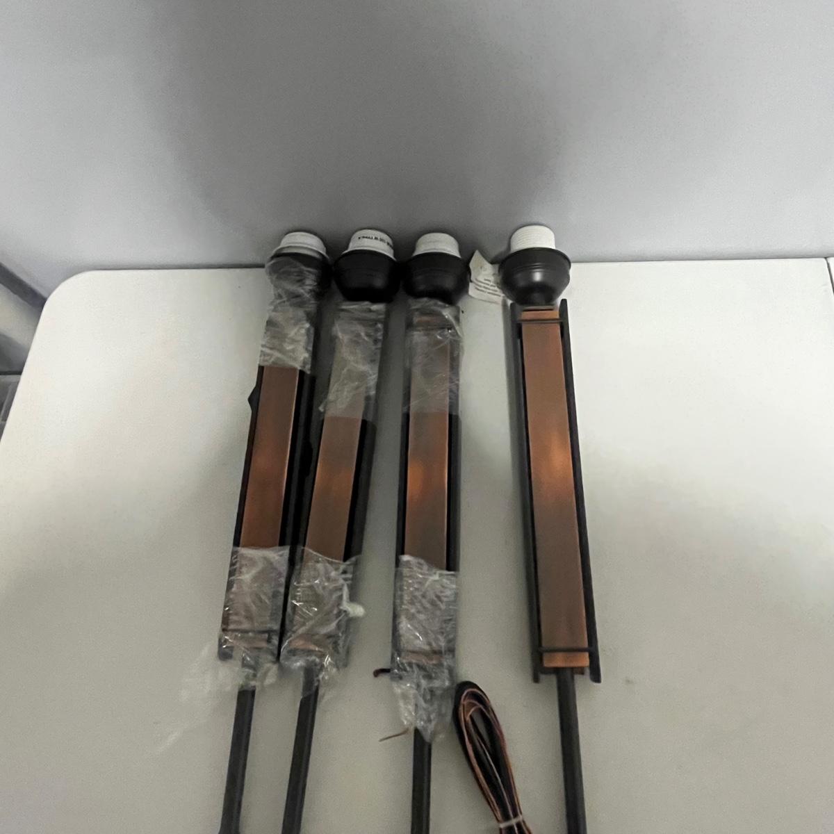 Lot includes four copper and steel Hubbardton lights with four glass shades and mounts. One shade is different than the other three, see pictures. Fixtures measure 2” x 1” x 20”H without shade.