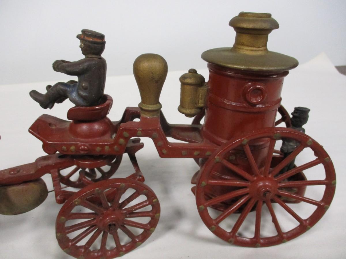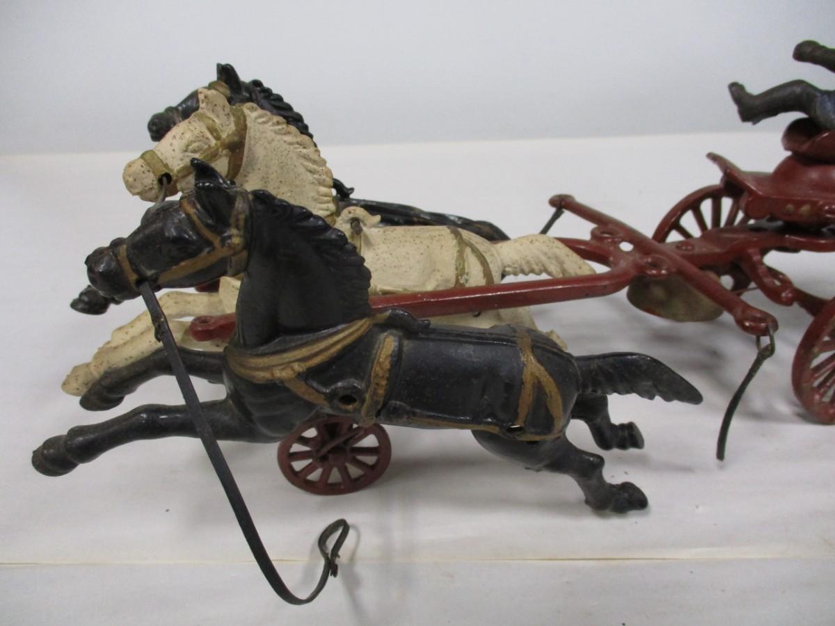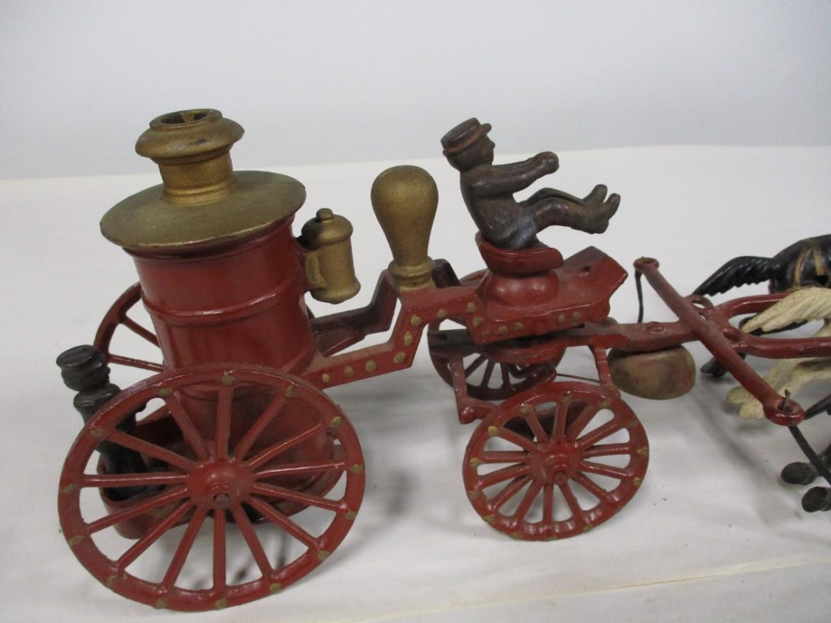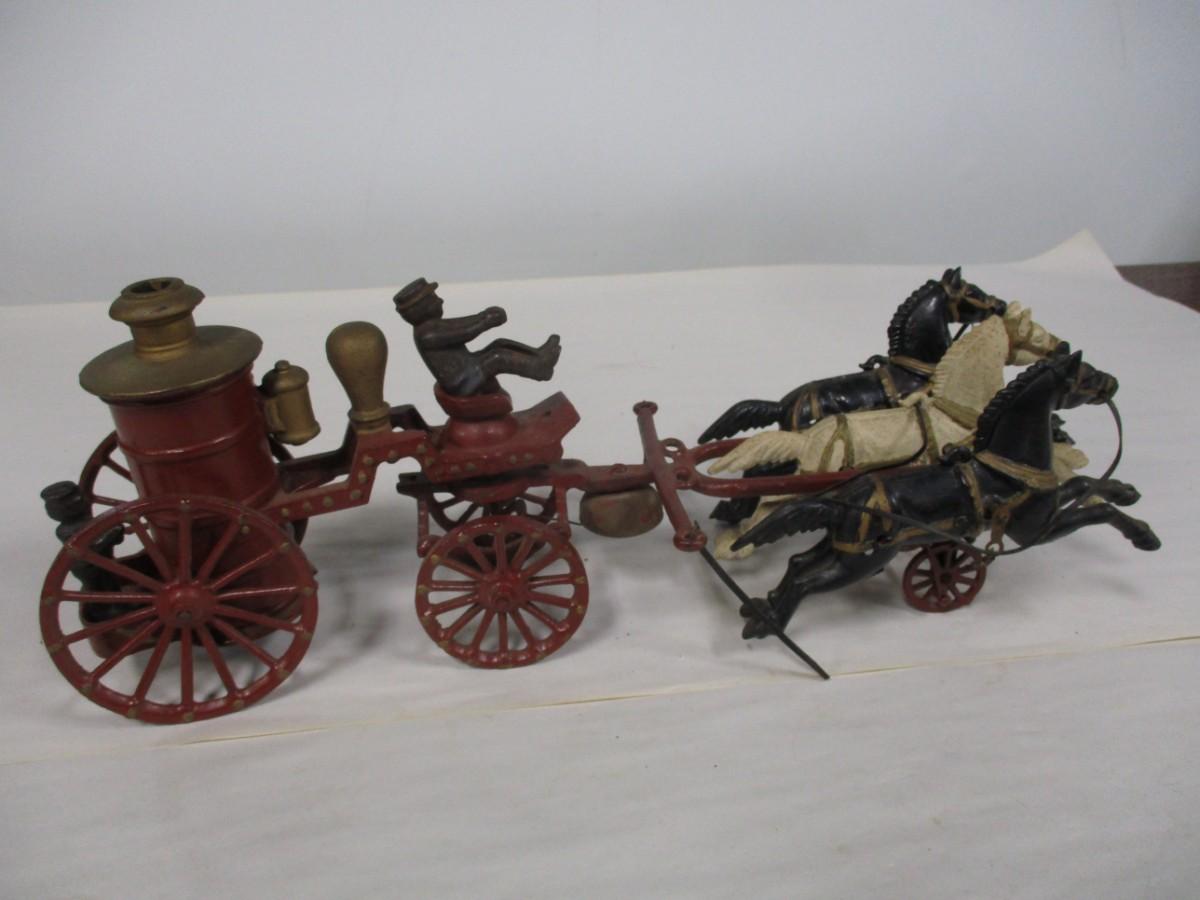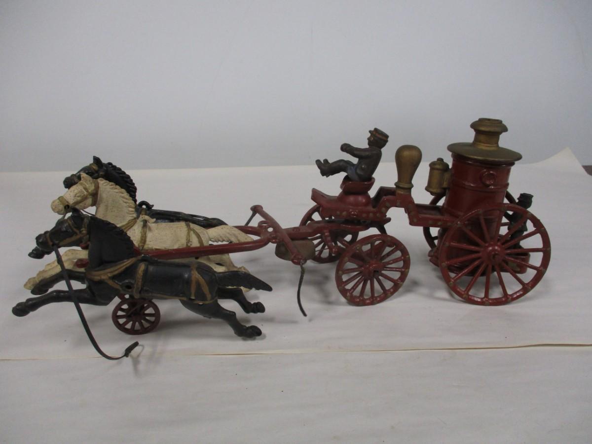 Vintage Hubley Cast Iron Double Horse Team Drawn Fire Truck with Driver & Rider