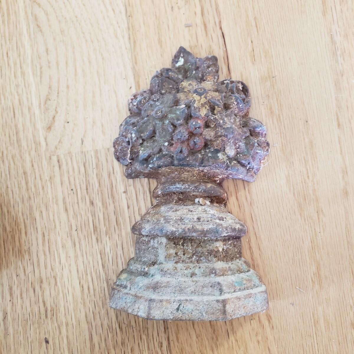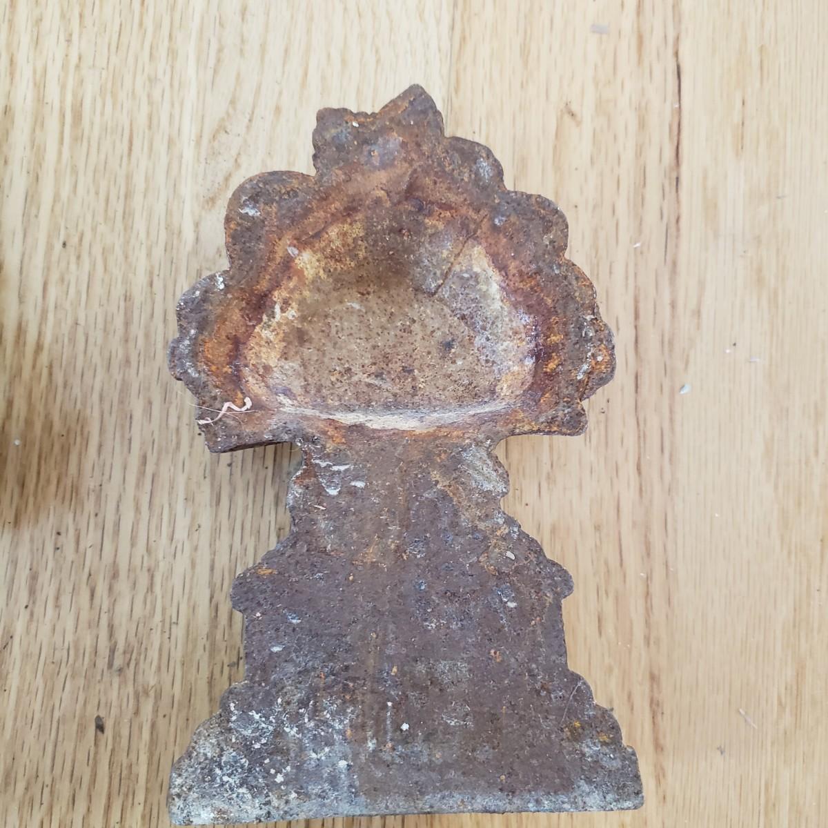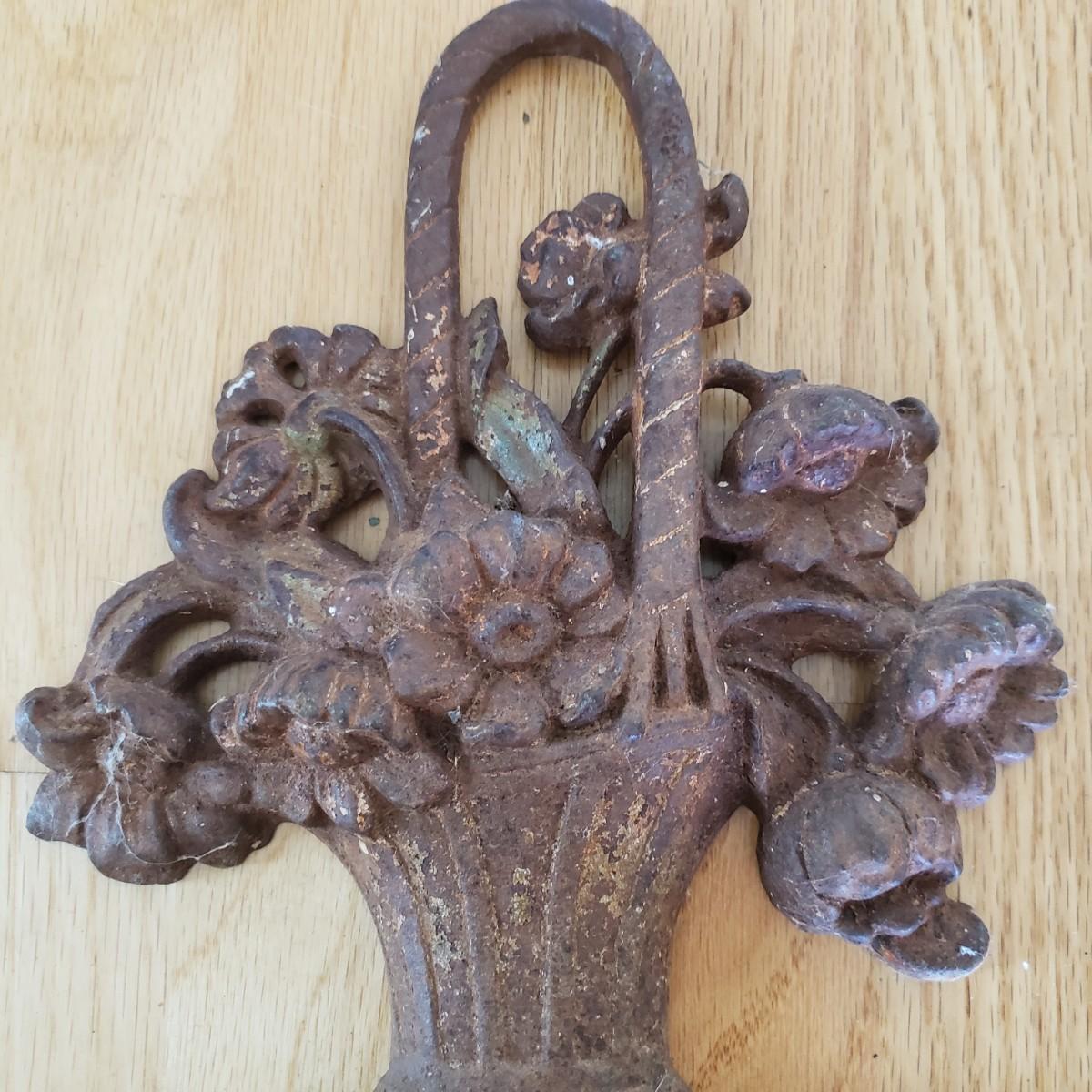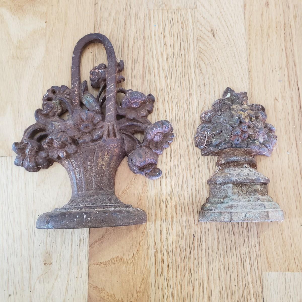 This lot contains two cast iron door stops. The largest one is a Hubley-like basket door stop measuring 8" x 2" x 9"H. It has rusted over. The smallest one has flowers on top. It too has rust, adding to it's charm.