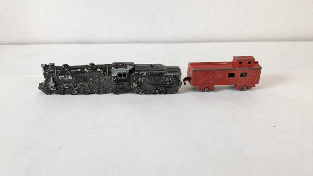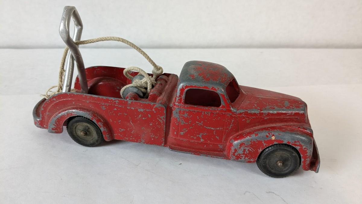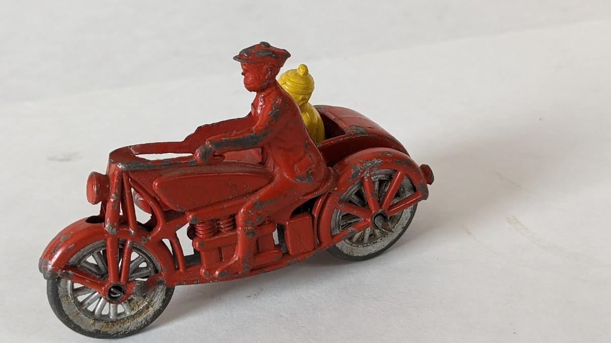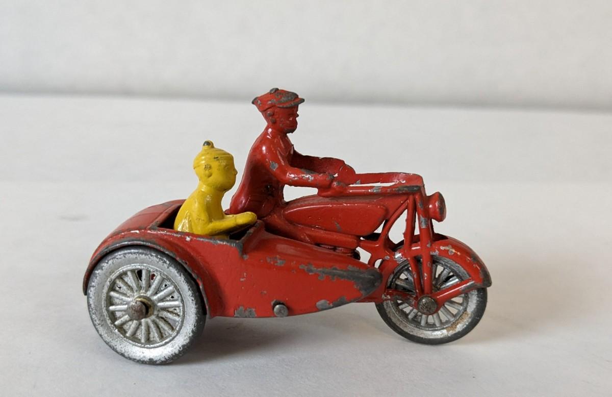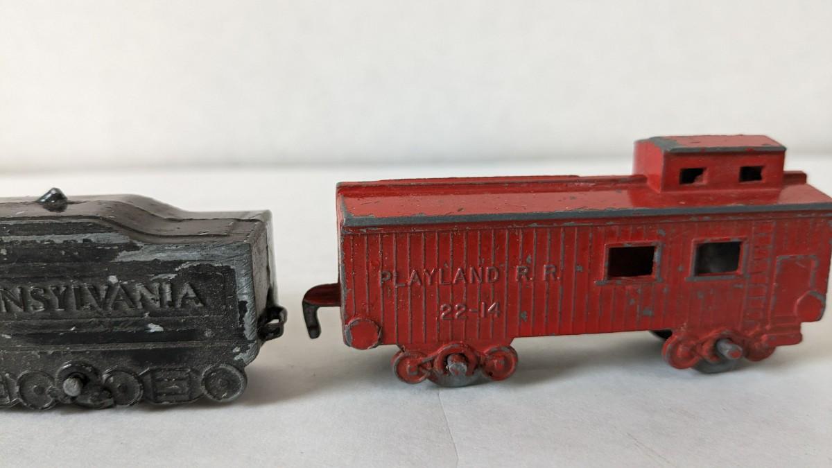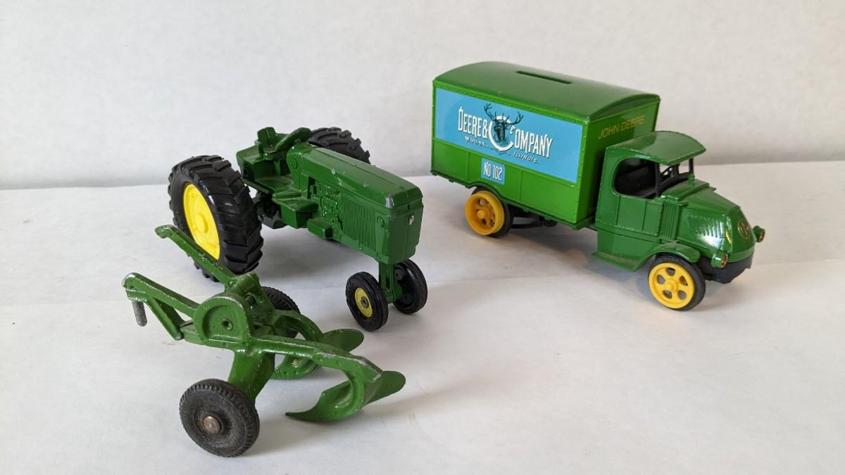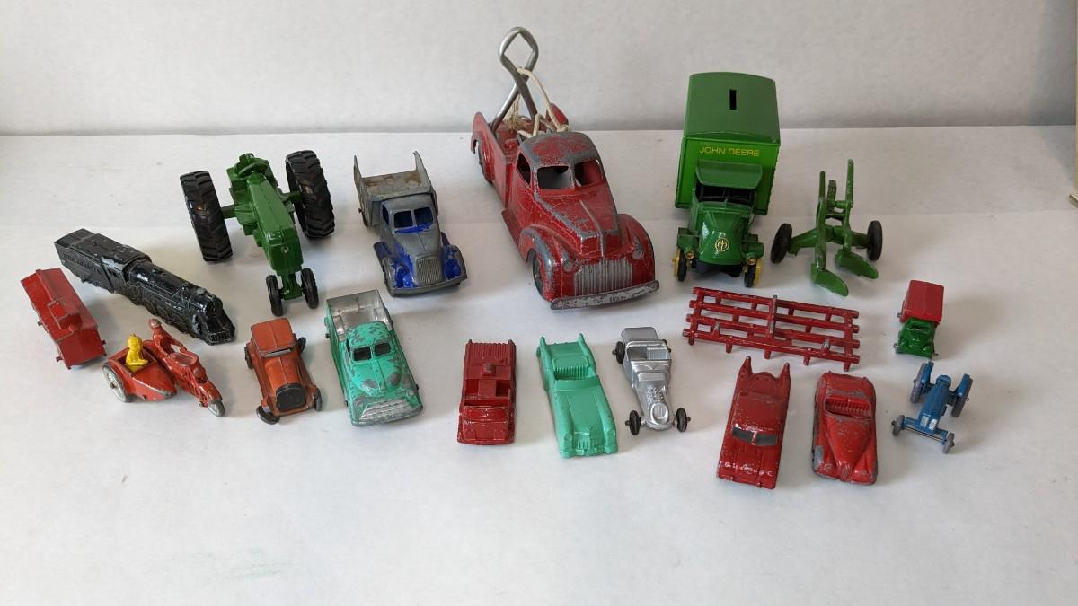 some lovely cast toy cars, trucks, and even a train! Some neat pieces in here including Toot sidecar piece, Hubley wrecker truck, Ertl John Deere No. 102 bank, and varied other unmarked pieces. All show varied signs of paint loss and wear as noted in photos.