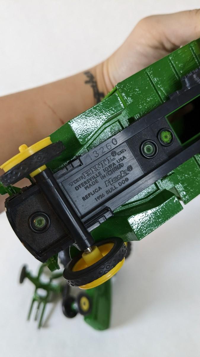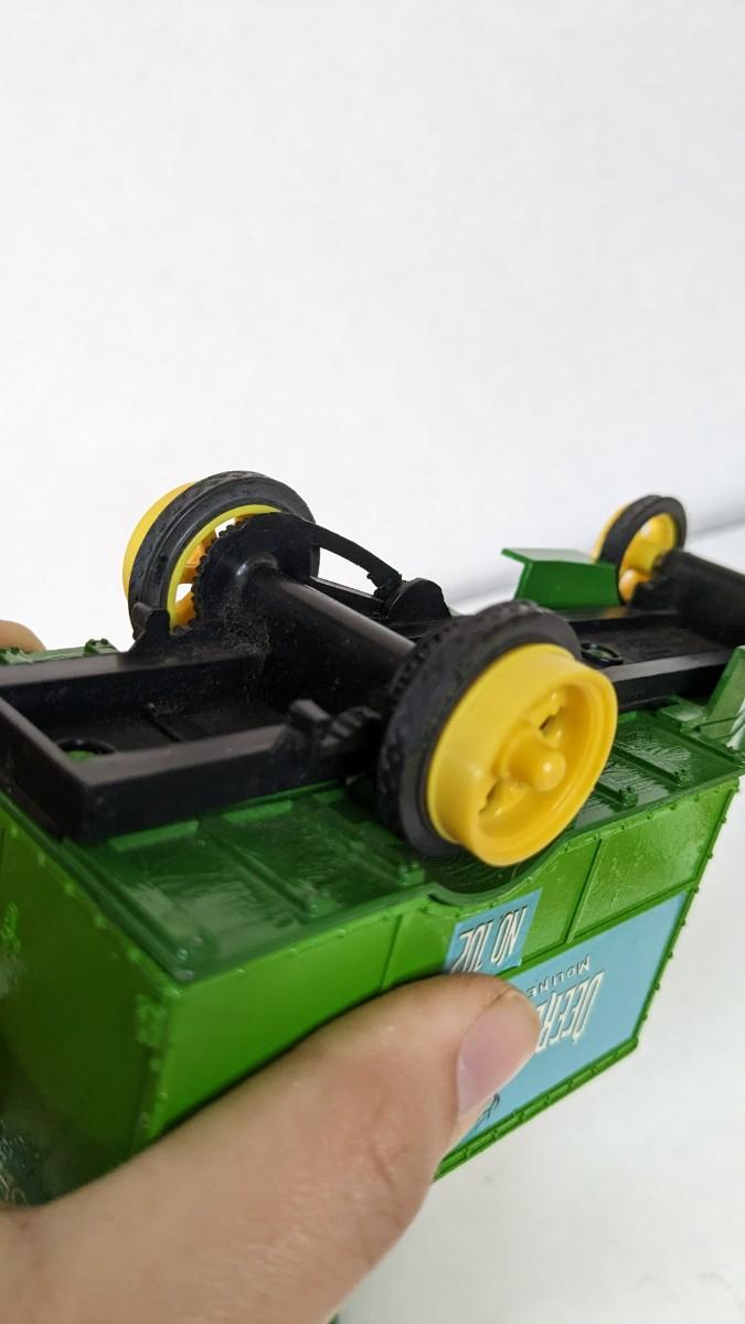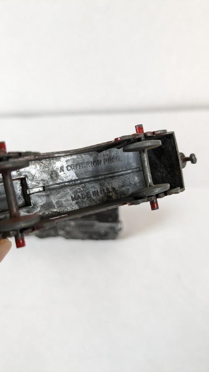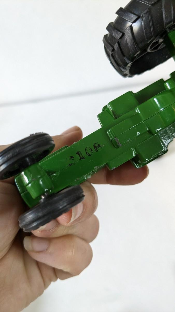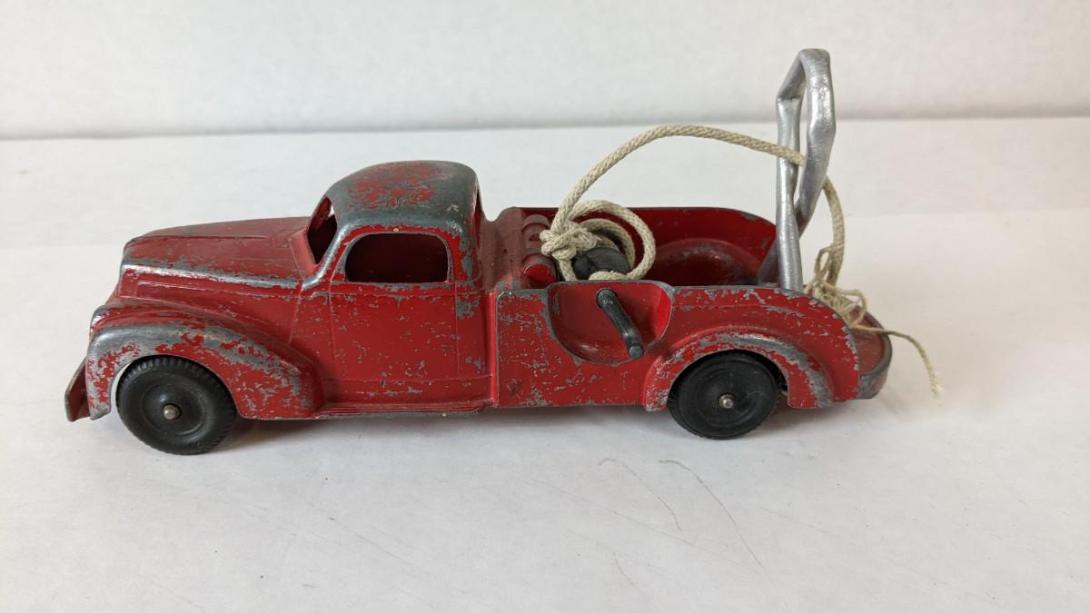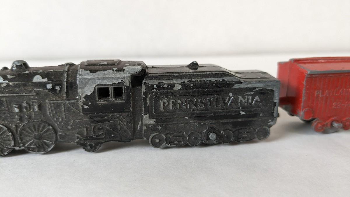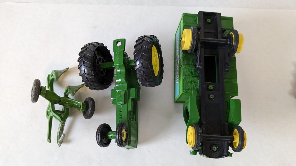 some lovely cast toy cars, trucks, and even a train! Some neat pieces in here including Toot sidecar piece, Hubley wrecker truck, Ertl John Deere No. 102 bank, and varied other unmarked pieces. All show varied signs of paint loss and wear as noted in photos.