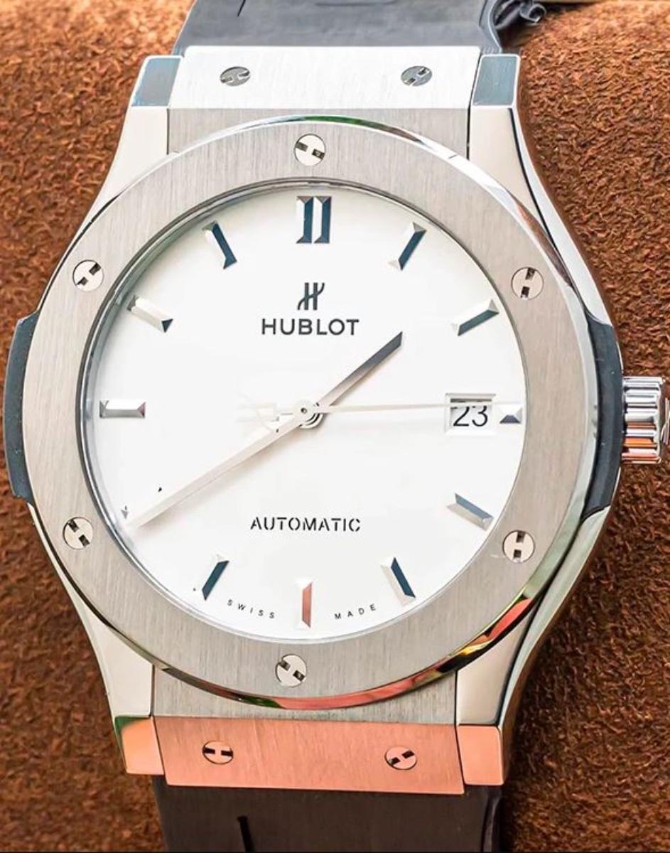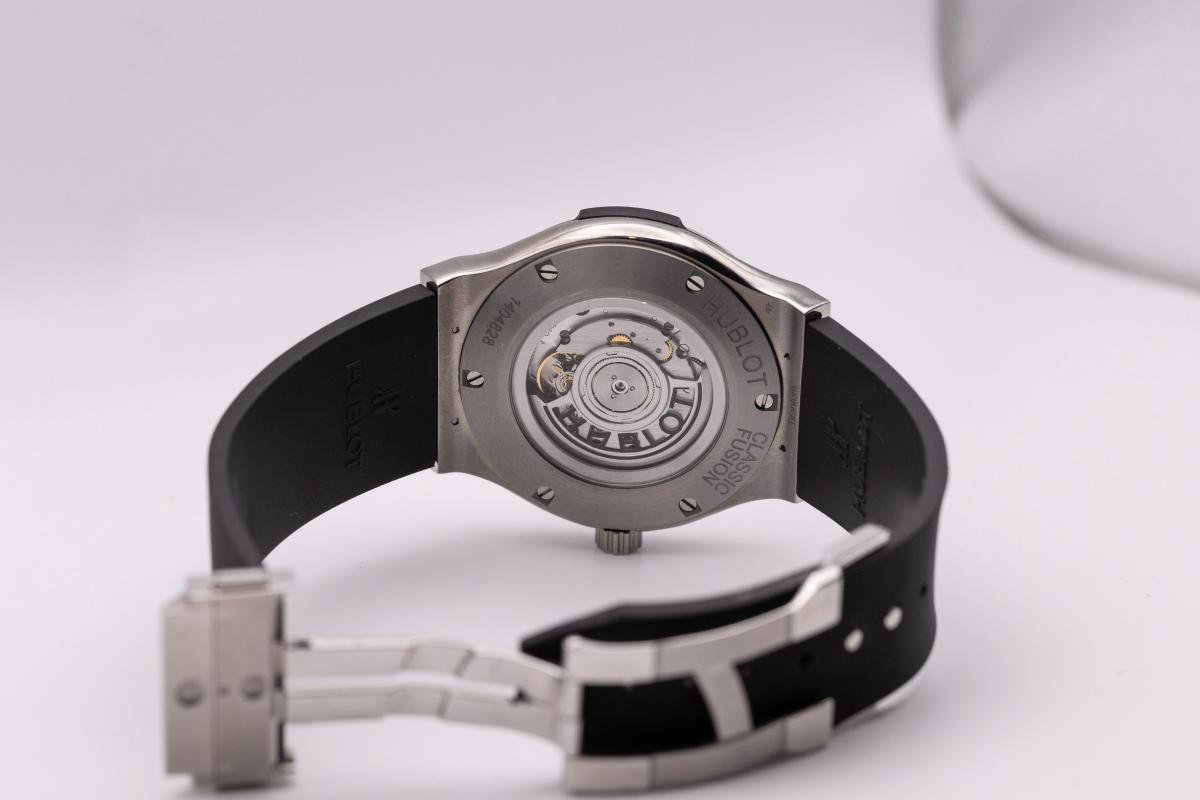 Hublot Classic Fusion with a pristine white face is one of my favorite timepieces luxury and elegance in every detail. This timepiece is in impeccable condition, showing no signs of wear, reflecting the craftsmanship and quality of Hublot watches. The sleek design and modern aesthetic of the Classic Fusion make it a timeless accessory, perfect for any occasion conversation starter. With its precise movement and durable construction, this Hublot watch is not just a timekeeping device, but a statement of sophistication and refinement. Wear it with pride and confidence, knowing that you have a truly exceptional timepiece on your wrist. The Hublot Classic Fusion combines brushed and polished titanium in its case and bezel, offering a refined aesthetic. With an opaline white dial, numeral-free for a minimalist look, and a comfortable rubber bracelet, this timepiece is powered by the Automatic HUB1112 movement with a 42-hour power reserve. Box, manual and carry bag included.