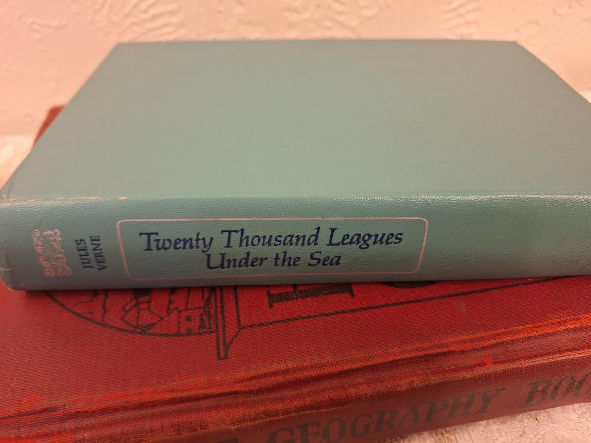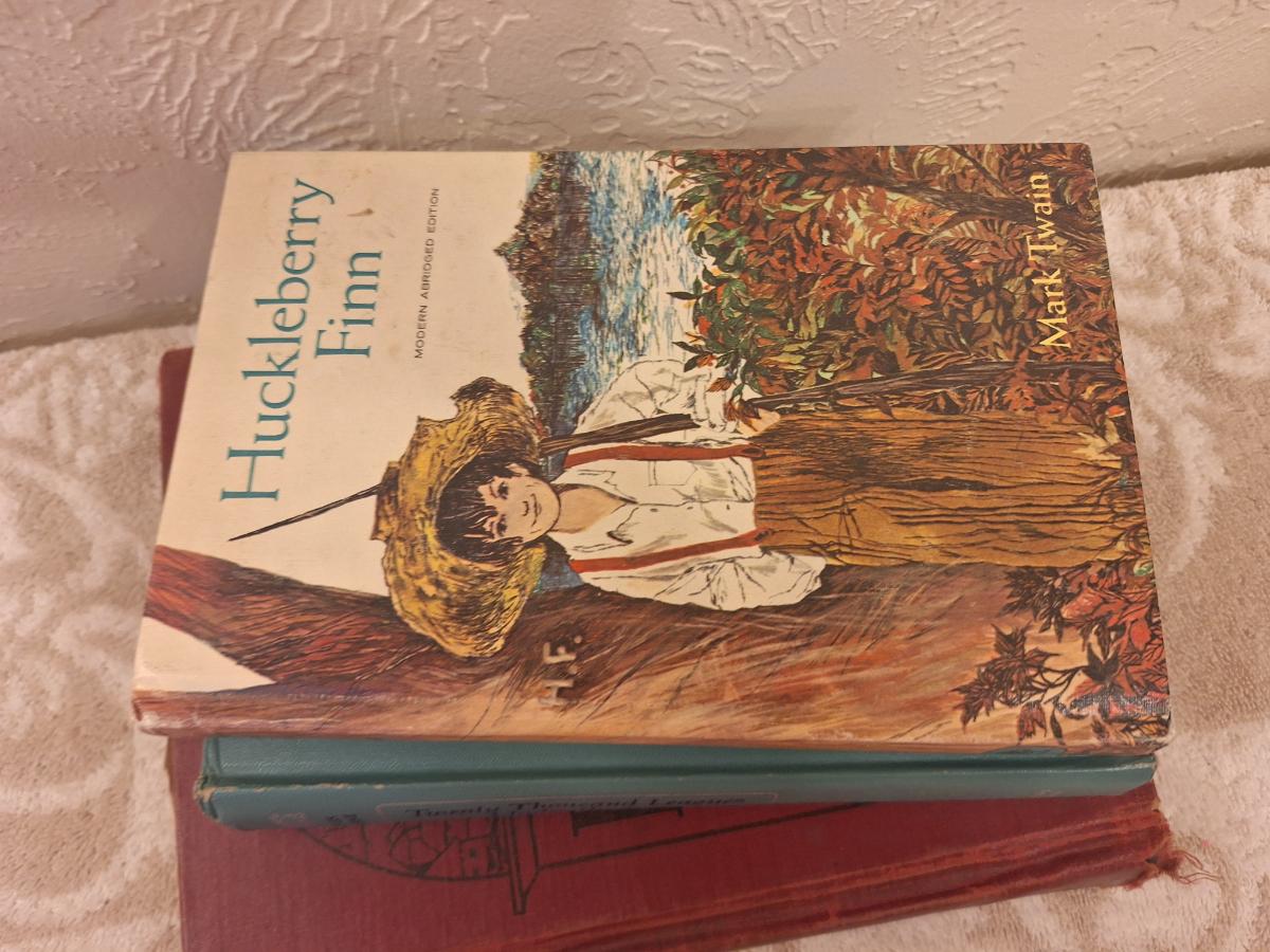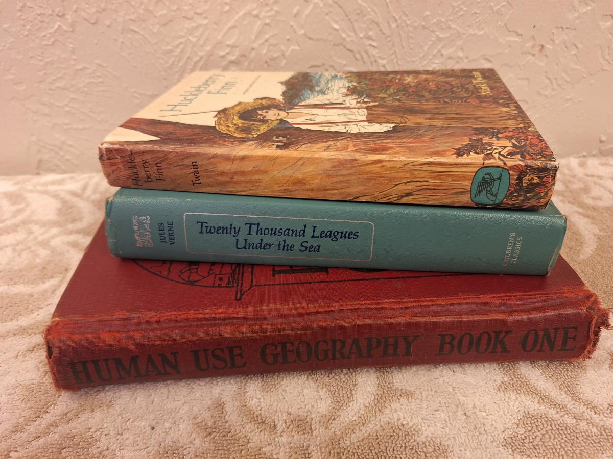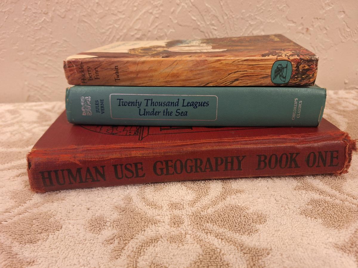 Huckleberry Finn, Twenty Thousand Leagues Under the Sea and Human Use Geography books.
