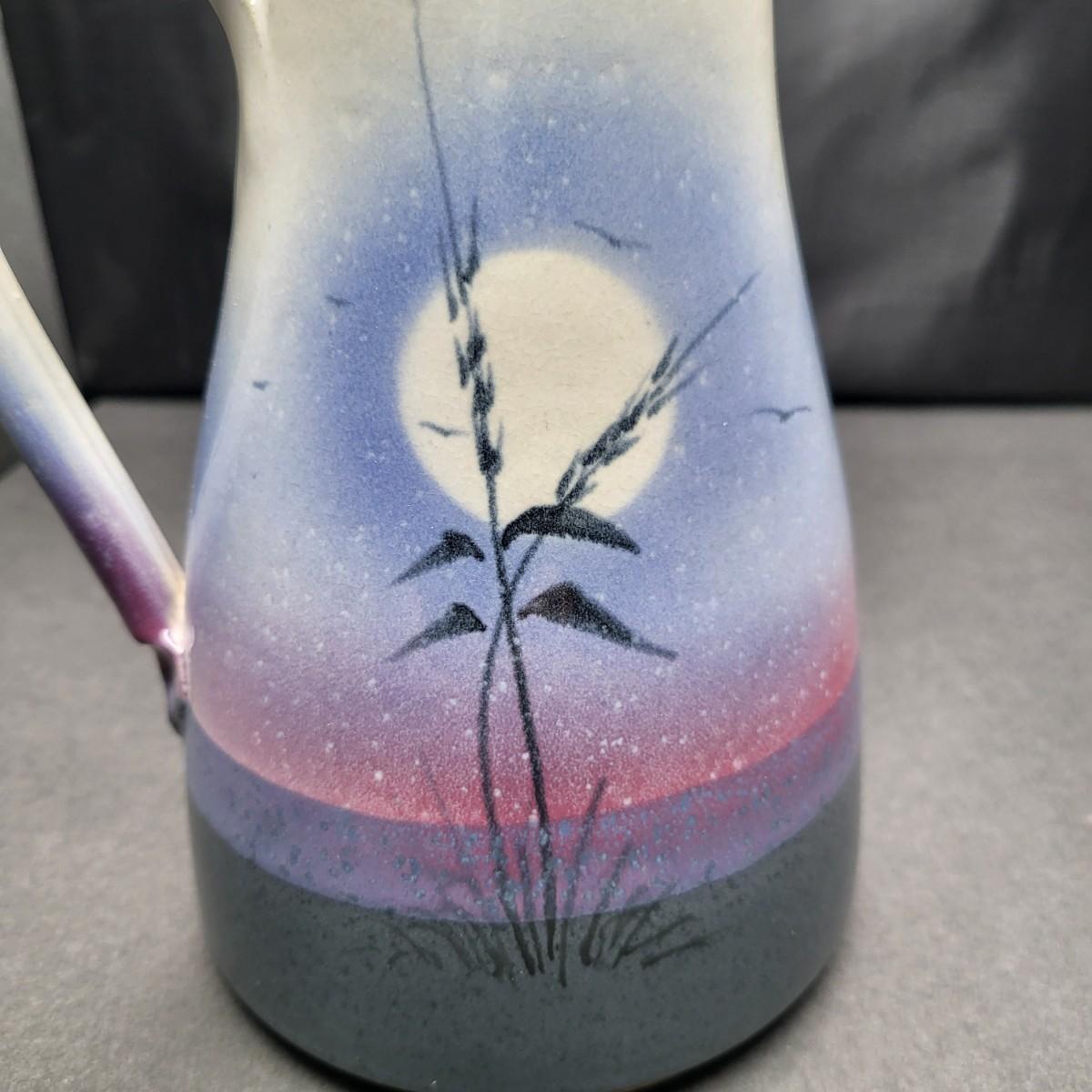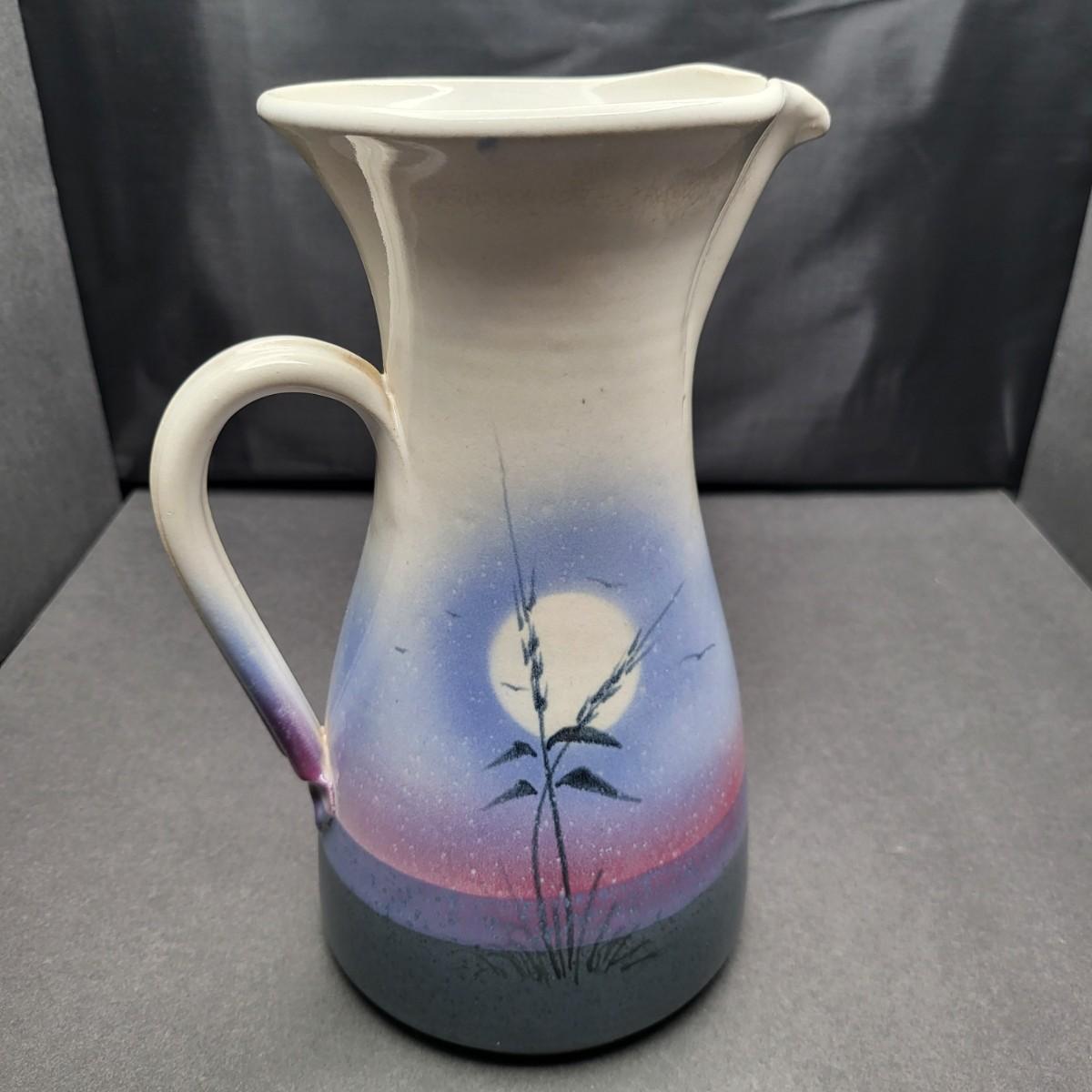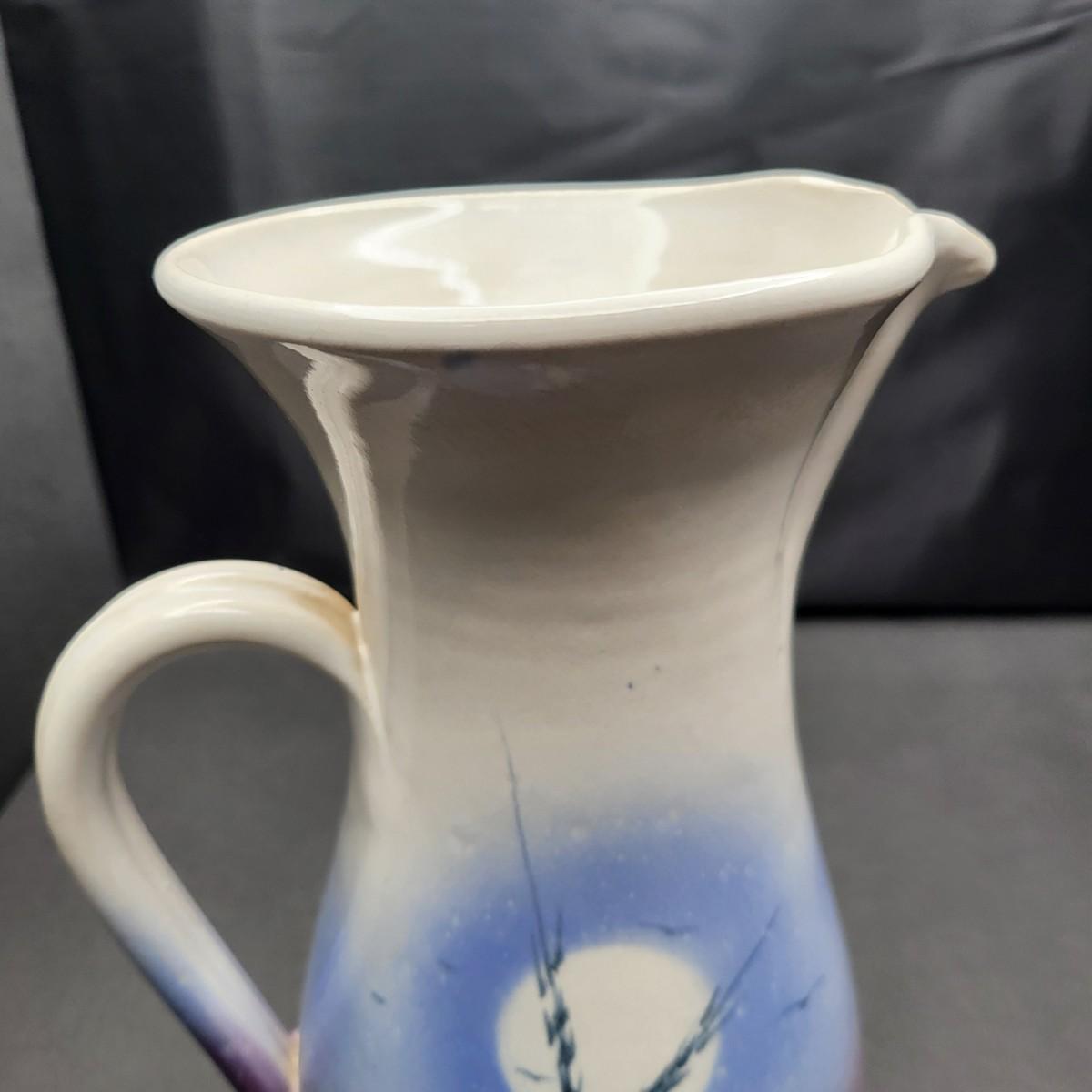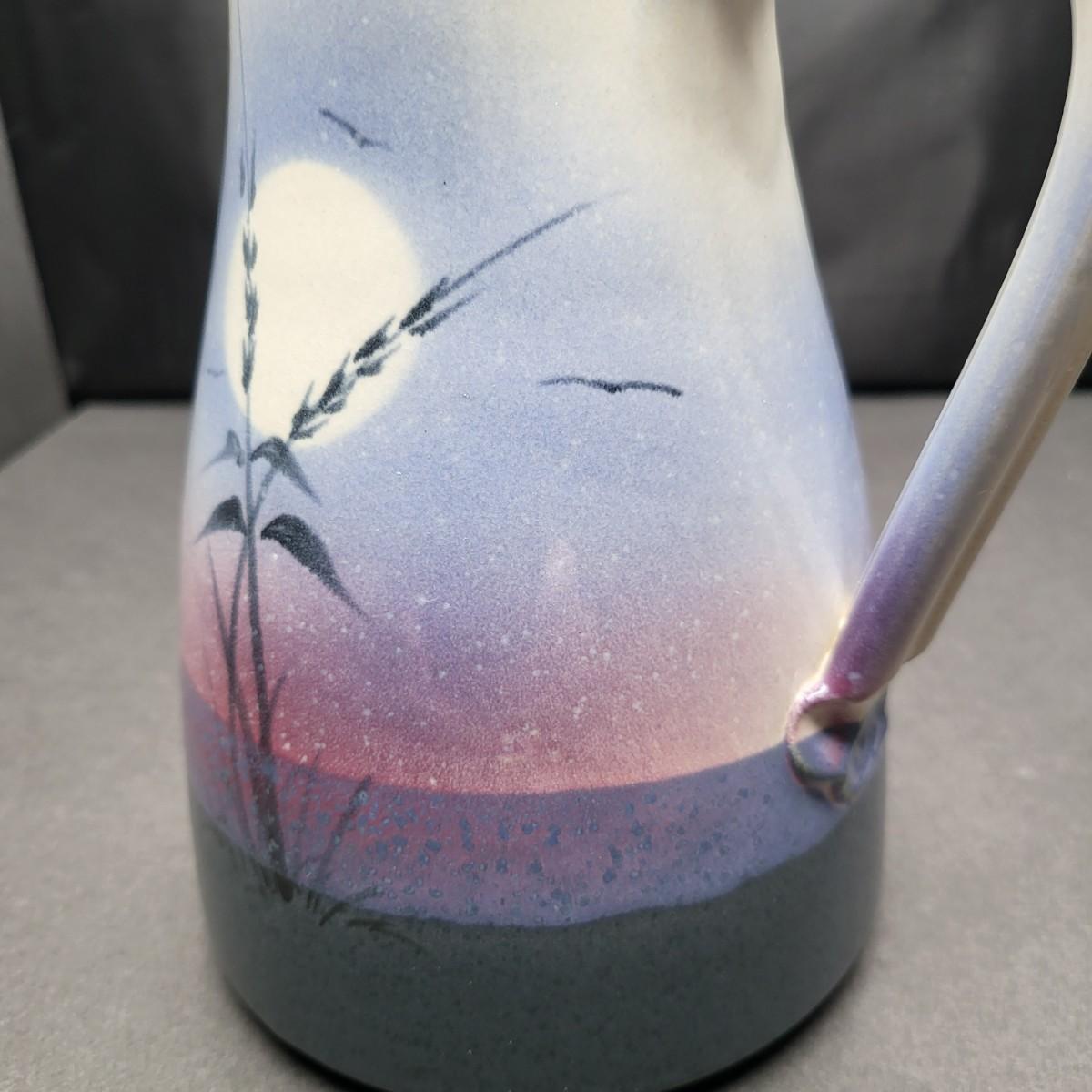 Birds, wheat grass setting sun setting, glazed in blues/purples 10" T x 4" W (at the top).