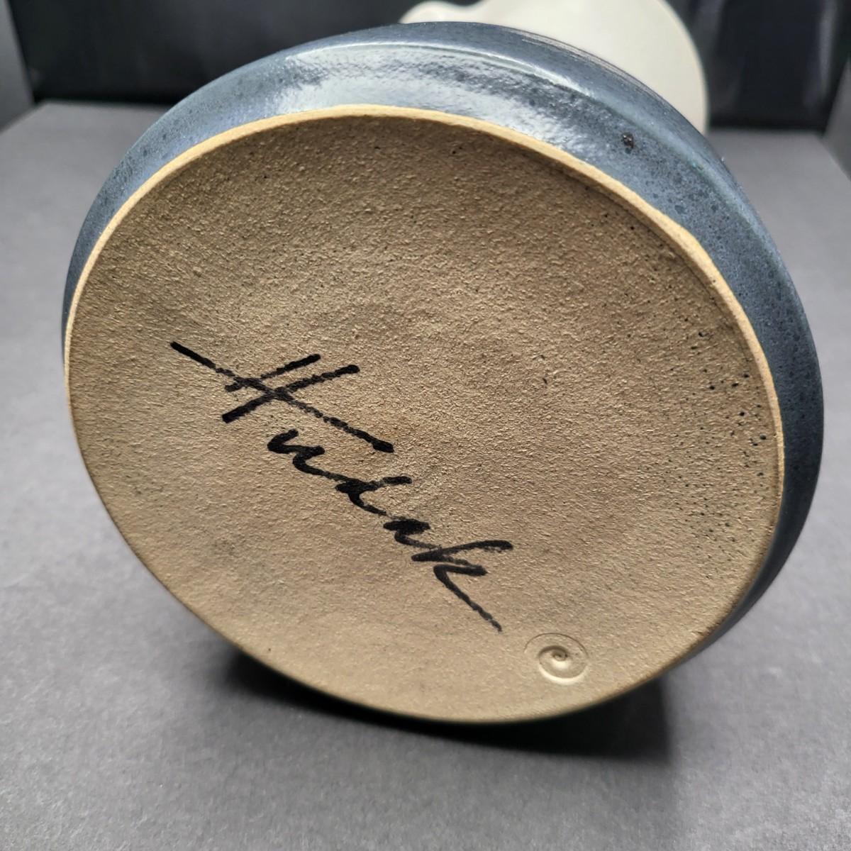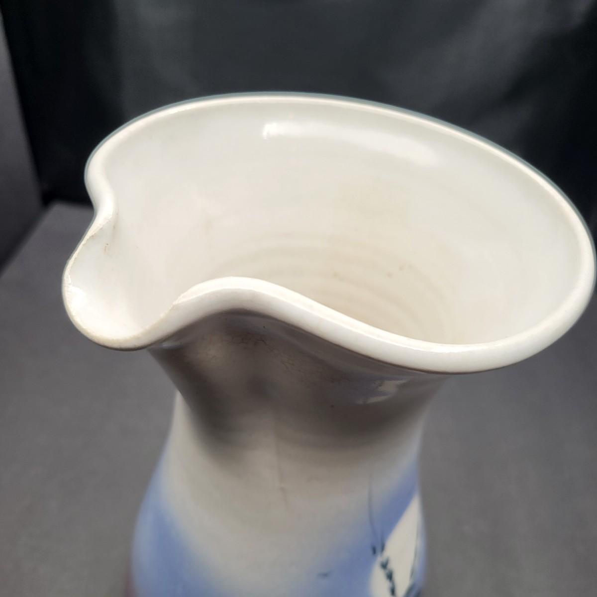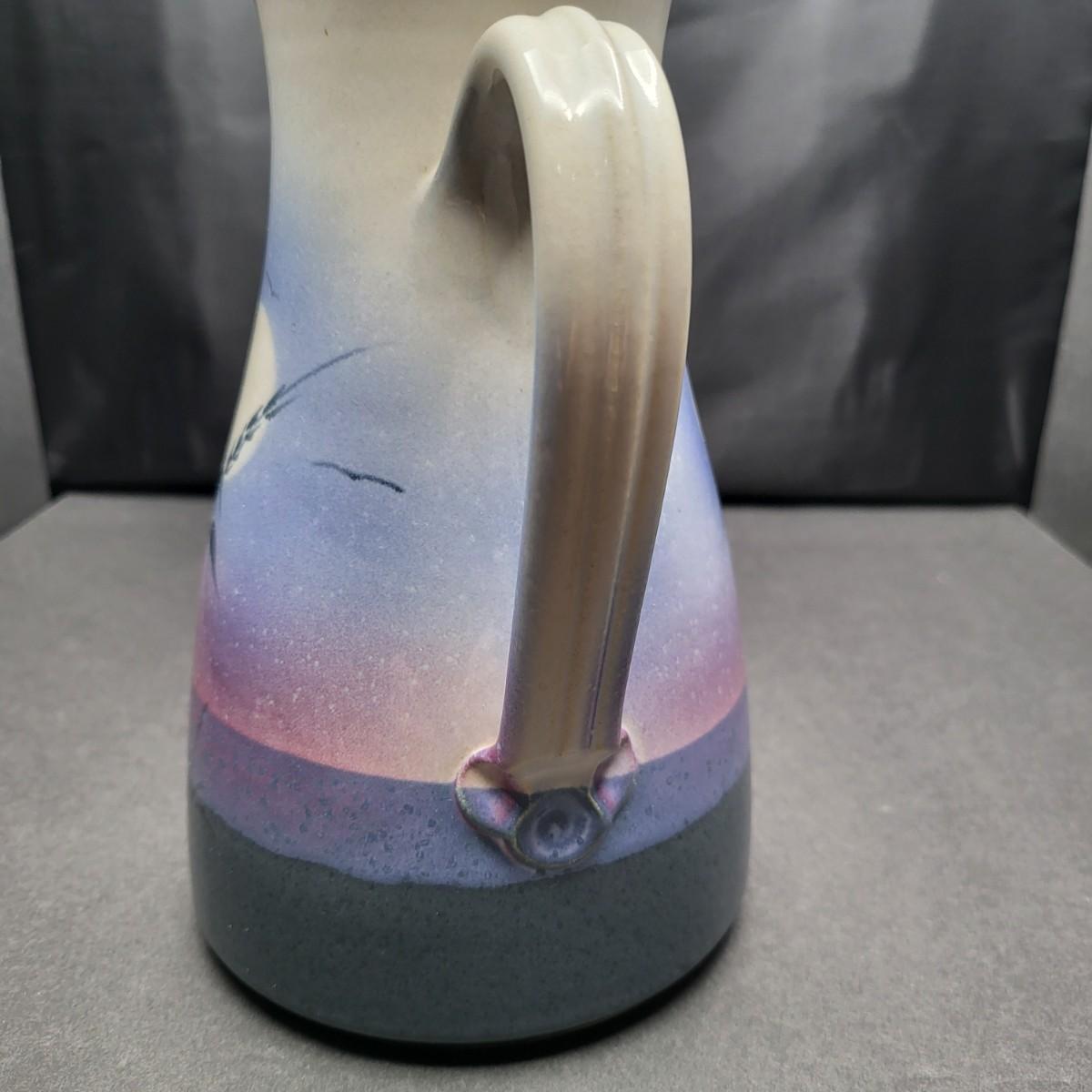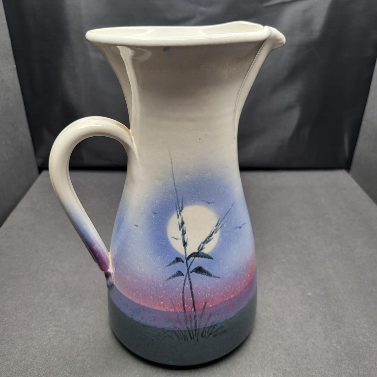 Birds, wheat grass setting sun setting, glazed in blues/purples 10" T x 4" W (at the top).