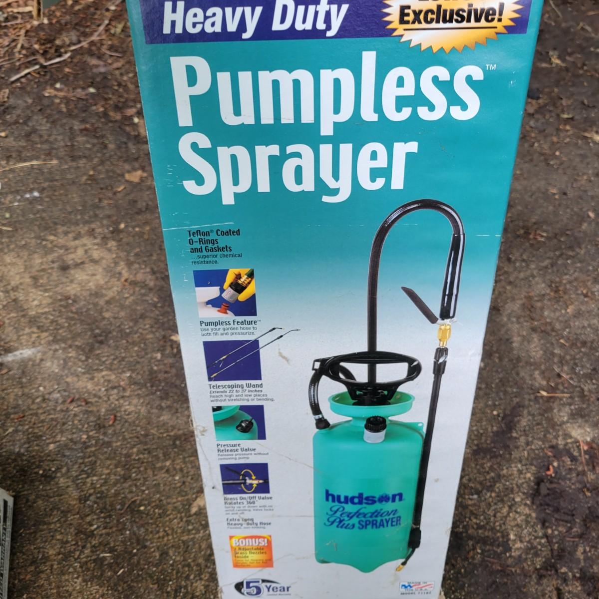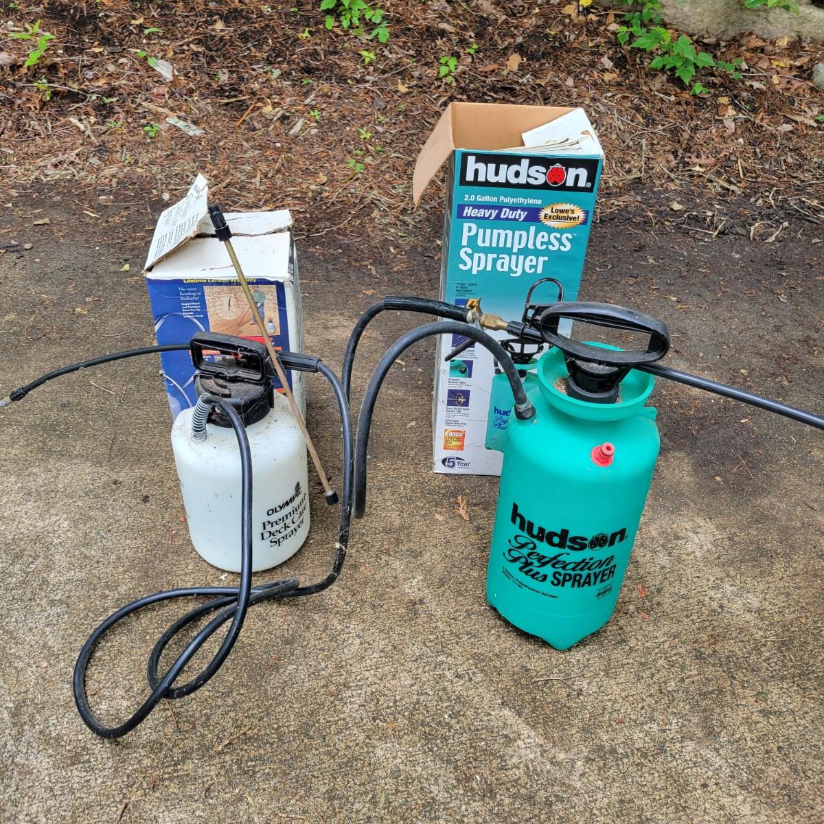 A pair of sprayers in their original packaging. One is a Hudson heavy duty pumpless sprayer with a two gallon capacity. The other is an Olympic premium deck care sprayer that comes 32" wand extender. Local pickup only.