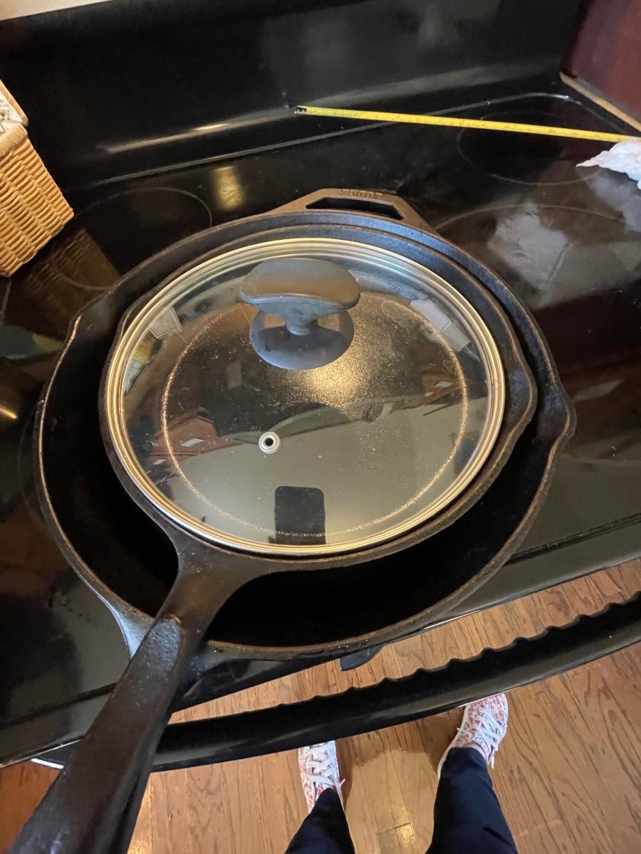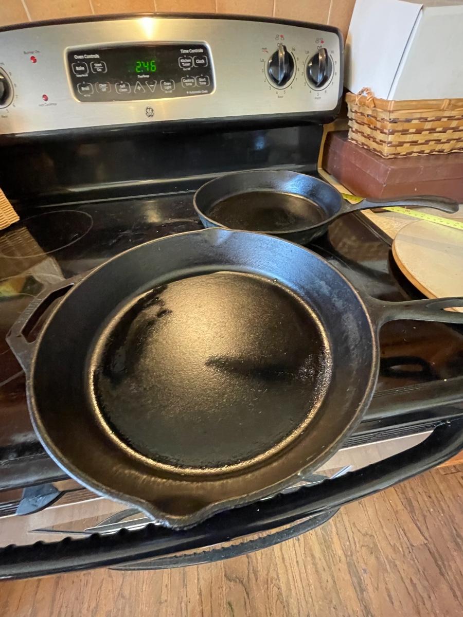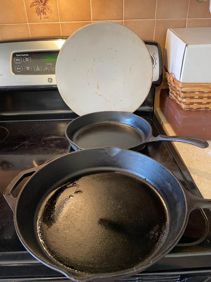 HUEY CHANG PIZZA STONE. TWO CAST IRON SKILLETS