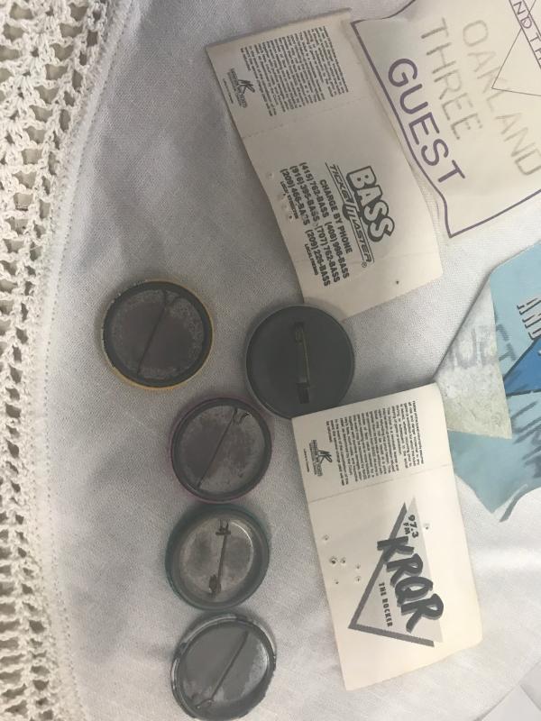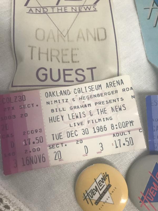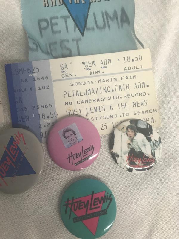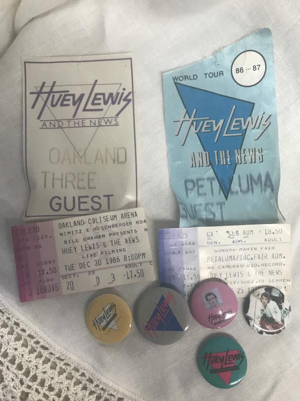 Huey Lewis fan collection - various pins, ticket stubs from 1986 Oakland and 1987 Petaluma concerts.
