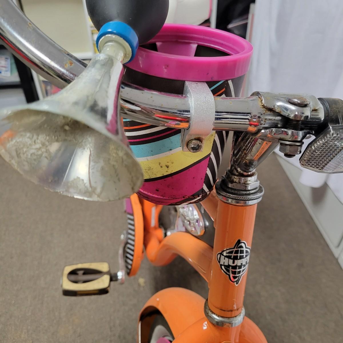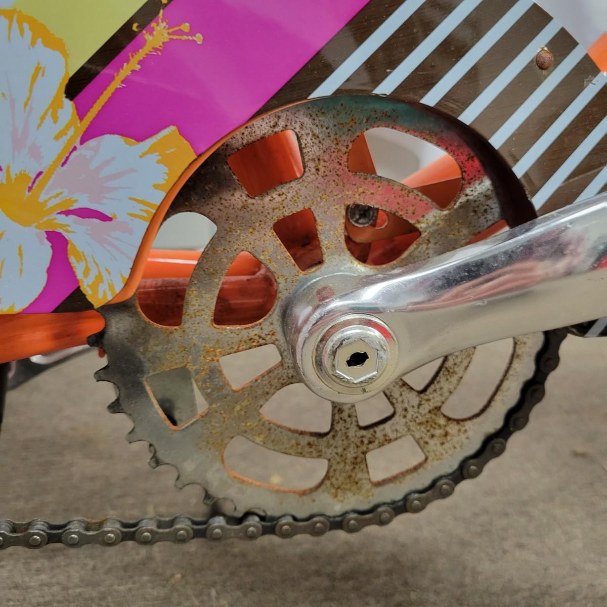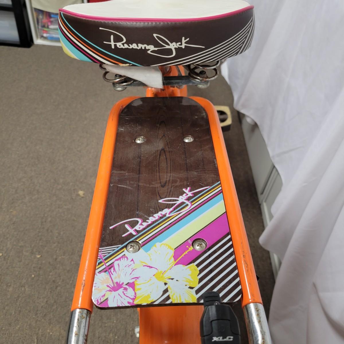 A Huffy, single speed beah cruiser with Panama Jack branding. This bicycle is made of steel, is a single speed and even has a bottle opener on the front fork. It does have flat tires and there is rust spots on the chromed items. Local pickup only
