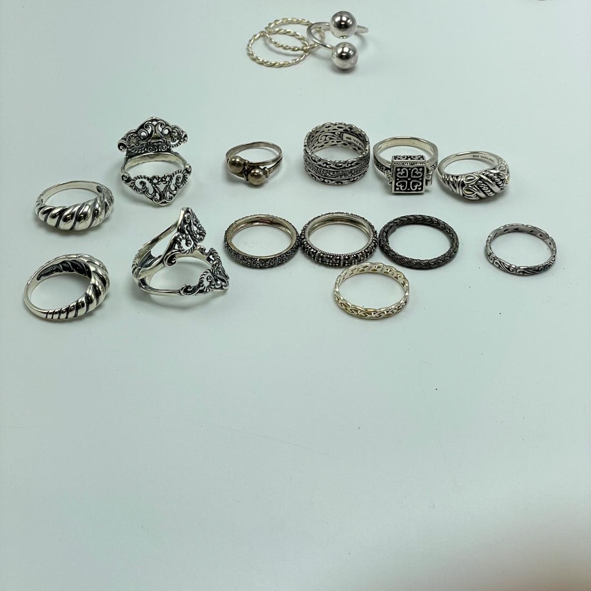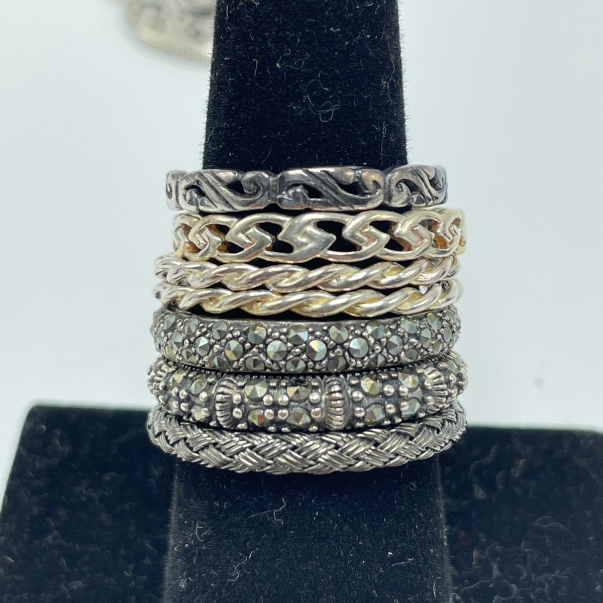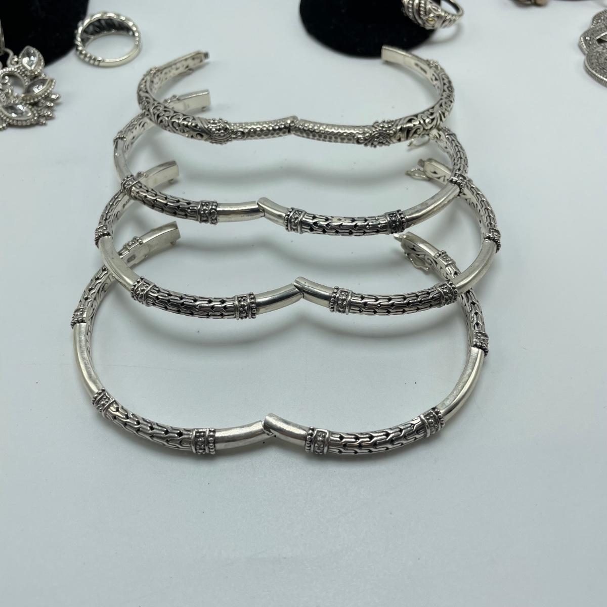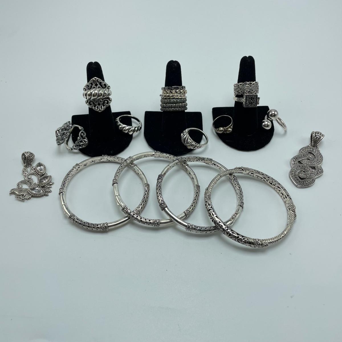 Two pendants and four 2.5”D hinged bracelets appear to be marked Sarda 925. Lot features 13 rings marked 925 and three more unmarked rings. One of the 925 rings is also stamped Jai 14K and appears to have golden accents with the silver design. Many of the rings are marked Sarda as well. See images for markings and sizes. Rings will look great by themselves, but most can be stacked in a variety of styles. Please see photos for all markings found. Starting bid is at or near melt value. All sales are final. No returns or refunds. Please bid accordingly.