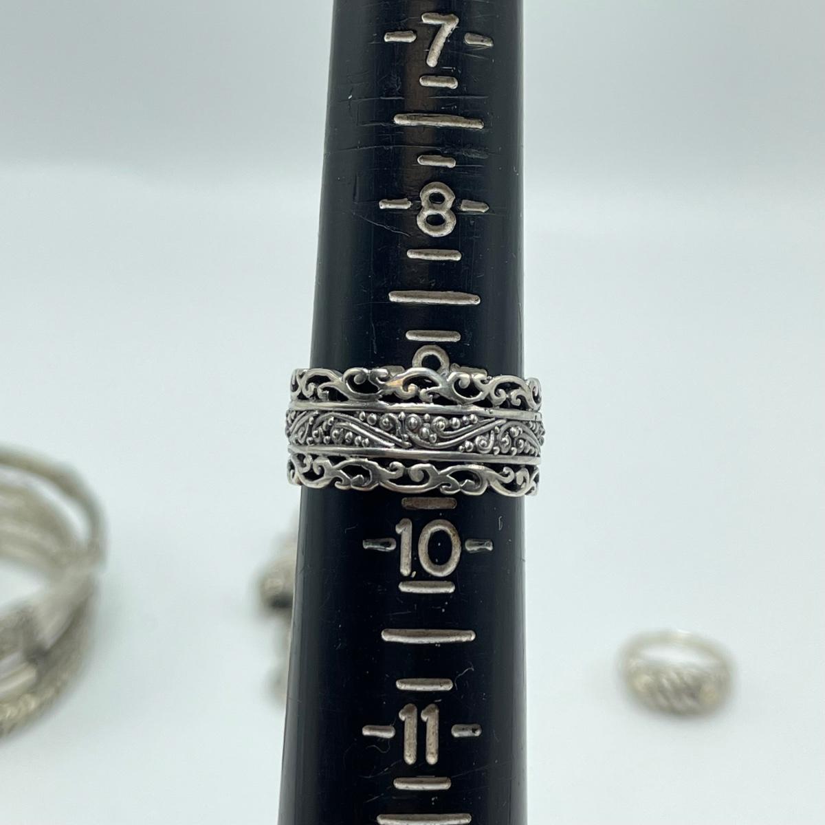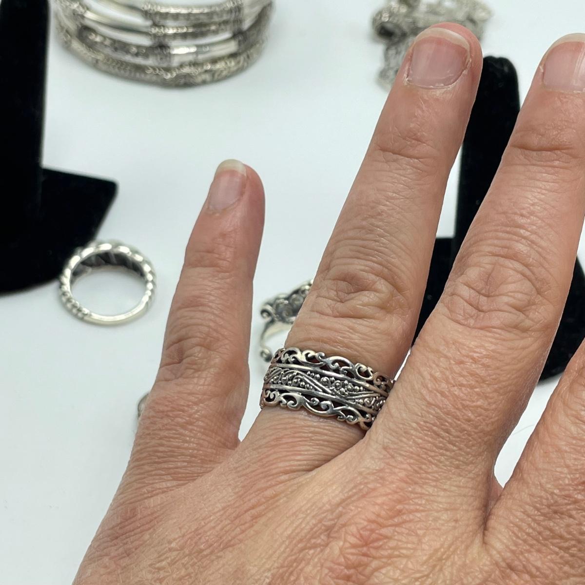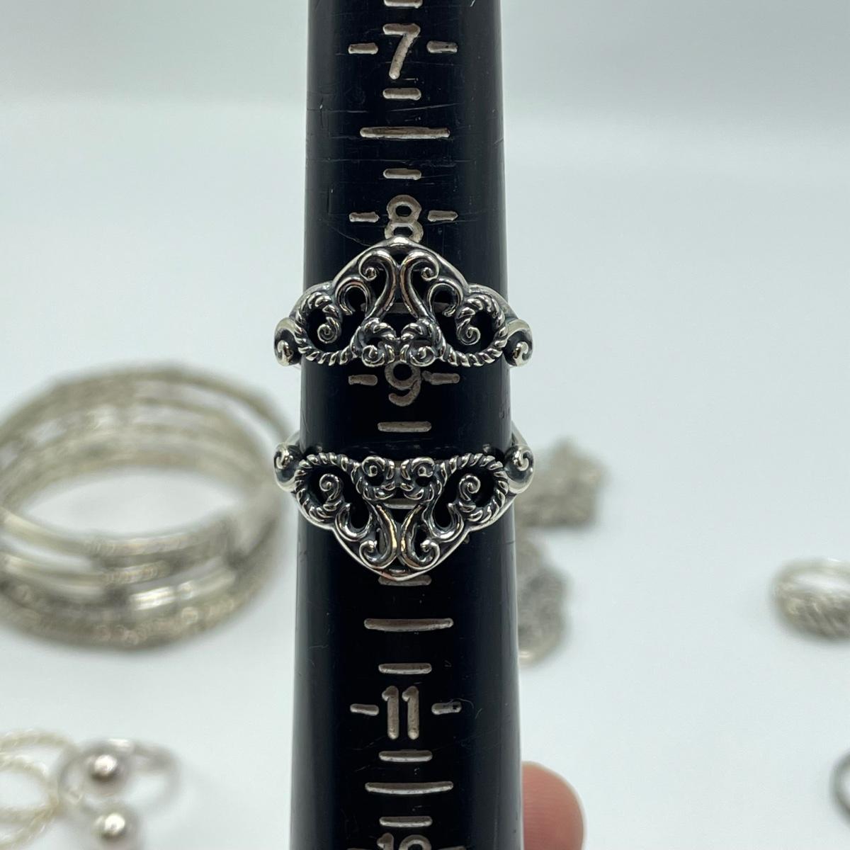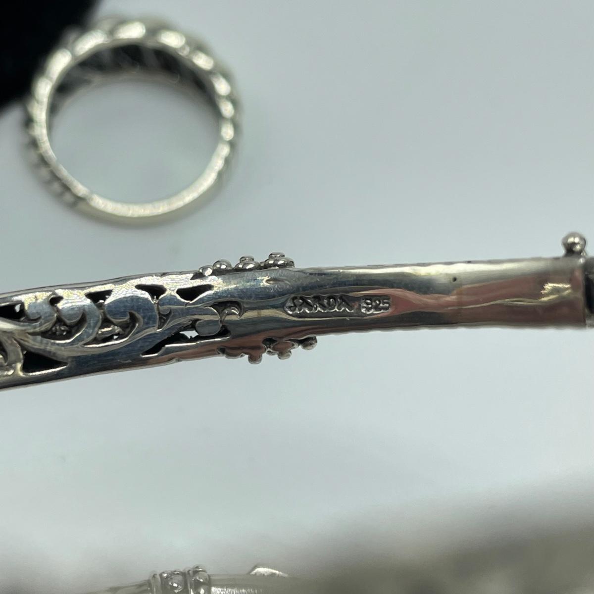 Two pendants and four 2.5”D hinged bracelets appear to be marked Sarda 925. Lot features 13 rings marked 925 and three more unmarked rings. One of the 925 rings is also stamped Jai 14K and appears to have golden accents with the silver design. Many of the rings are marked Sarda as well. See images for markings and sizes. Rings will look great by themselves, but most can be stacked in a variety of styles. Please see photos for all markings found. Starting bid is at or near melt value. All sales are final. No returns or refunds. Please bid accordingly.