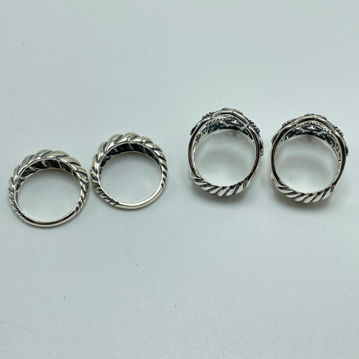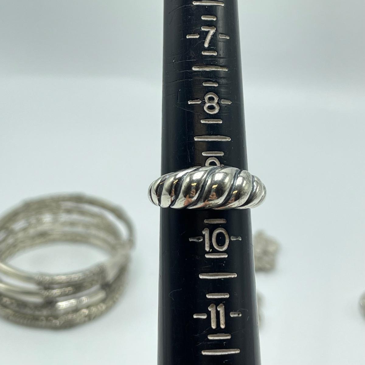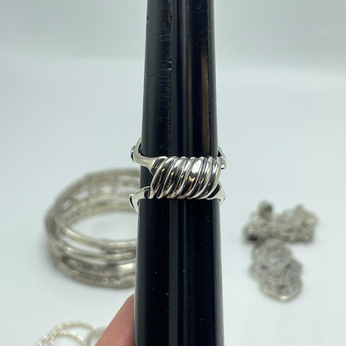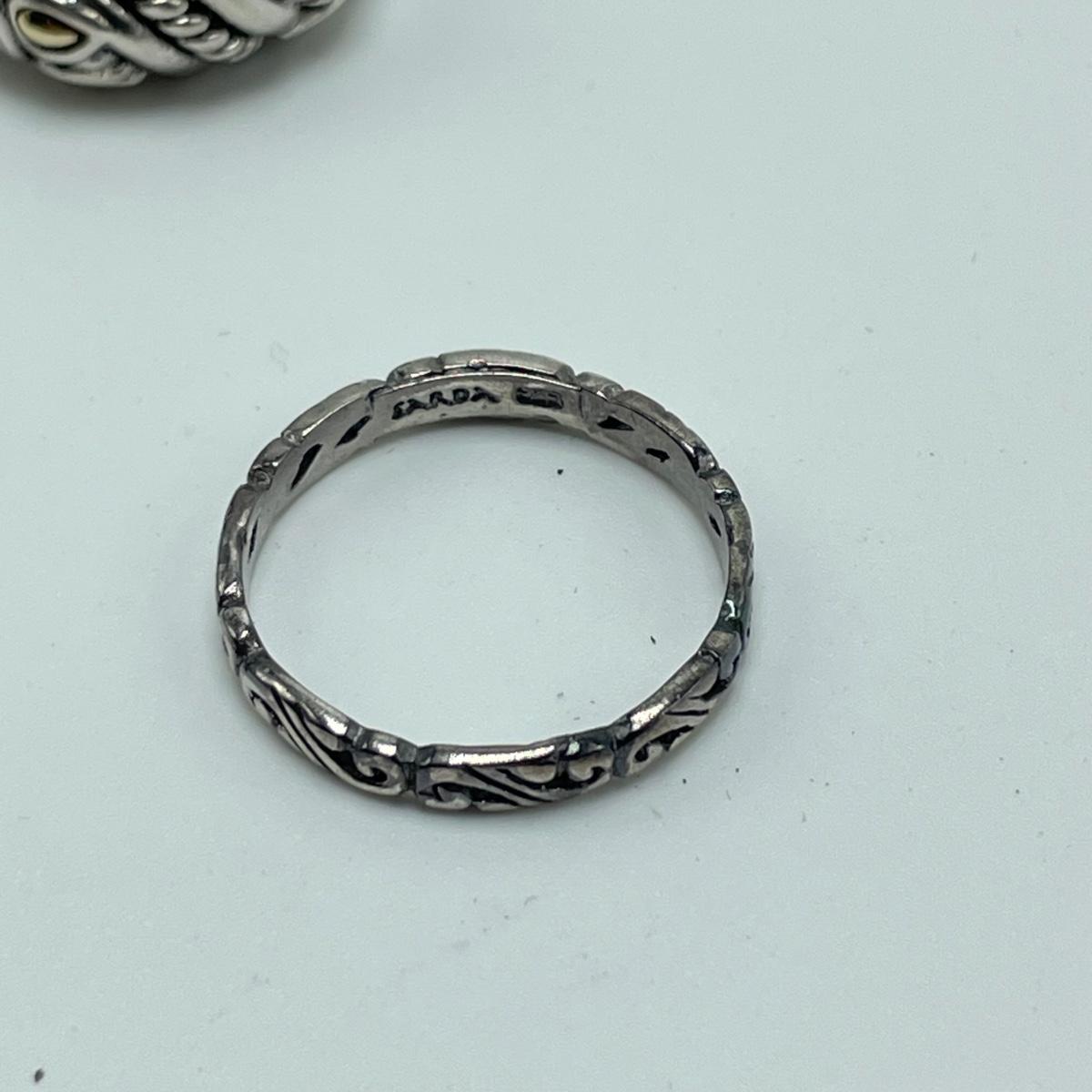 Two pendants and four 2.5”D hinged bracelets appear to be marked Sarda 925. Lot features 13 rings marked 925 and three more unmarked rings. One of the 925 rings is also stamped Jai 14K and appears to have golden accents with the silver design. Many of the rings are marked Sarda as well. See images for markings and sizes. Rings will look great by themselves, but most can be stacked in a variety of styles. Please see photos for all markings found. Starting bid is at or near melt value. All sales are final. No returns or refunds. Please bid accordingly.