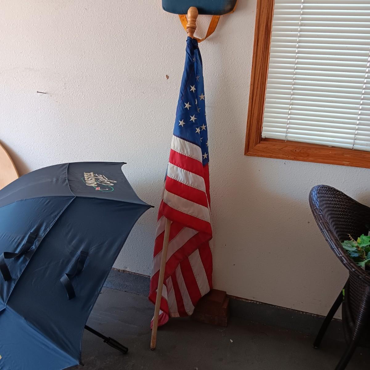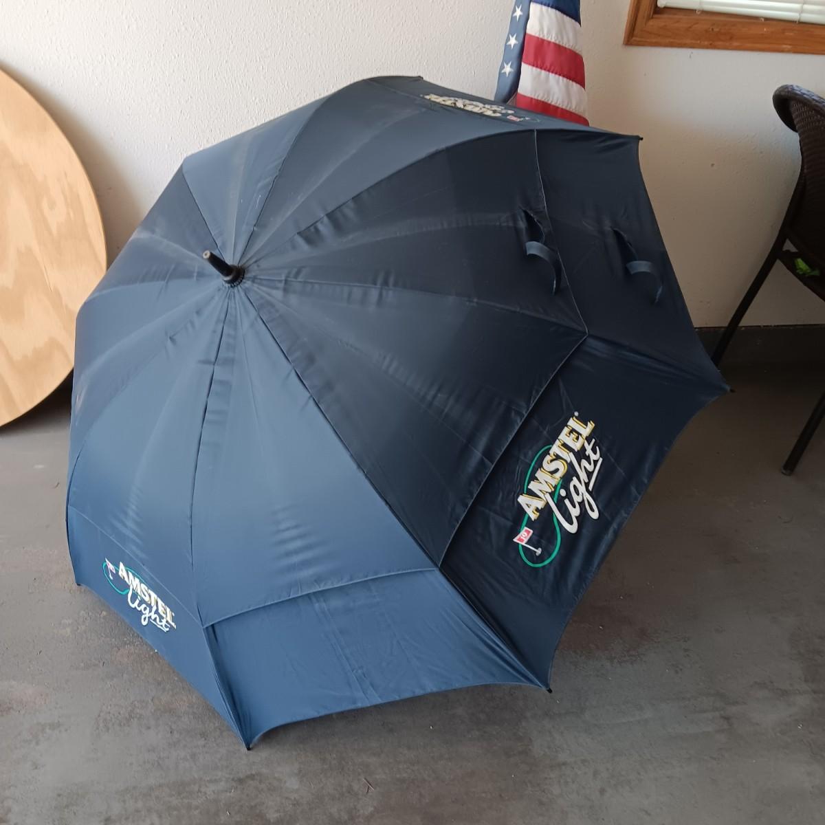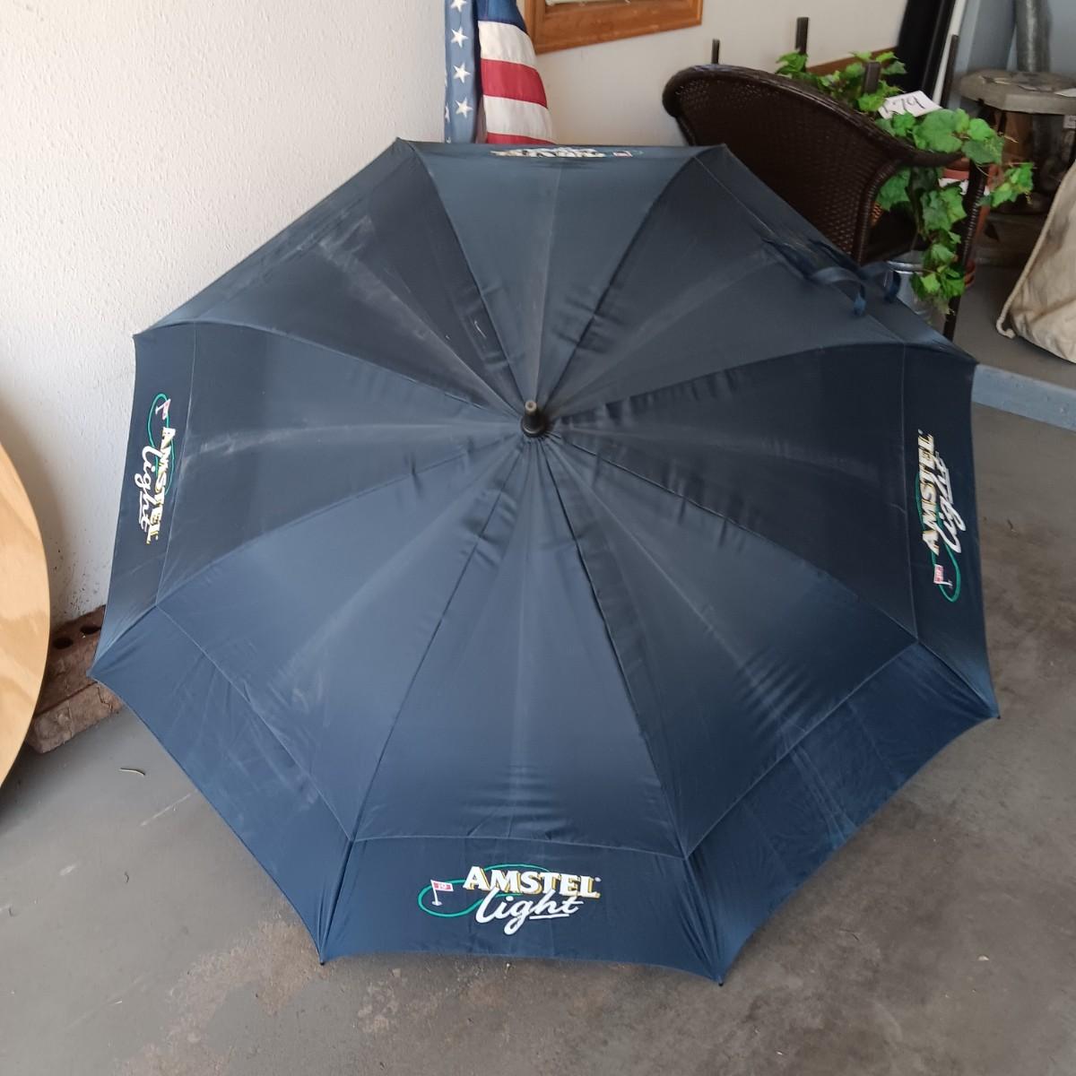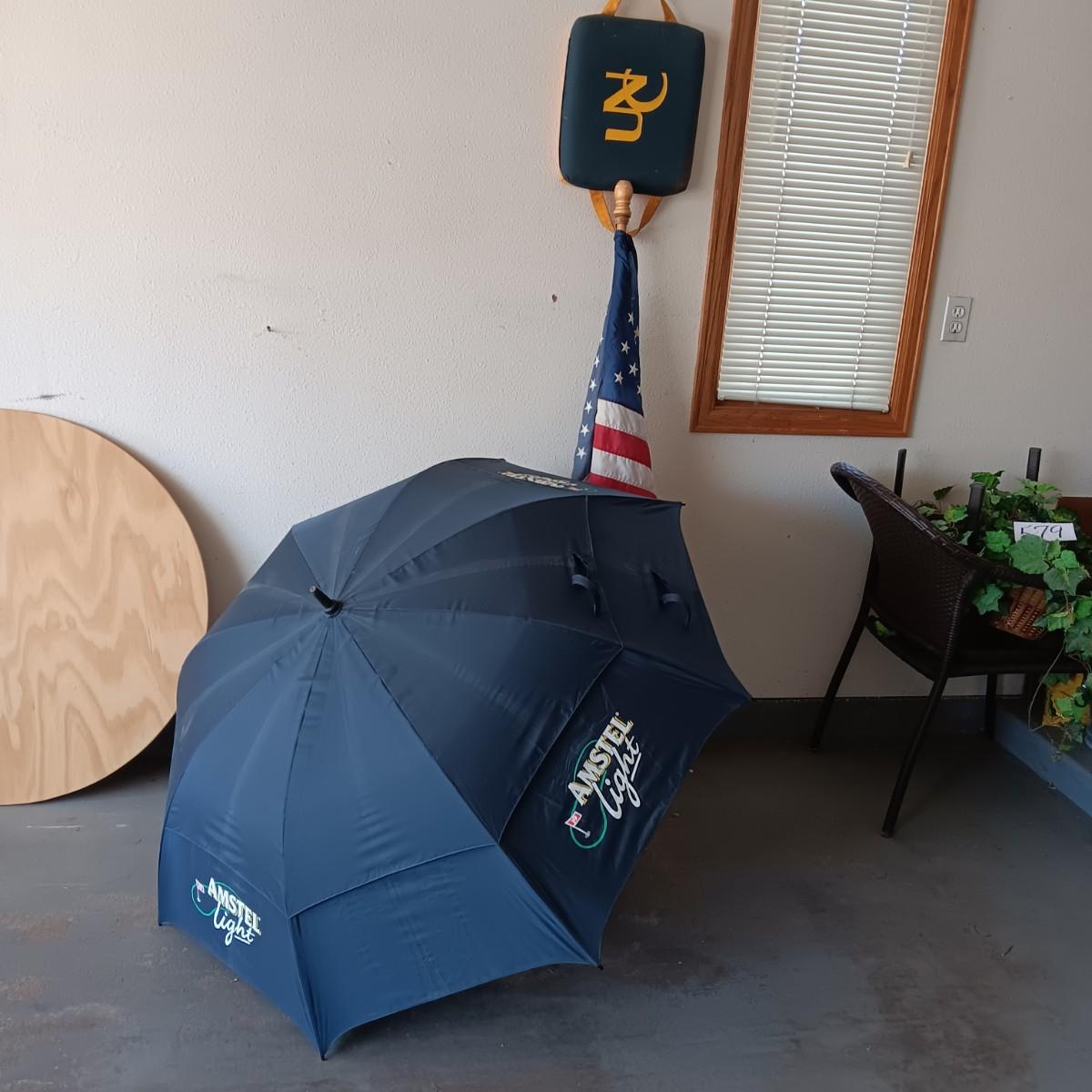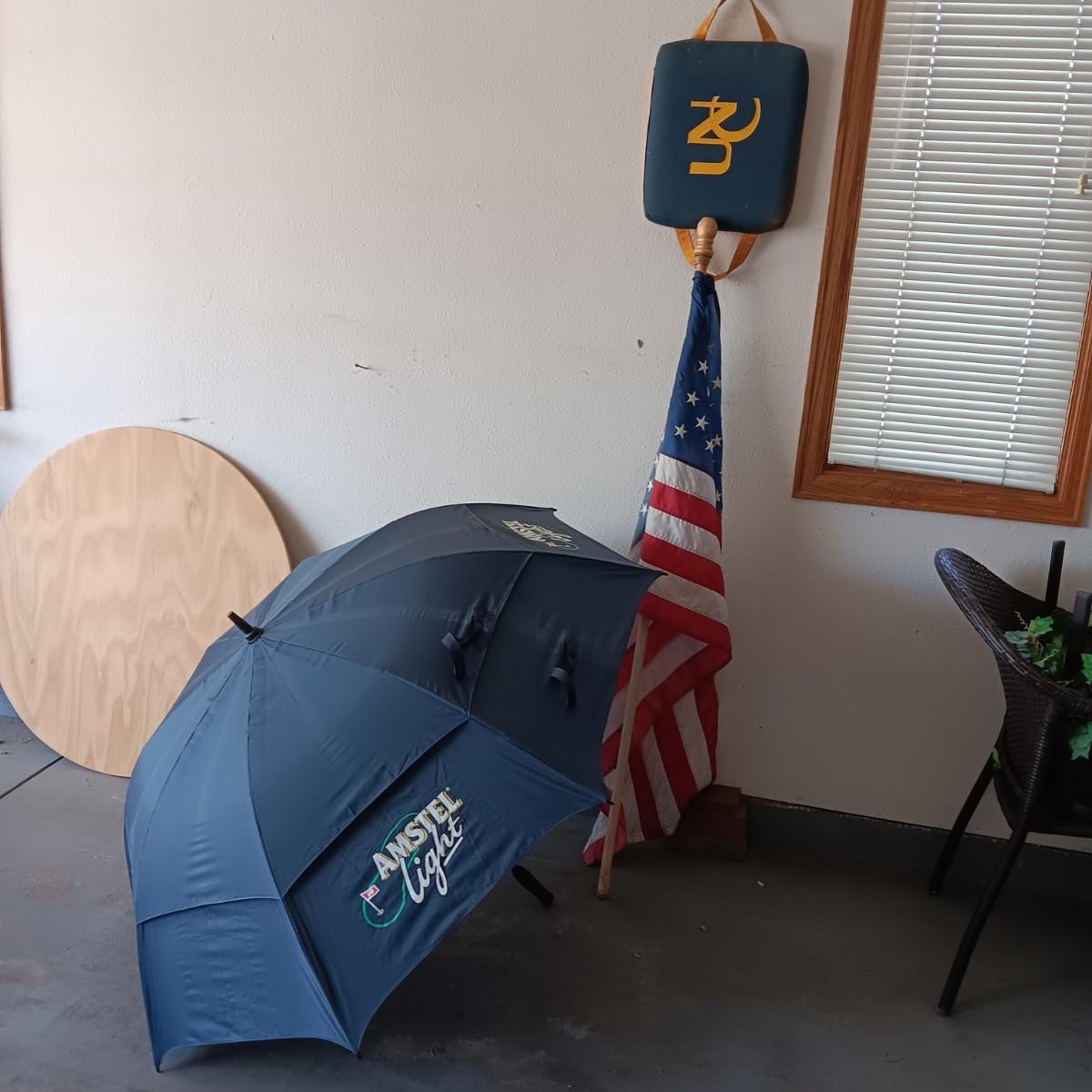 HUGE AMSTEL LIGHT UMBRELLA, US FLAG ON POLE AND A UNC BLEACHER CUSHION
