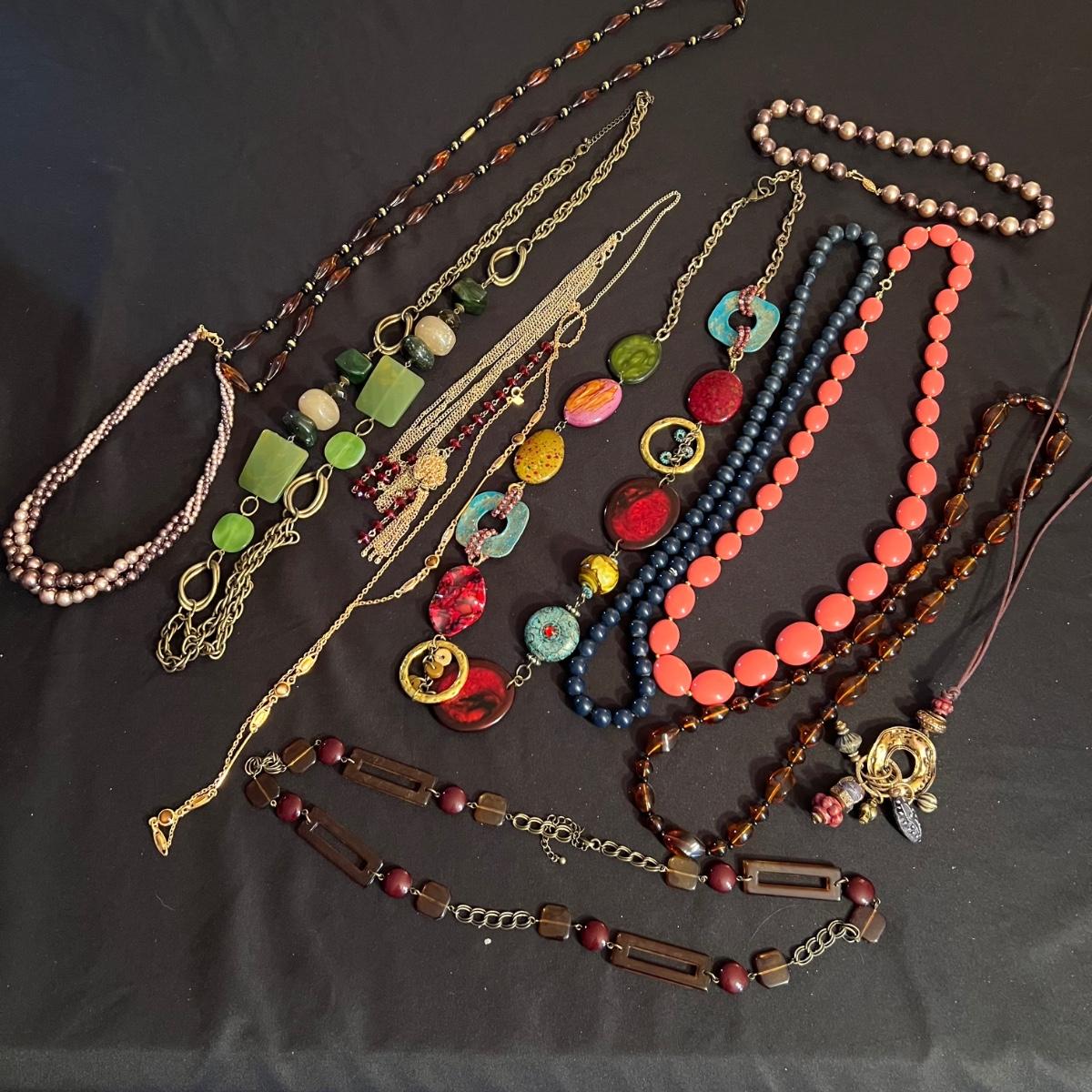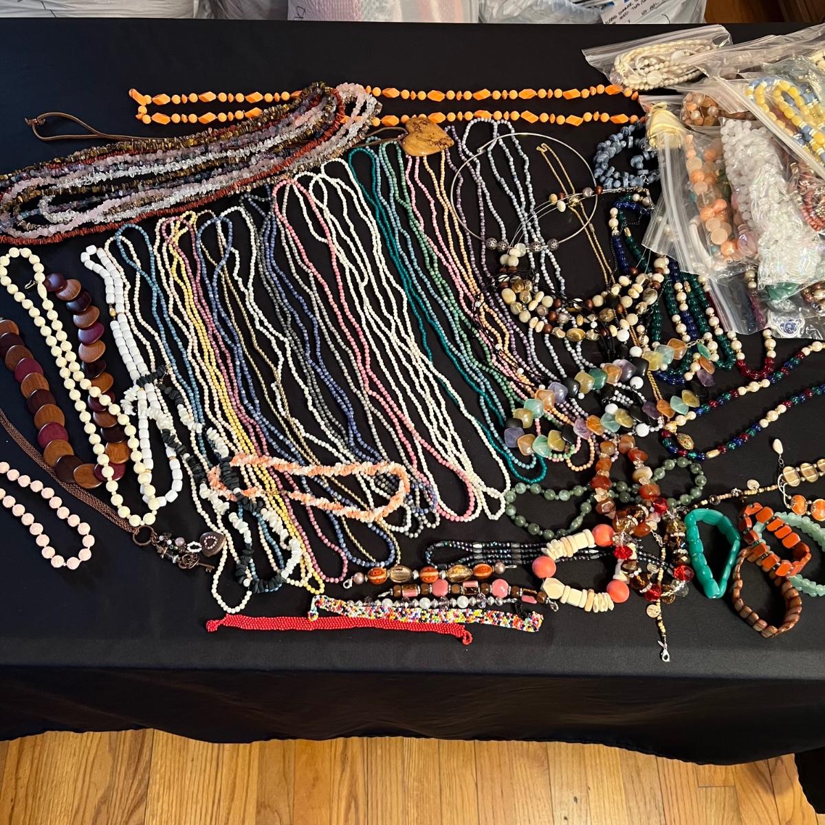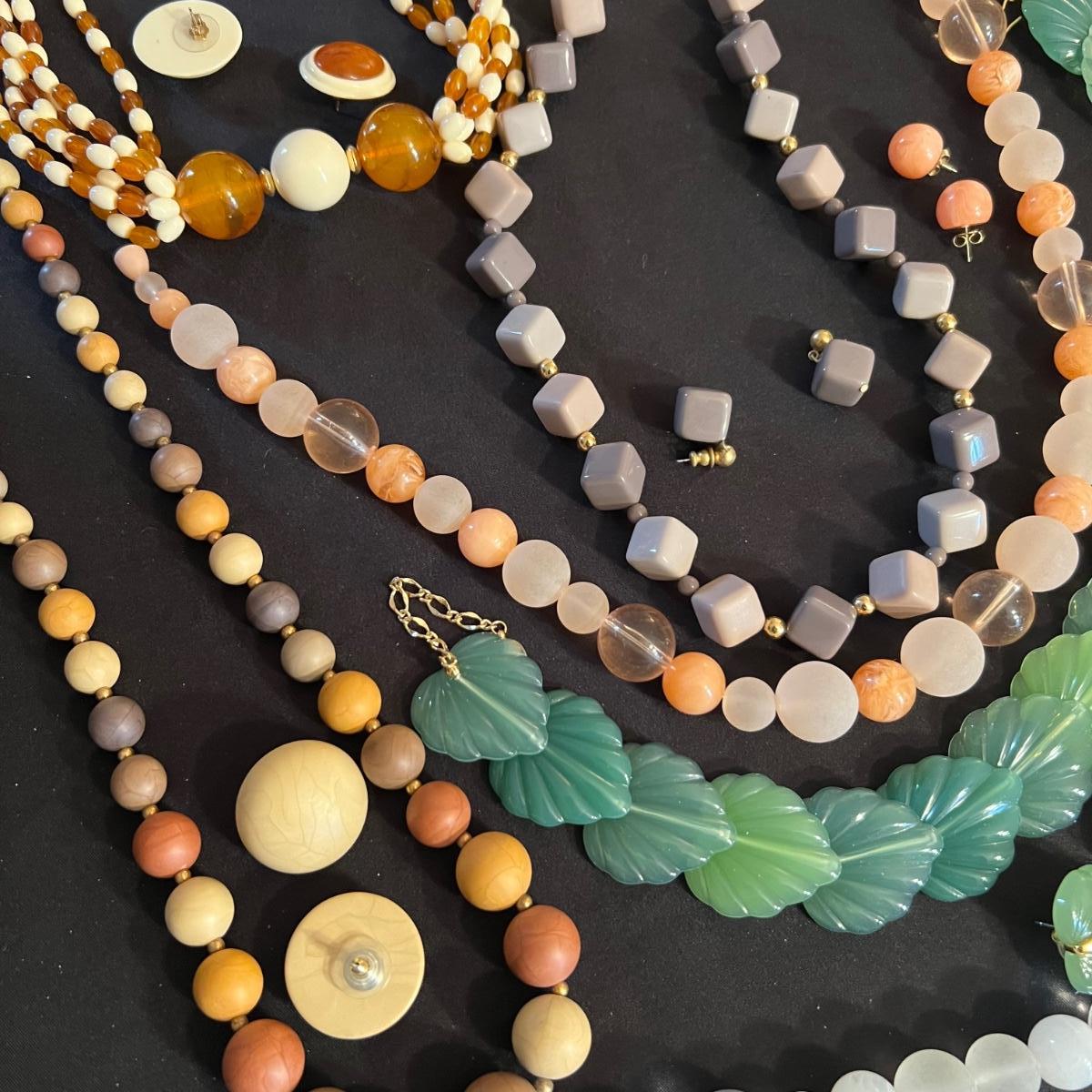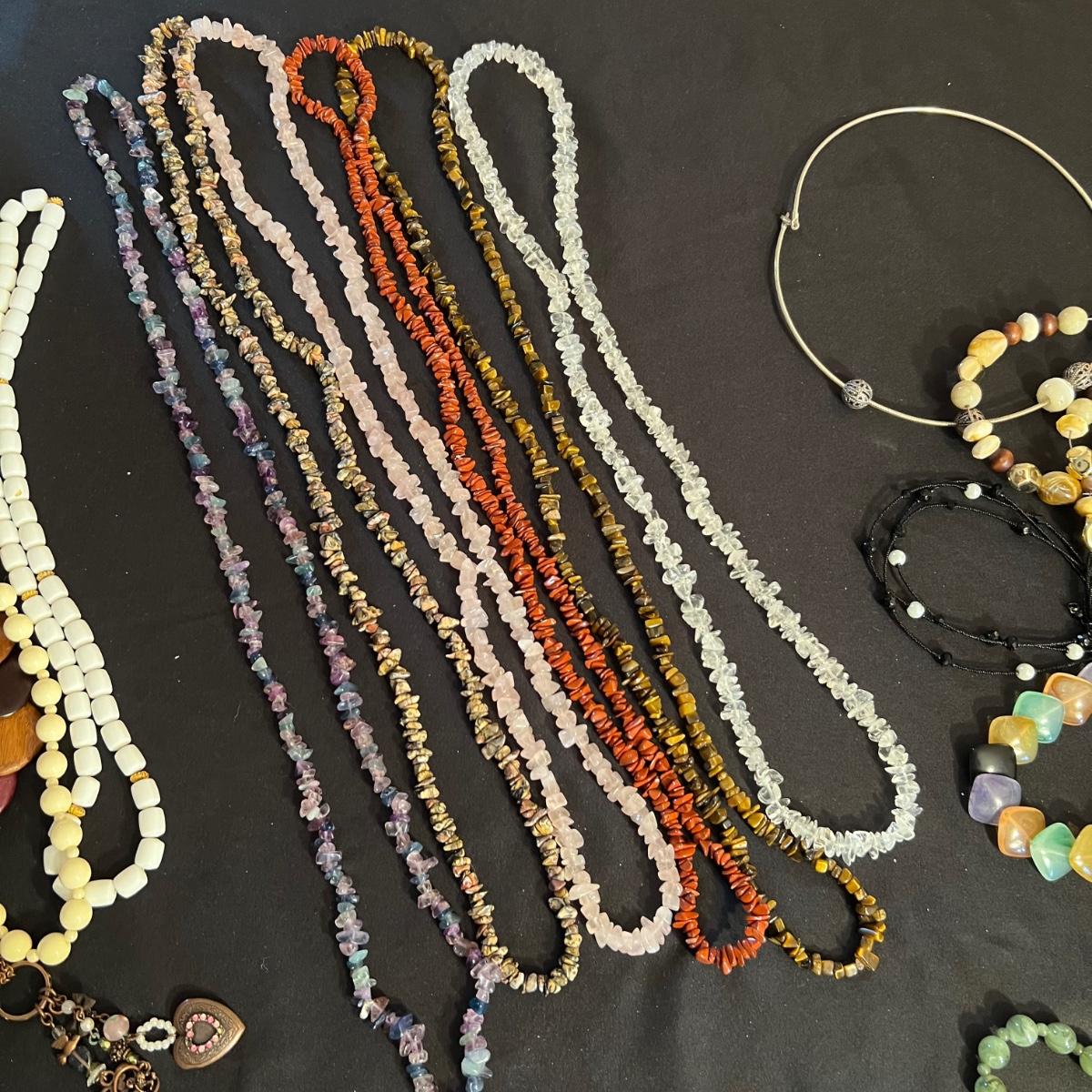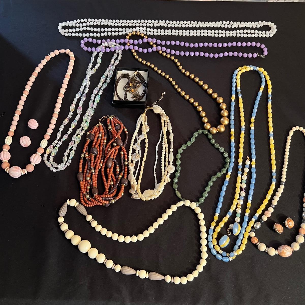 This huge lot includes in excess of 100 necklaces and 15 bracelets plus over 10 jewelry sets that include either earrings (both clip-on and posts for pierced ears) or bracelets. See images for full inventory. All items appear to be a mix of mostly plastic beads and faux stone with all lengths included from choker to very long; one of the longest chains is pictured with tape measure.